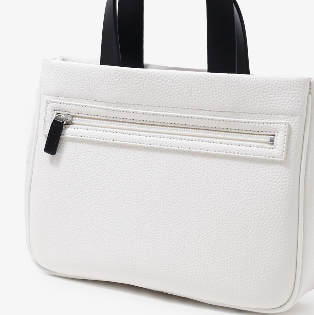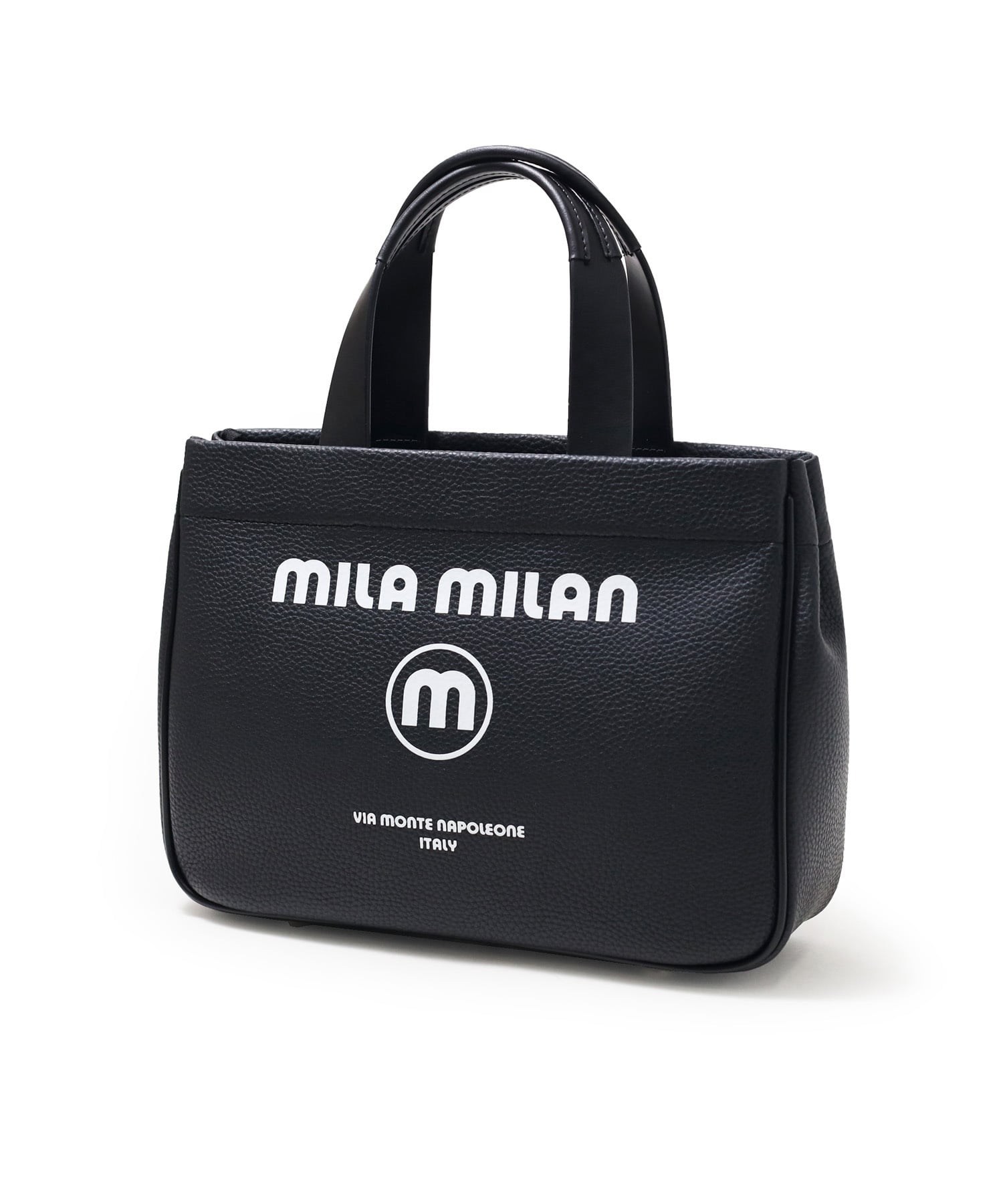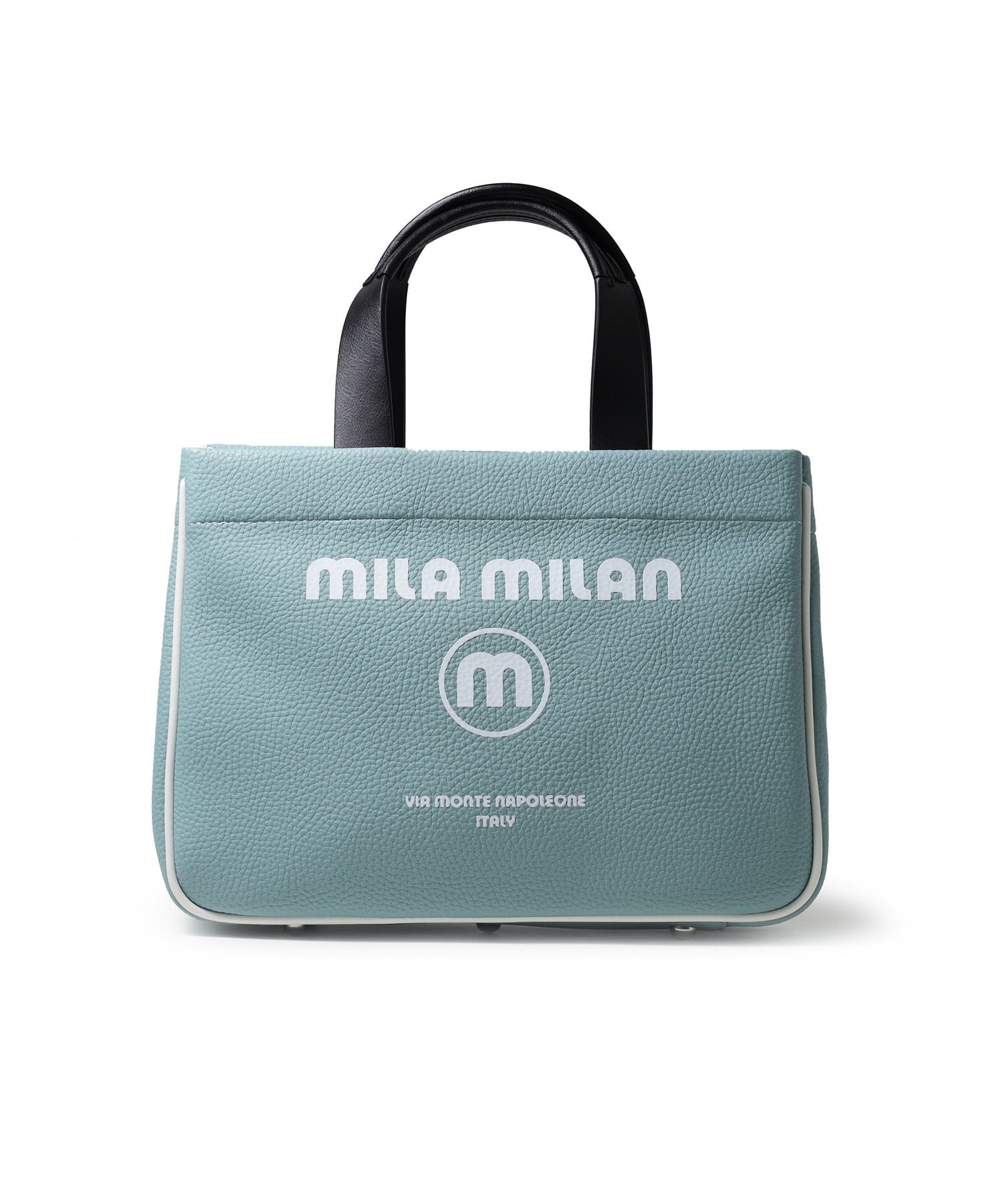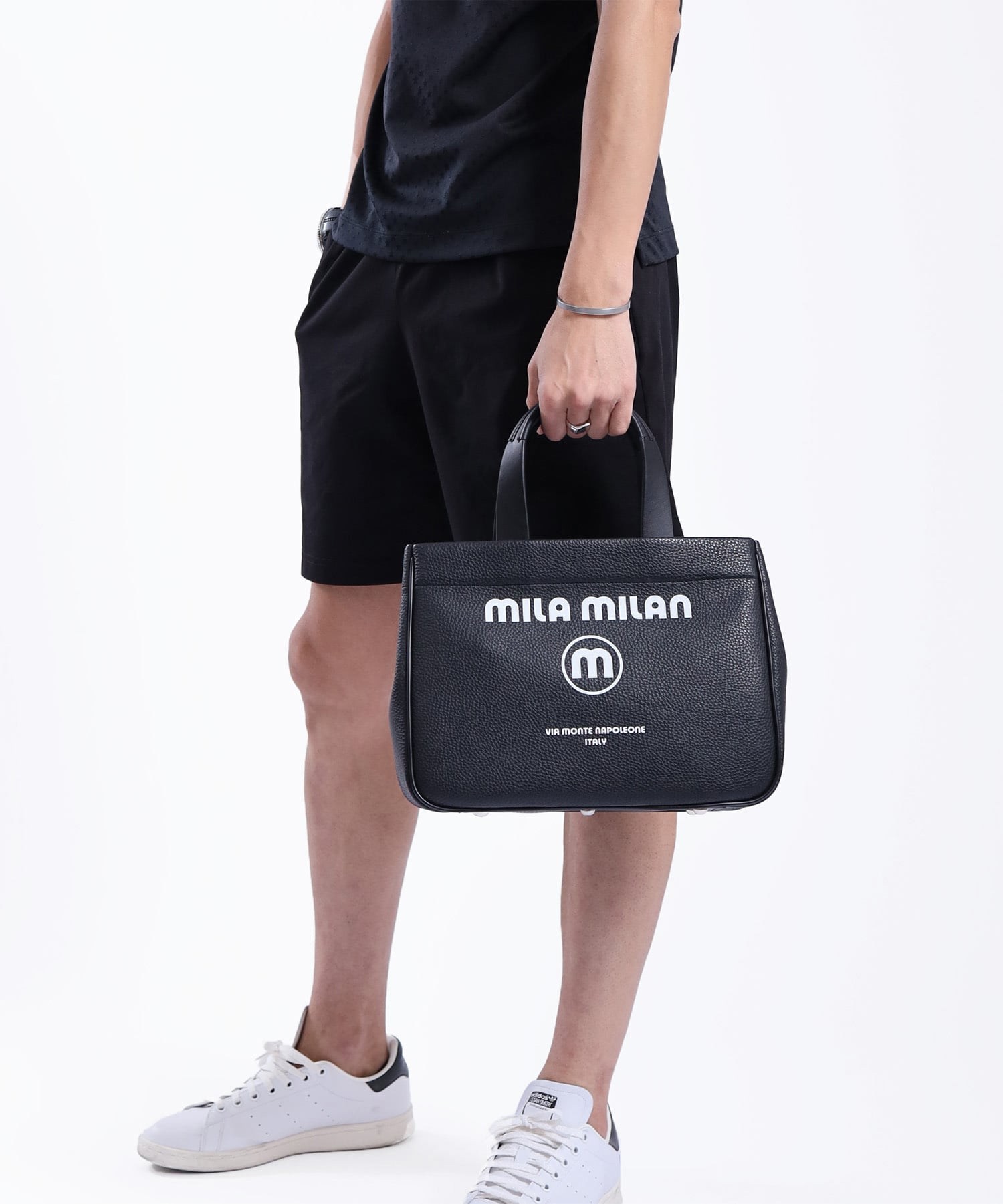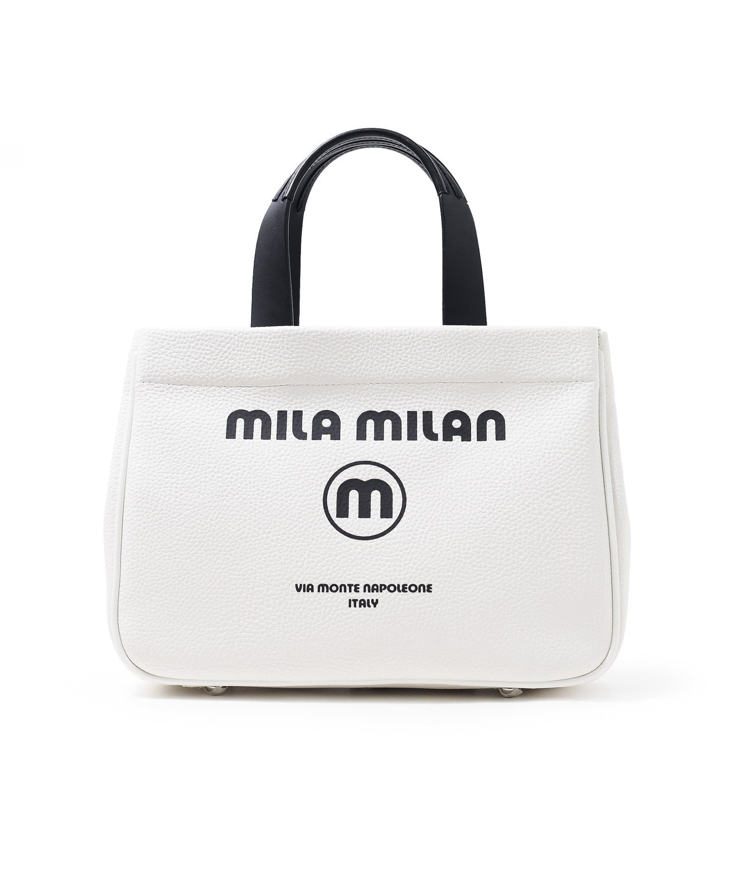 モノトーン調にブランドロゴがポイントのミラ・ミランのカジュアルミニトートバッグ。普段使いから、ゴルフや旅行等様々なシーンでお使いいただけるミニサイズトートです。本体生地は防水機能のあるPVCを使用しております。一見シンプルなトートに見えますが、内装にはブランドイメージのストライプ柄を施すなどのこだわりも。男性、女性どちらもお使いいただけるバッグです。
