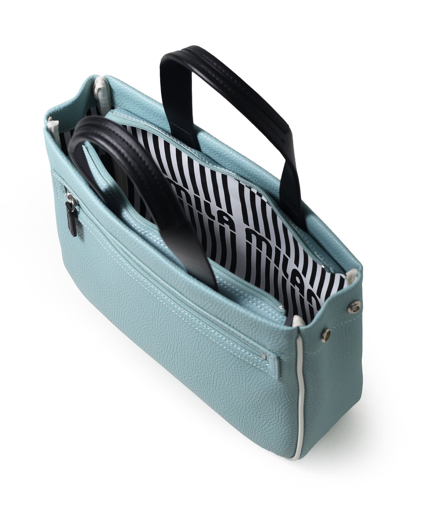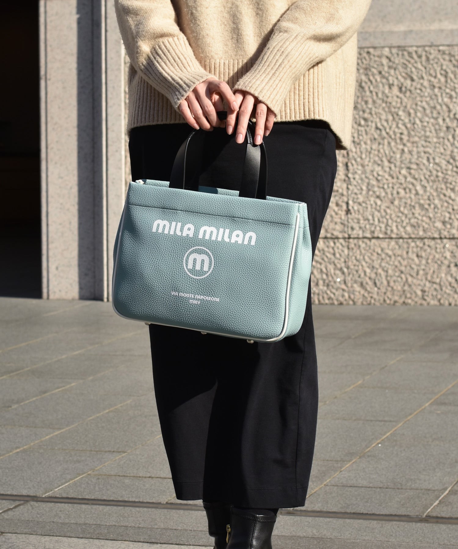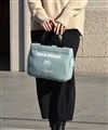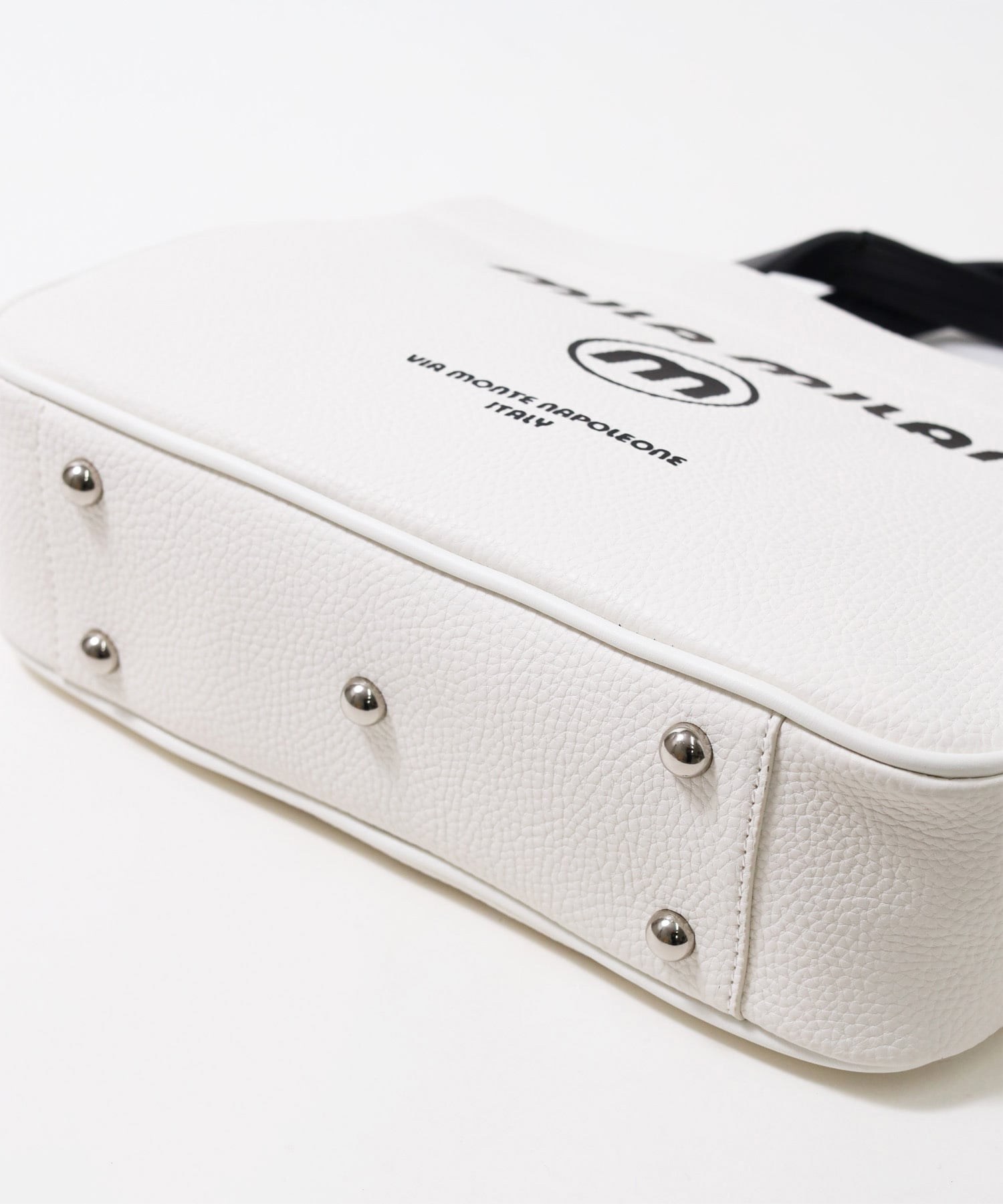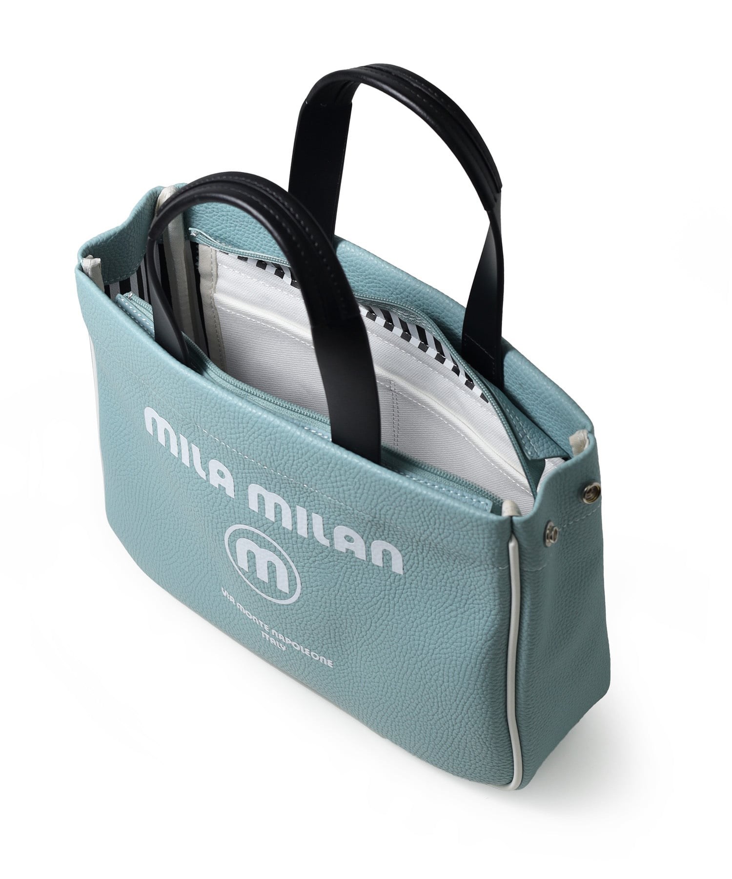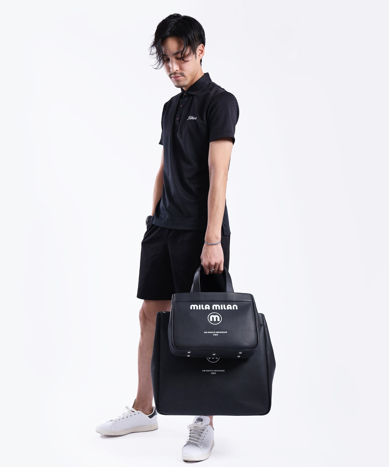 モノトーン調にブランドロゴがポイントのミラ・ミランのカジュアルミニトートバッグ。普段使いから、ゴルフや旅行等様々なシーンでお使いいただけるミニサイズトートです。本体生地は防水機能のあるPVCを使用しております。一見シンプルなトートに見えますが、内装にはブランドイメージのストライプ柄を施すなどのこだわりも。男性、女性どちらもお使いいただけるバッグです。