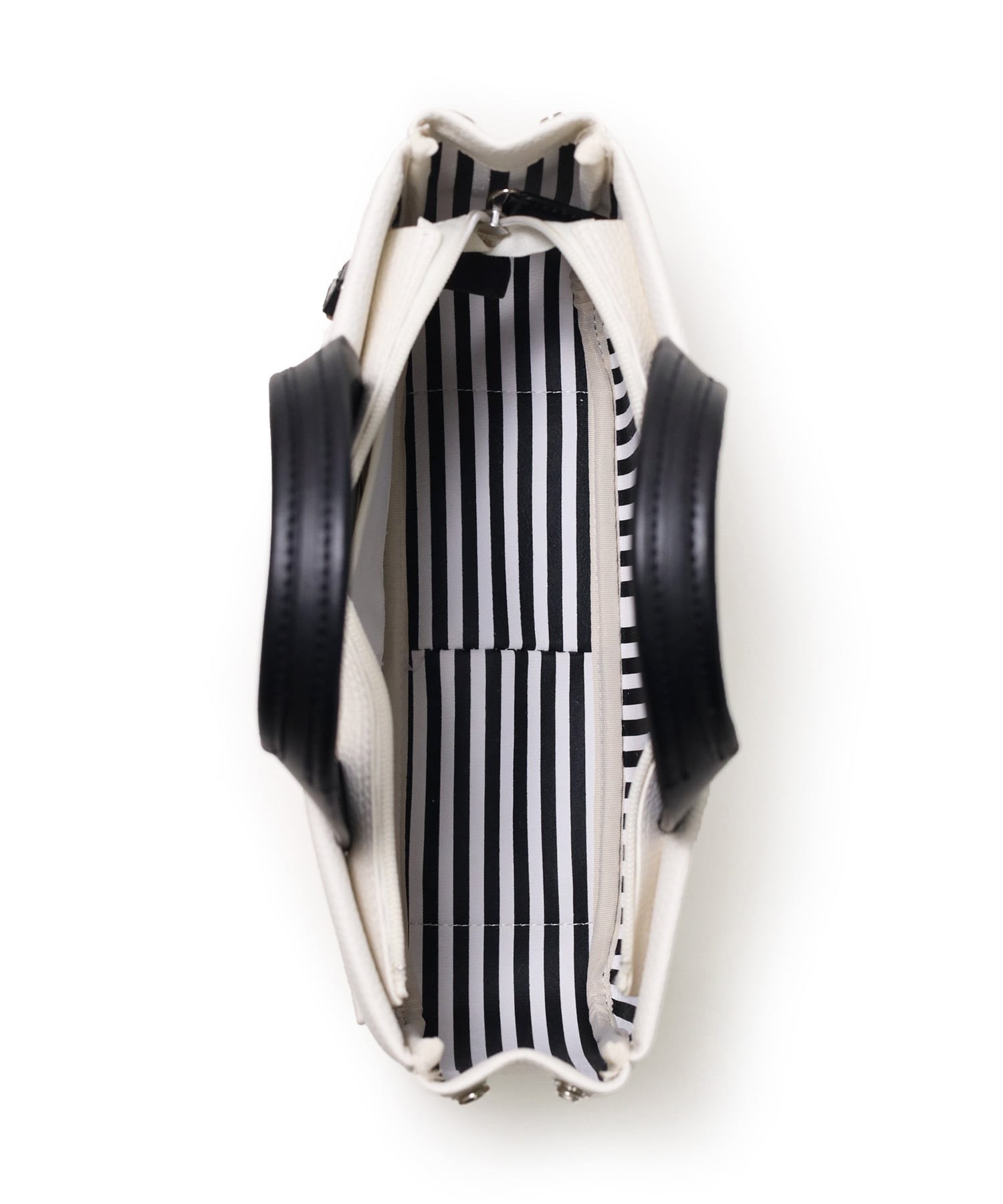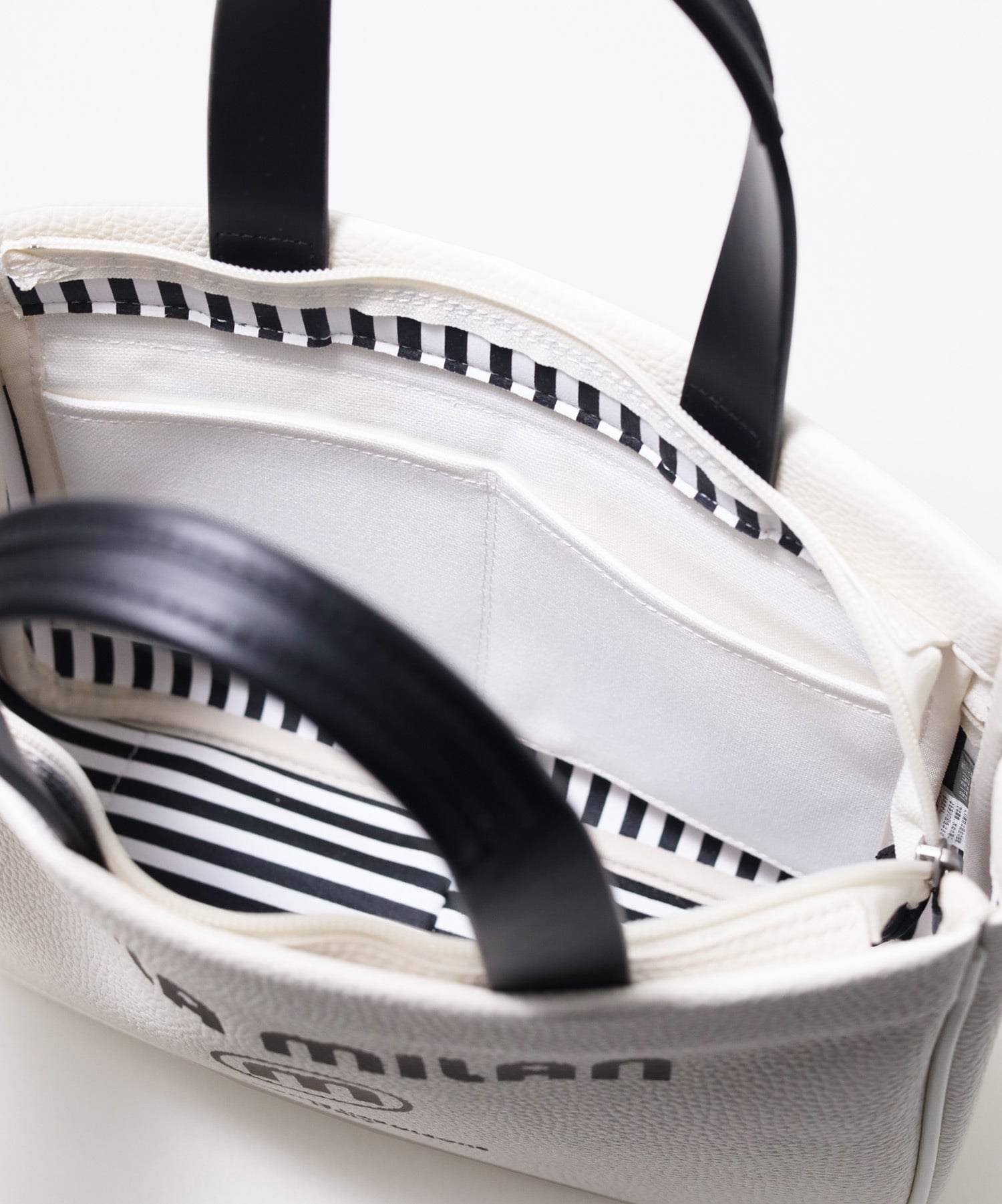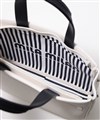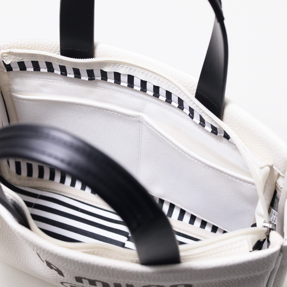 本体生地は防水機能のあるPVCを採用。雨の日も安心してお使いいただけます。一見シンプルなトートに見えますが、内装には全面ストライプ&ブランドロゴのサプライズ!ストライプ生地を使用しているように見えて、実はプリントを施した1枚生地仕立てとなっております。