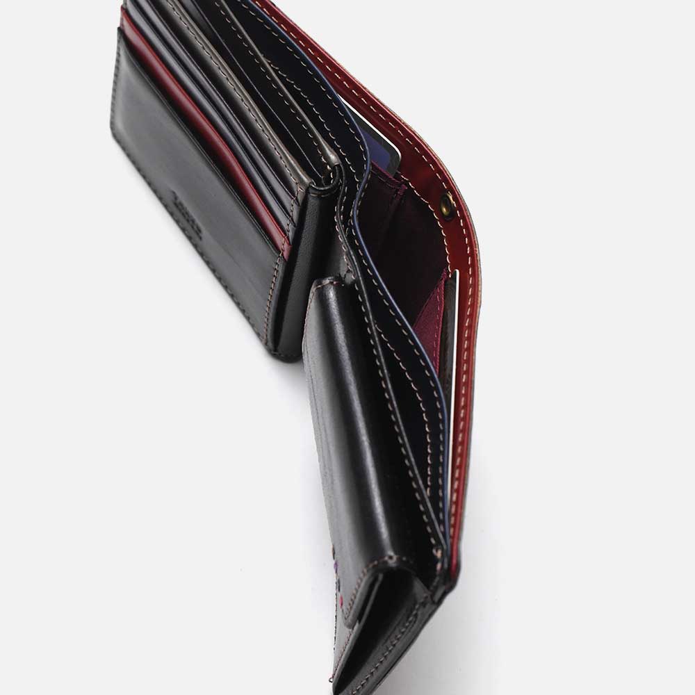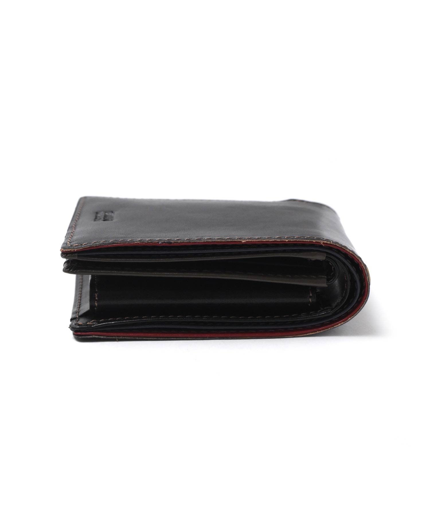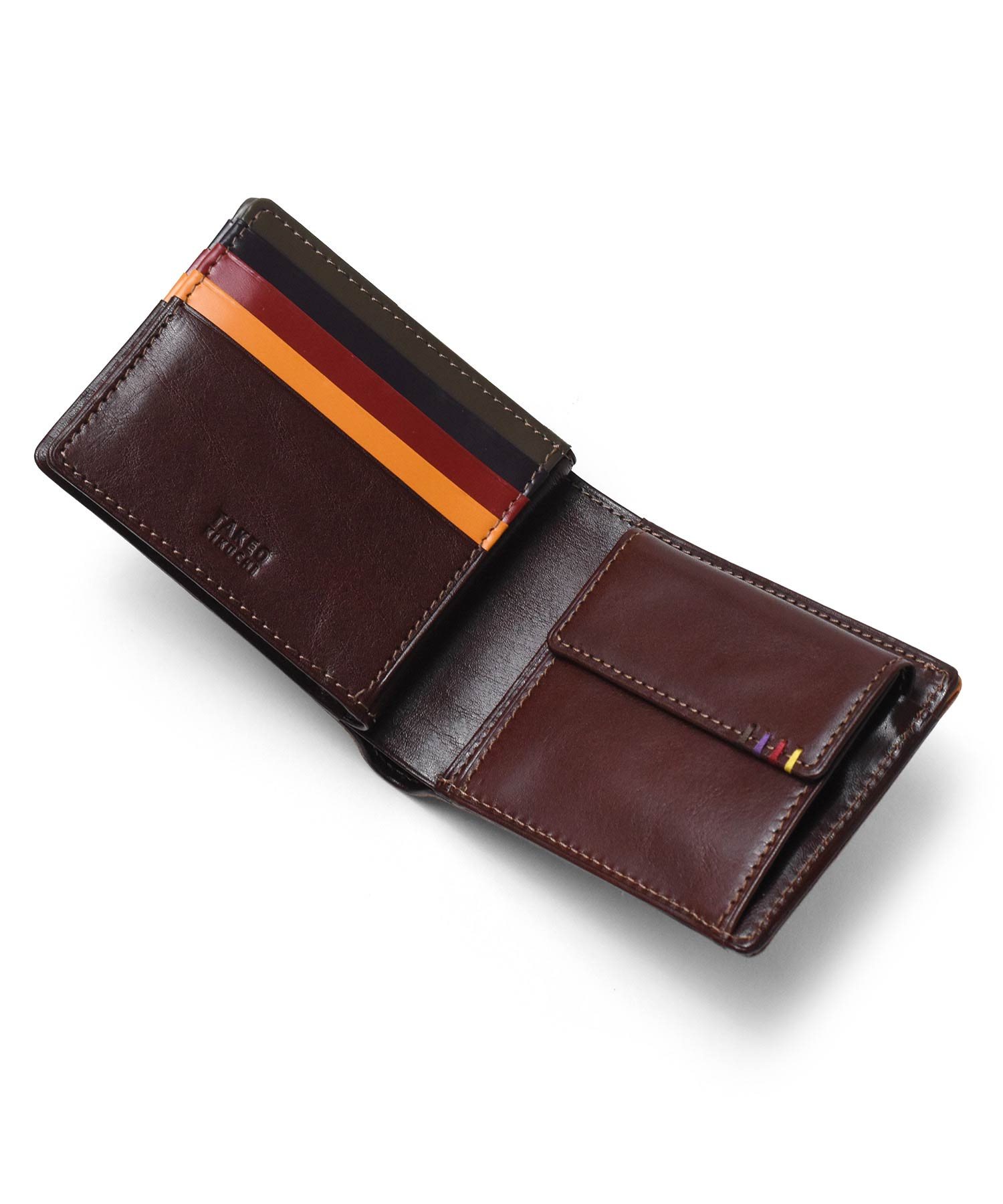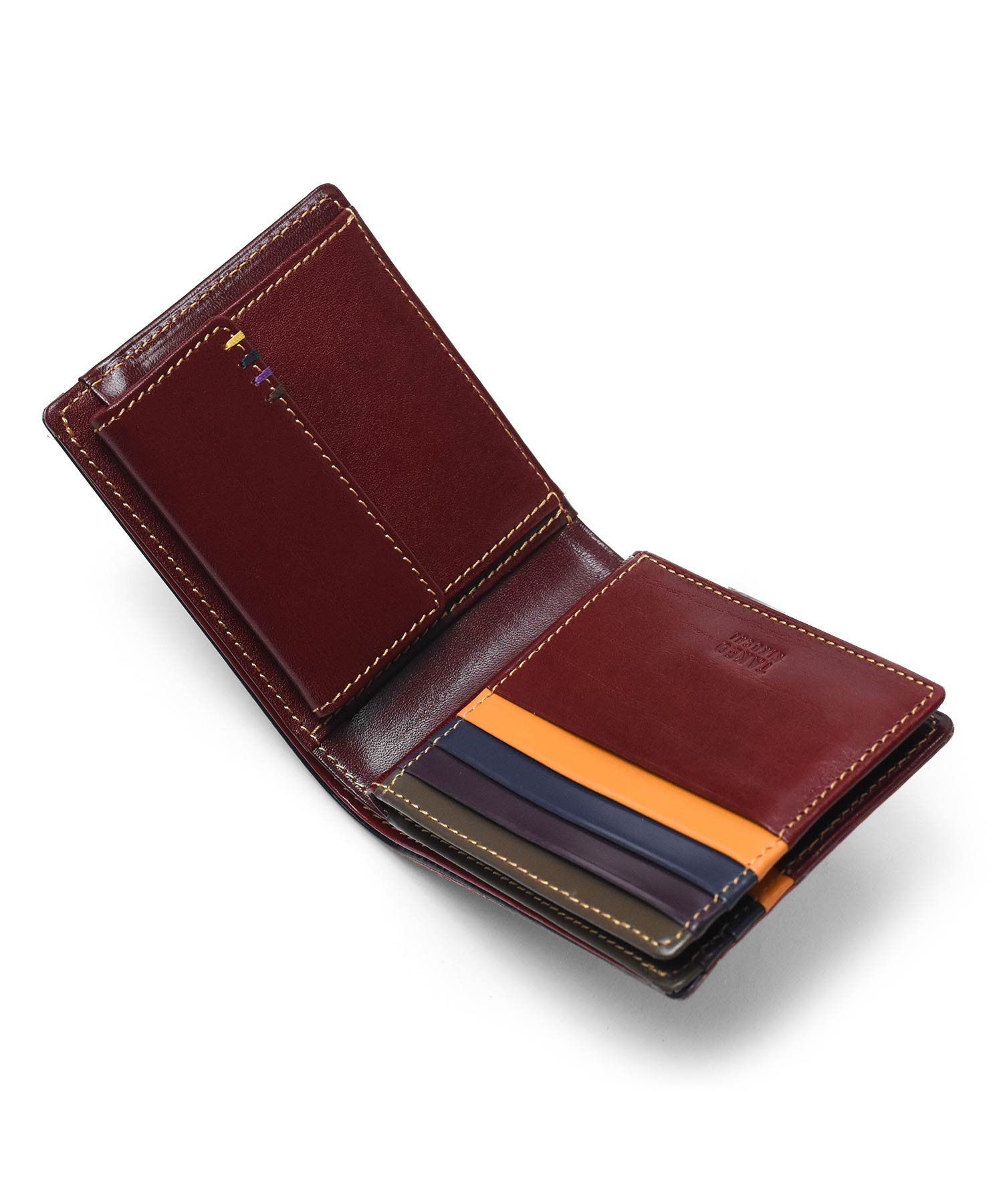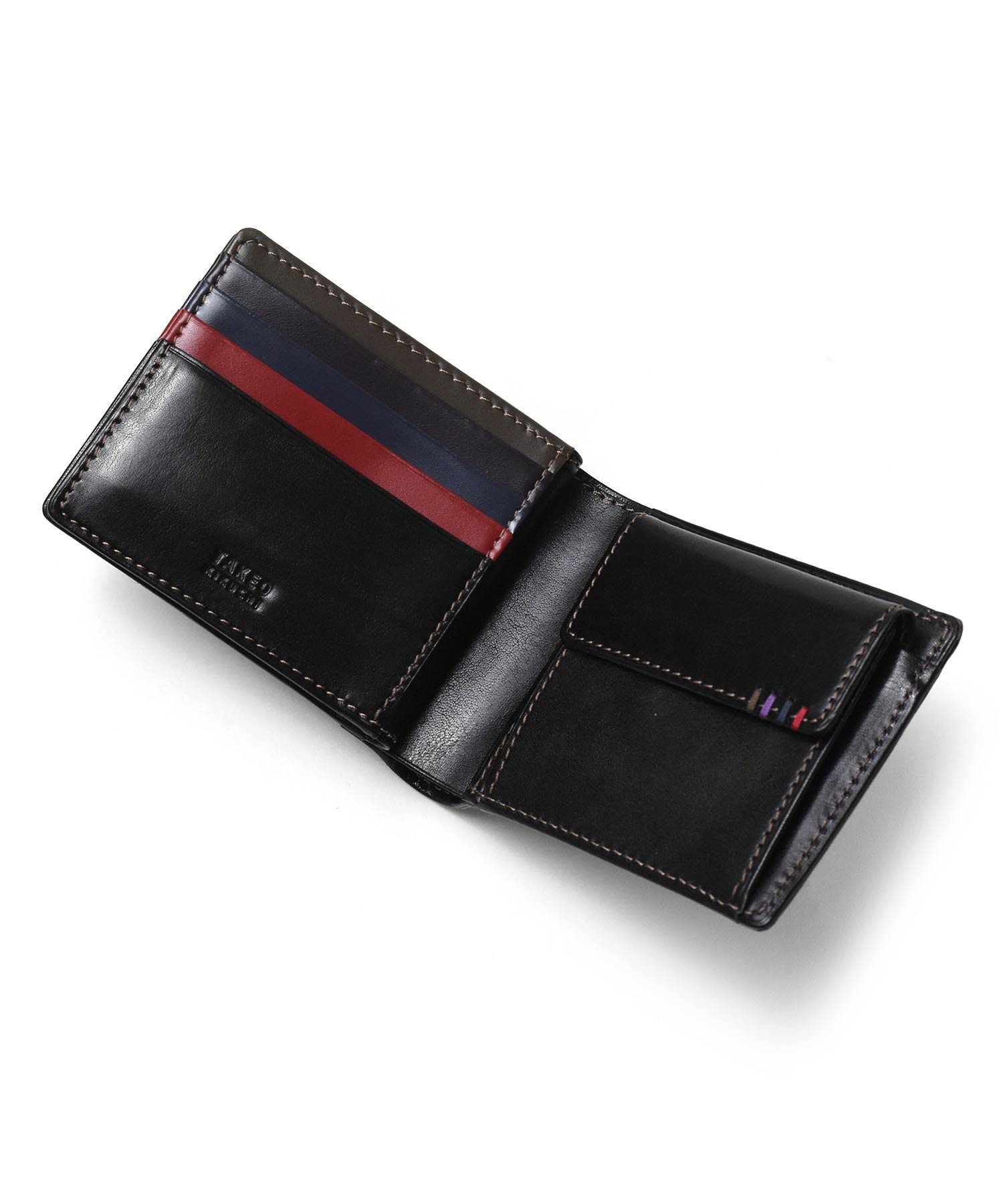 革の質感を重視したシンプルなフェイスと、カード段に配色を施したカラフルな内装とのギャップが特徴です。また、配色のカラーを使用したかがりステッチもさりげないポイントのタケオキクチの二つ折り財布です。中べら付きで、カード収納が豊富です。