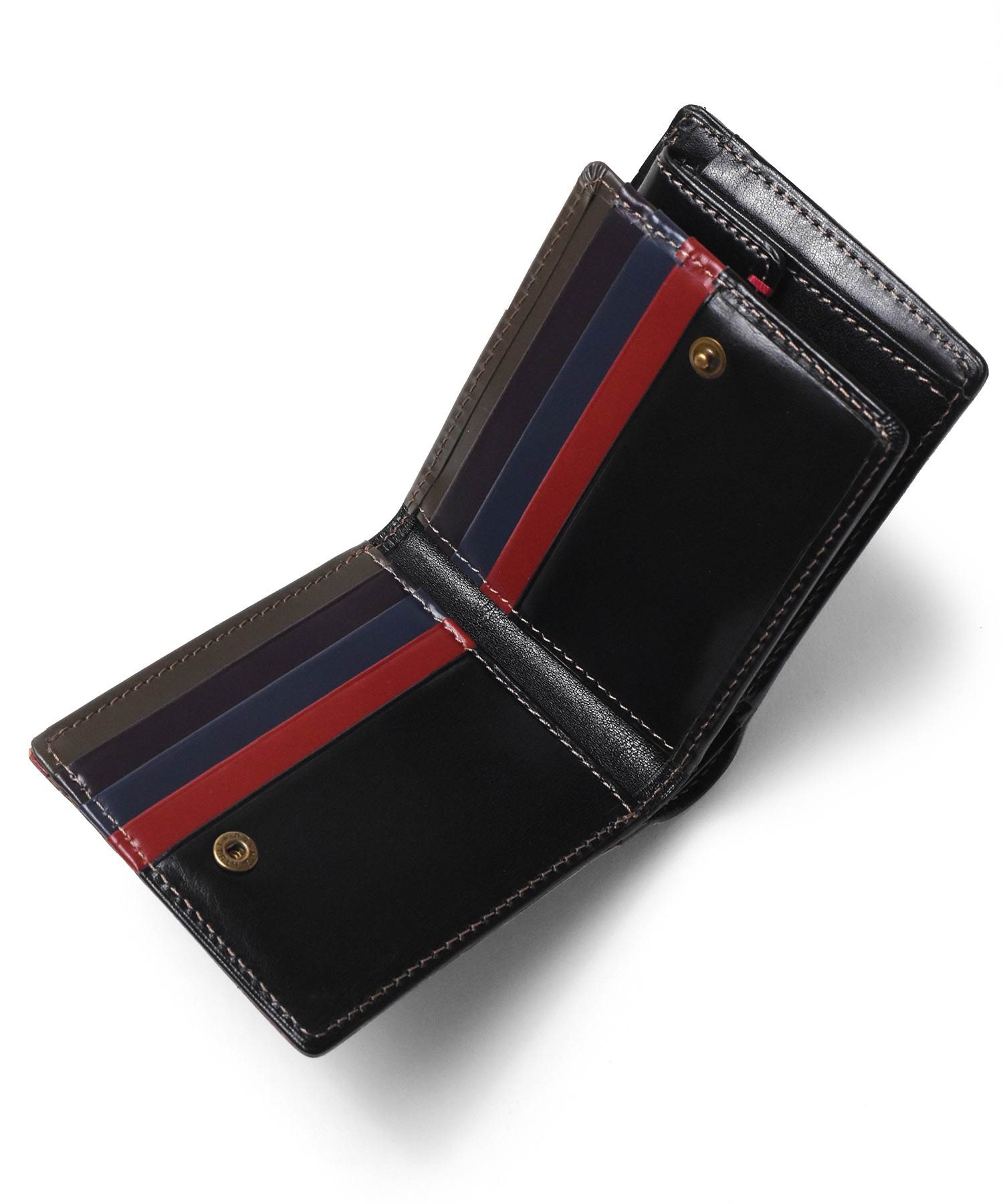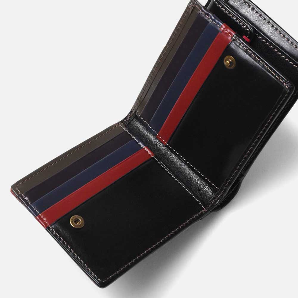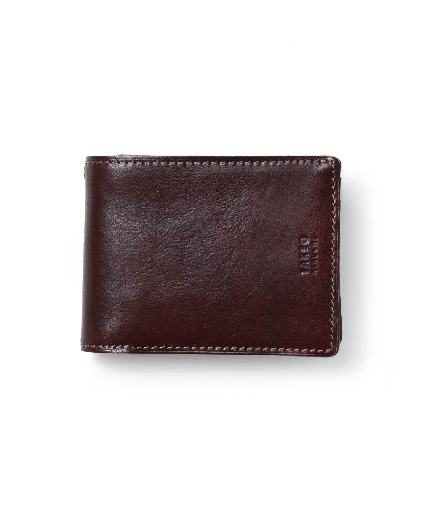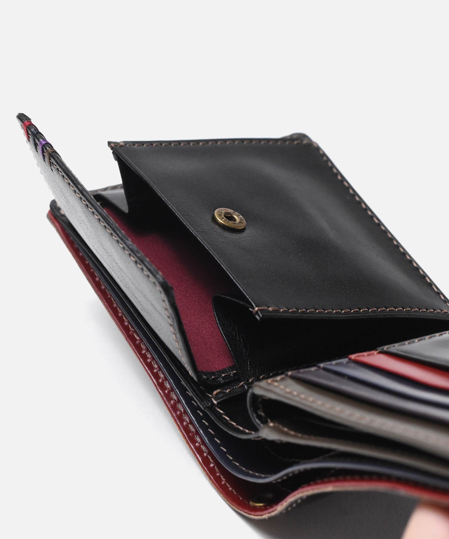 革の質感を重視したシンプルなフェイスと、カード段に配色を施したカラフルな内装とのギャップが特徴です。また、配色のカラーを使用したかがりステッチもさりげないポイントのタケオキクチの二つ折り財布です。中べら付きで、カード収納が豊富です。