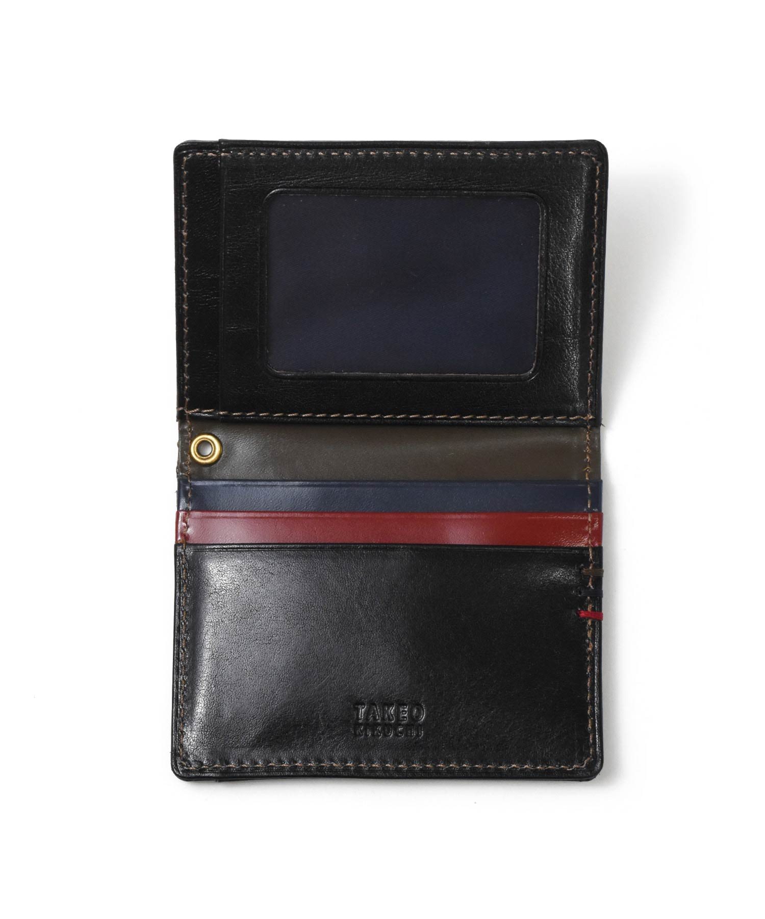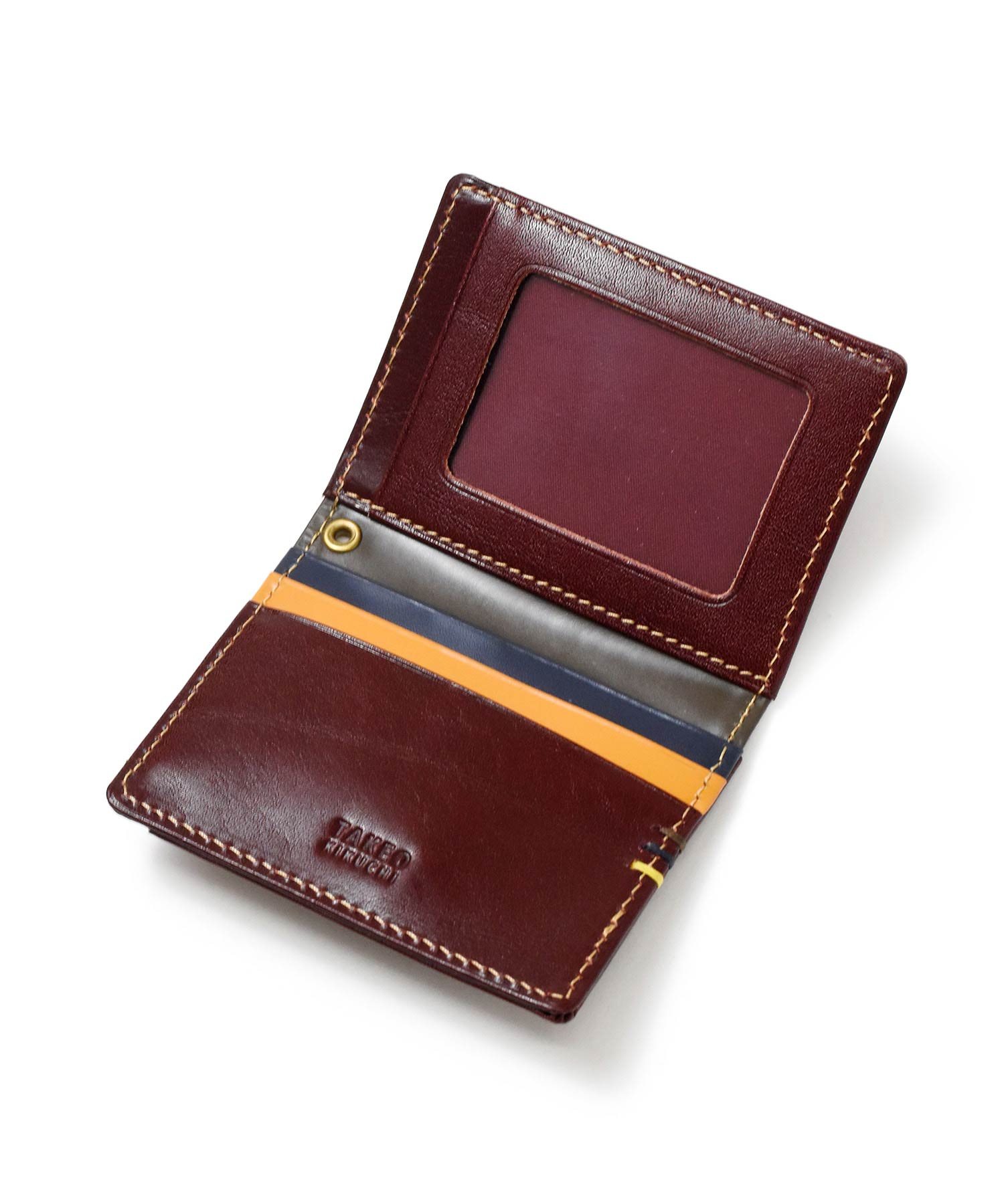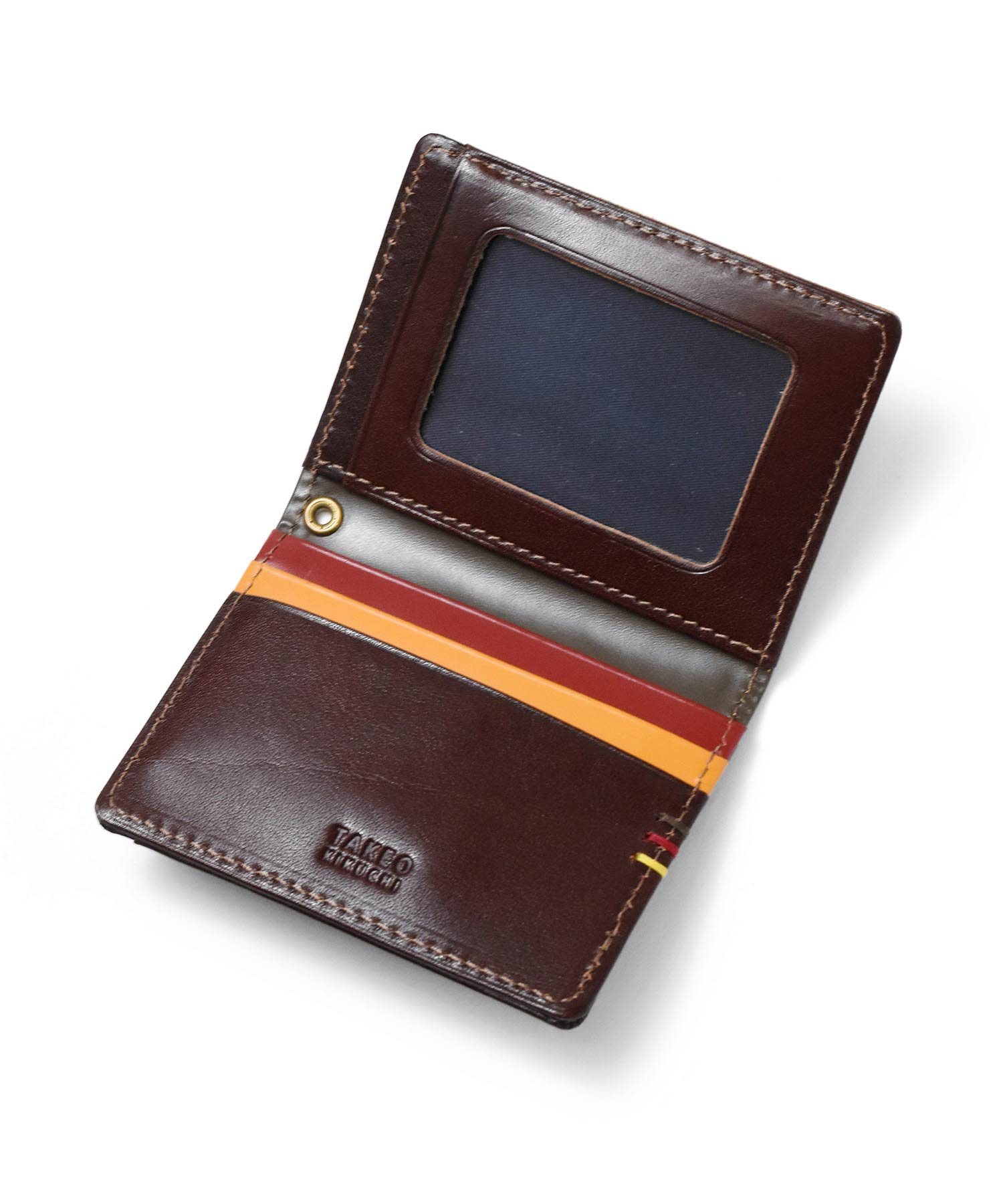 革の質感を重視したシンプルなフェイスと、カード段に配色を施したカラフルな内装とのギャップが特徴です。また、配色のカラーを使用したかがりステッチもさりげないポイントのタケオキクチのパスケースです。内側と背面の2か所に窓付きカードポケットがあり、カードの視認ができます。