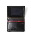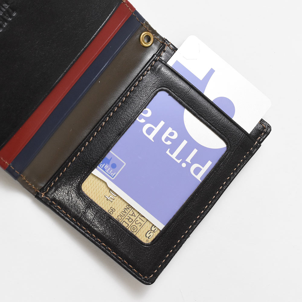 窓付きカードポケットが背面と内側に2つ付いています。身分証や社員証等の収納に便利です。また、窓付きカードポケットはカードを立て向きからと横向きからの2方向から入れられるよう、入り口が2つあります。さらにパスケース内側にはカード段が3つあります。