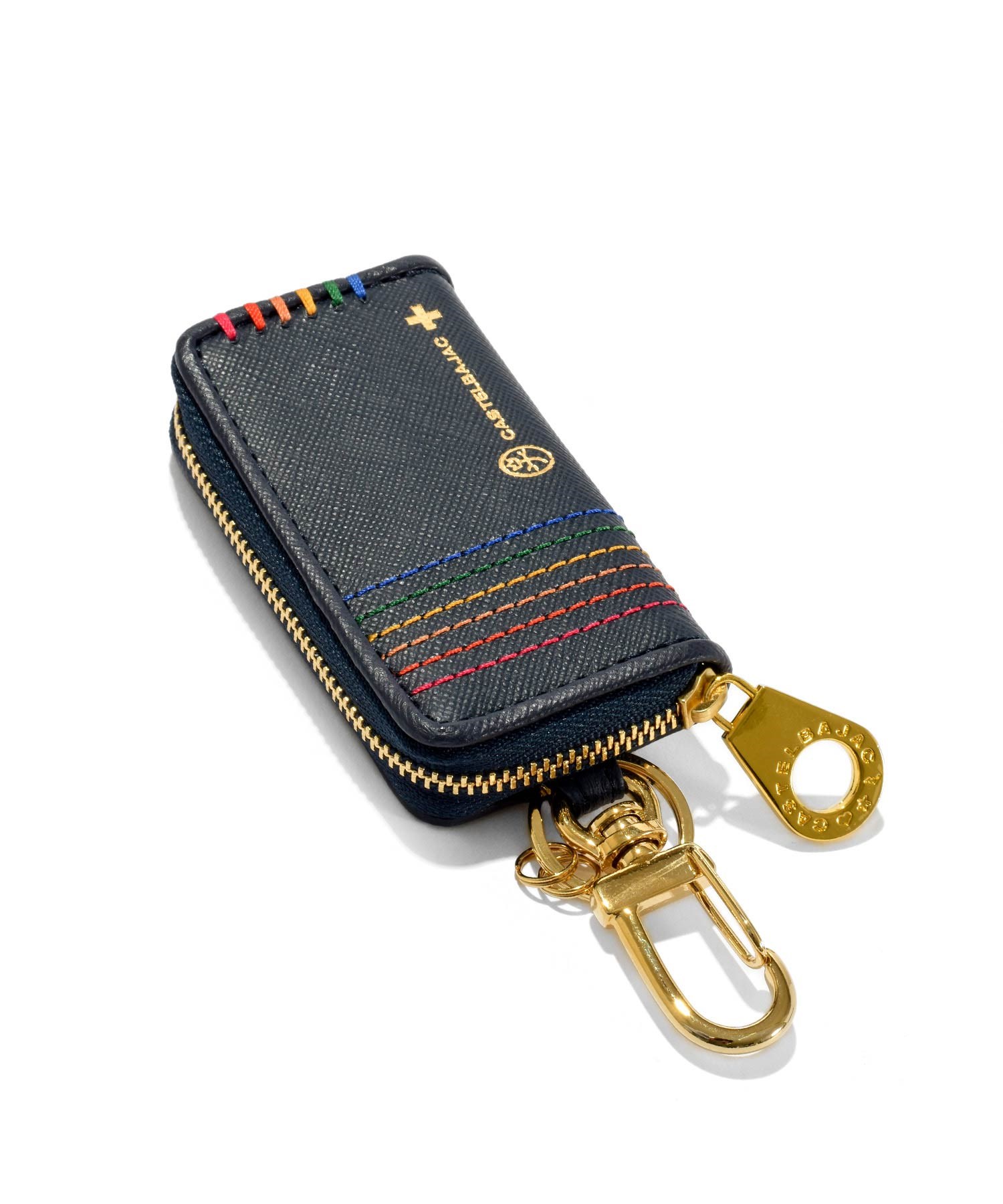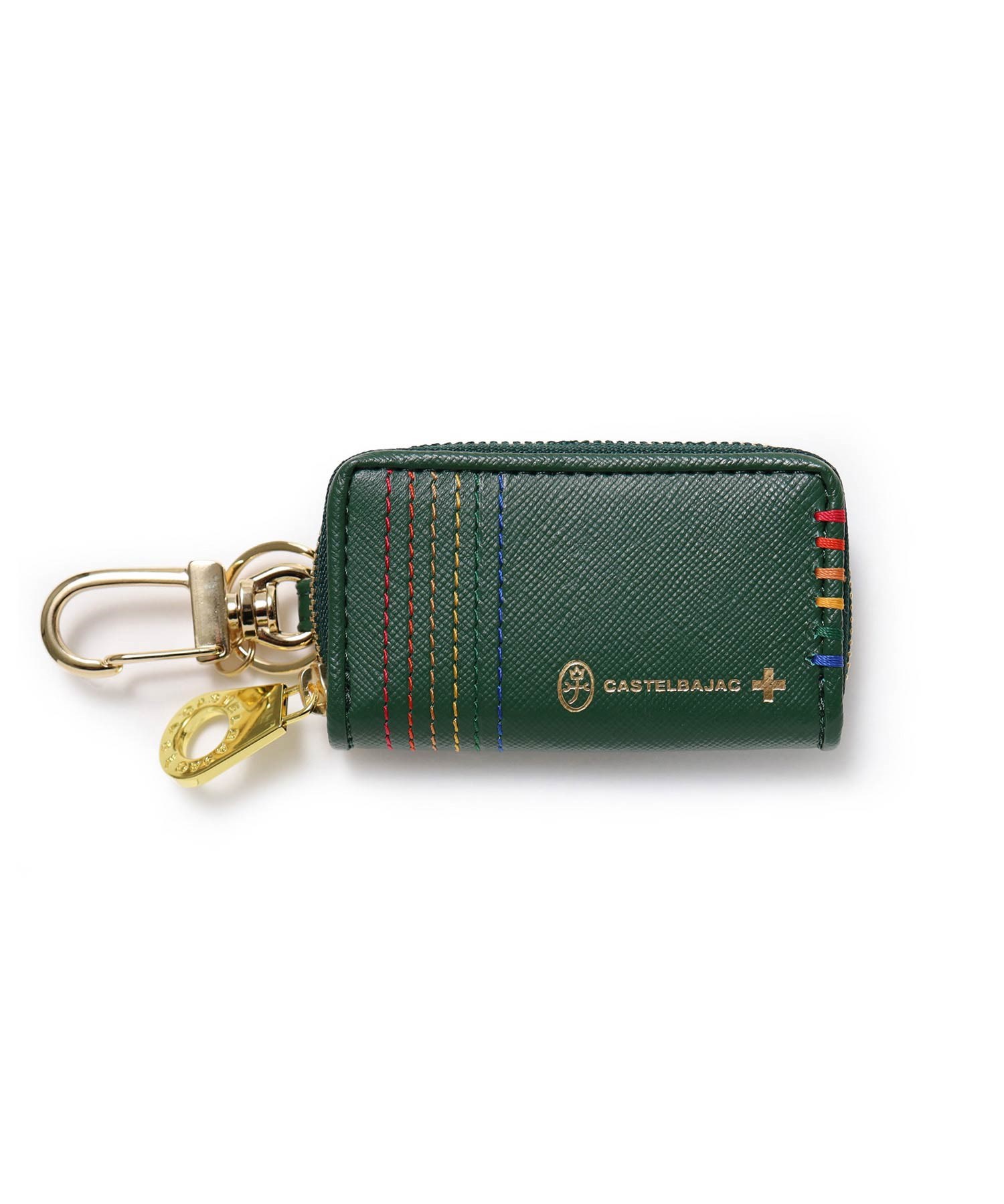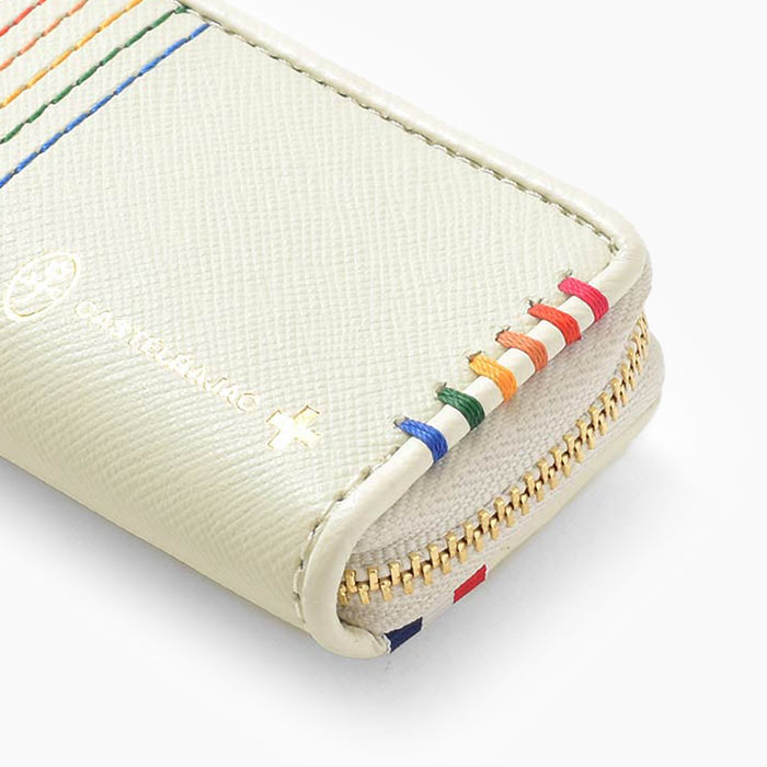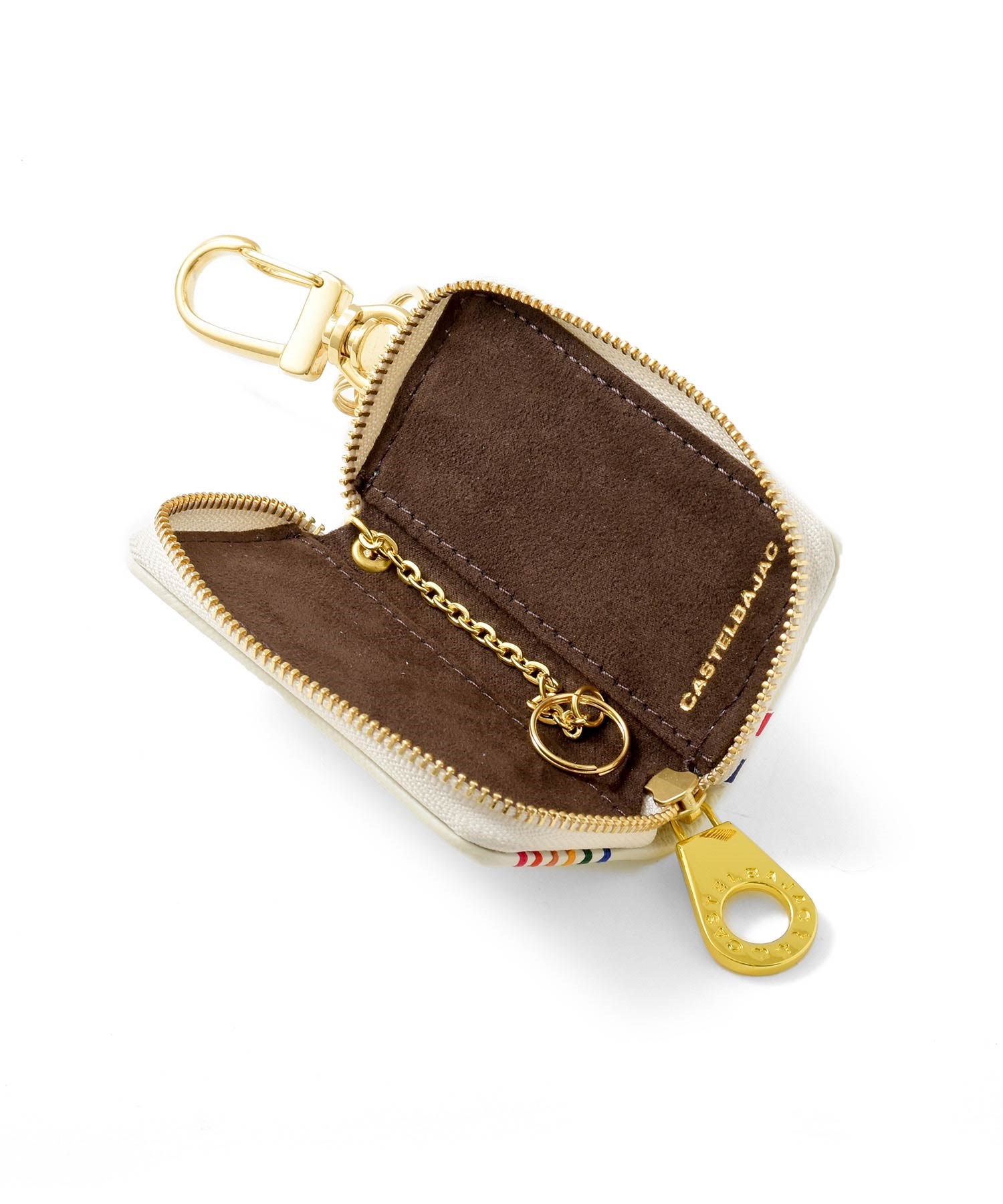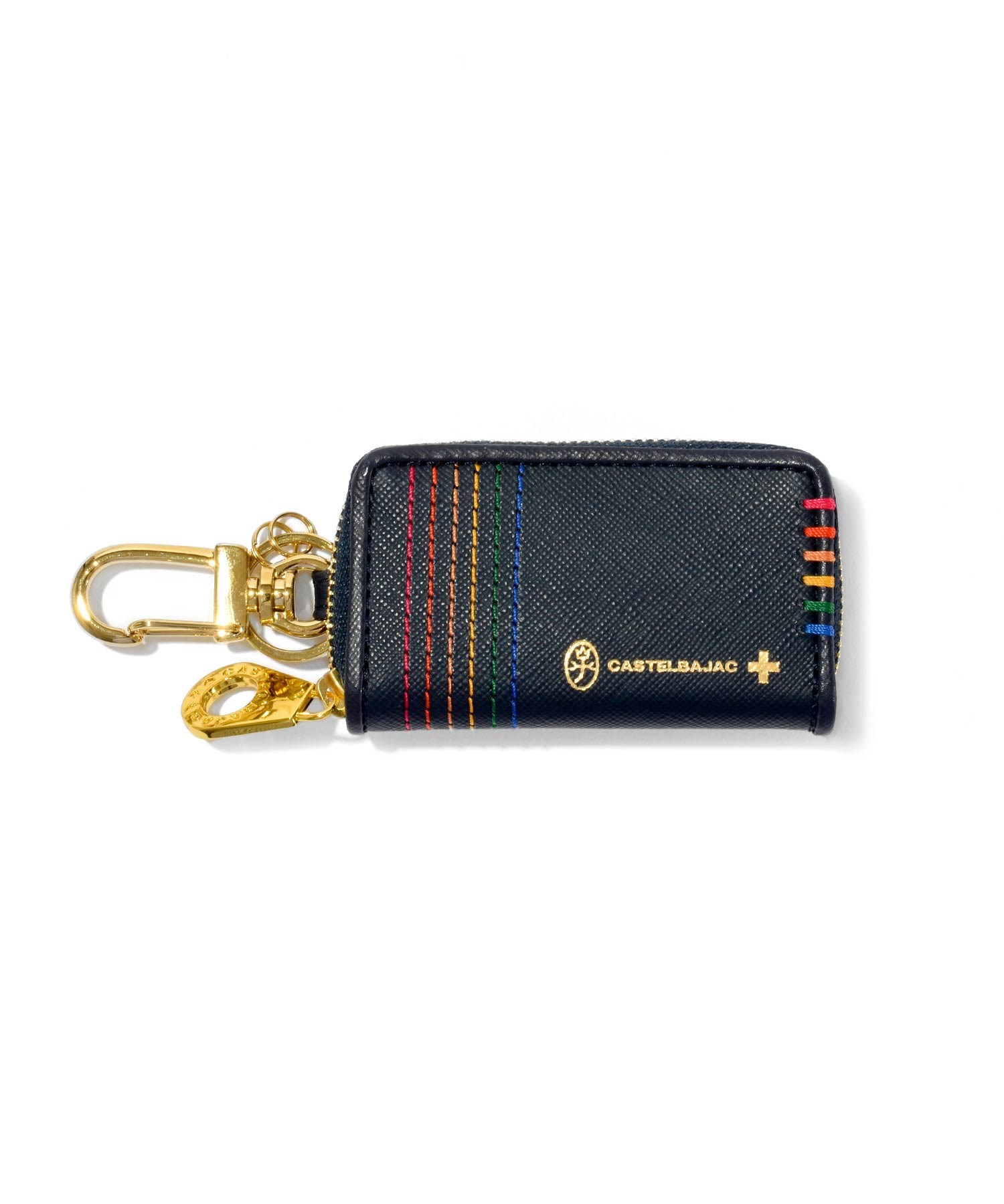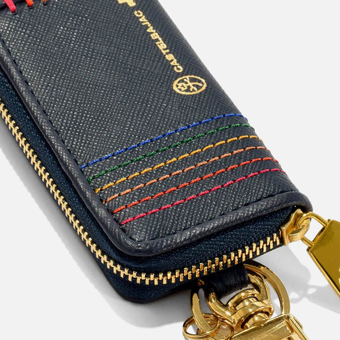 カステルバジャックで使用される6色のイメージカラーを飾りステッチと手かがりステッチで表現したシェストシリーズのスマートキー対応キーケース。光沢のあるゴールド色ファスナー、金具そしてネーム表現と、小銭入れの裏地にもゴールド色のサテン生地を使用し、ユニセックスな感覚に仕上がっています。