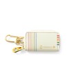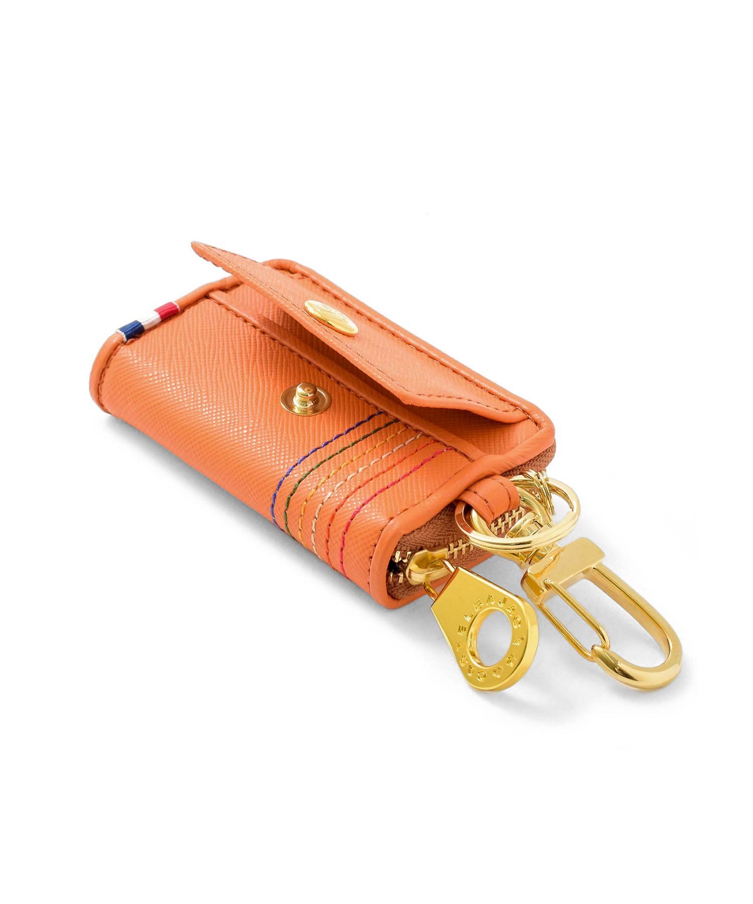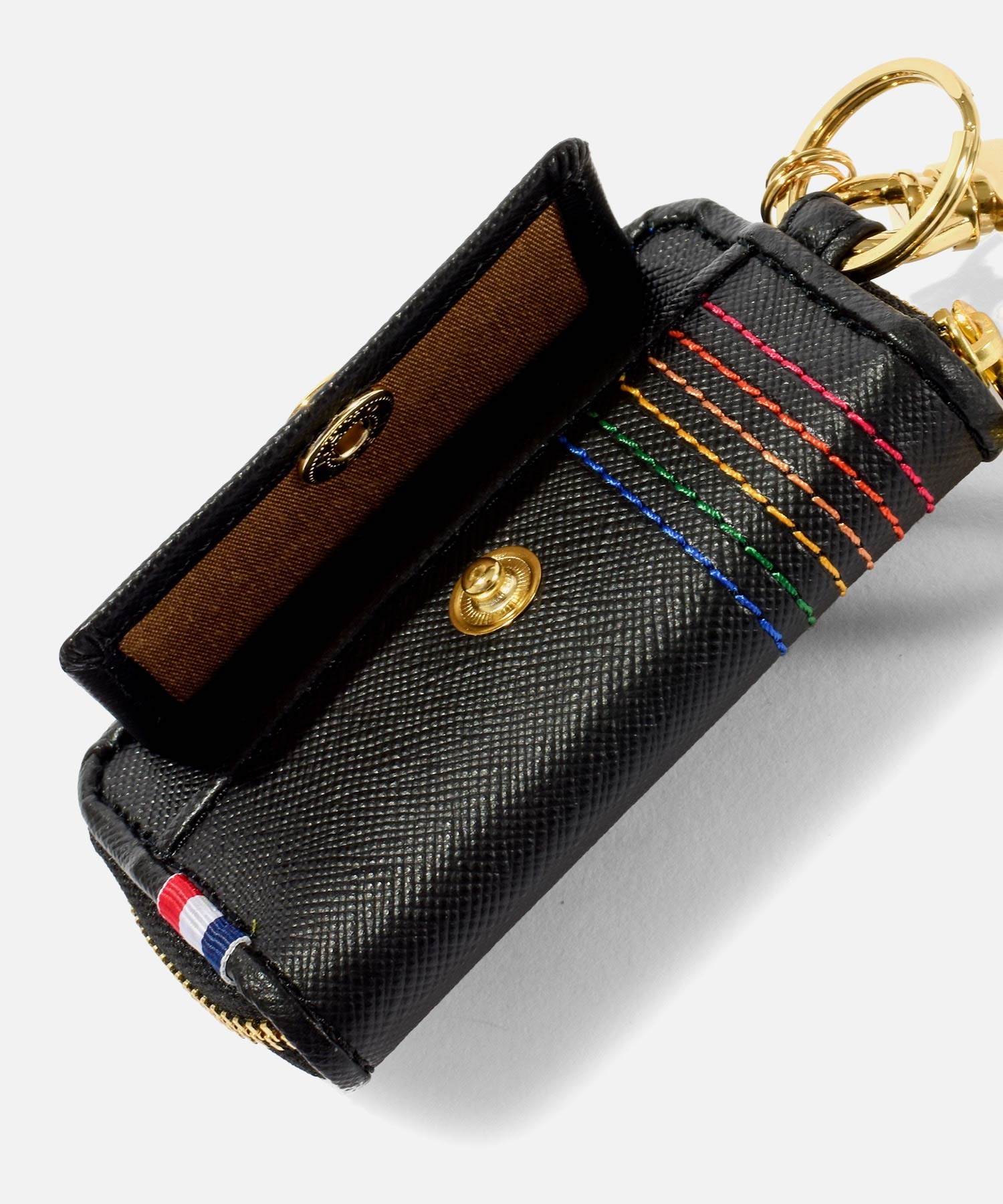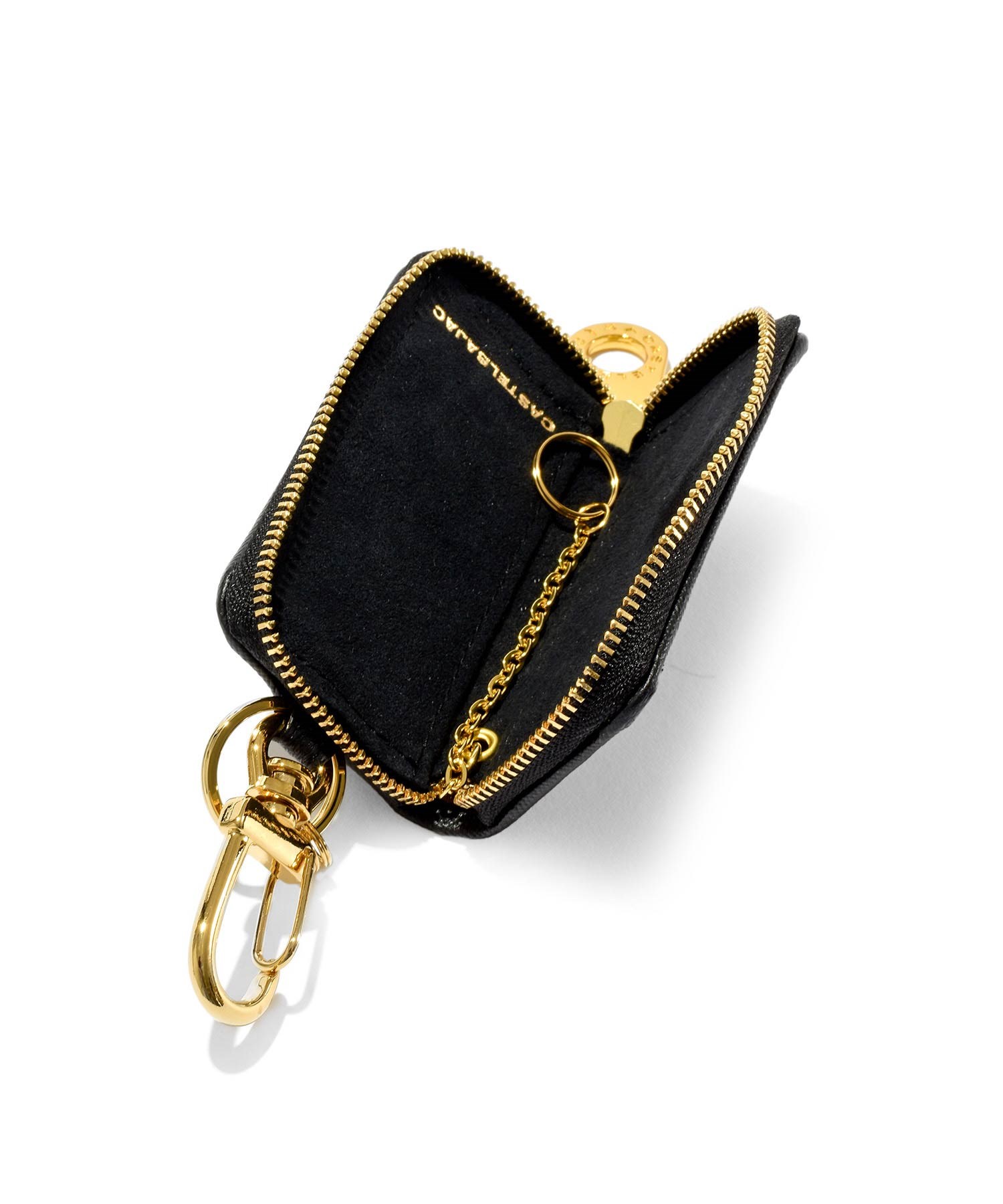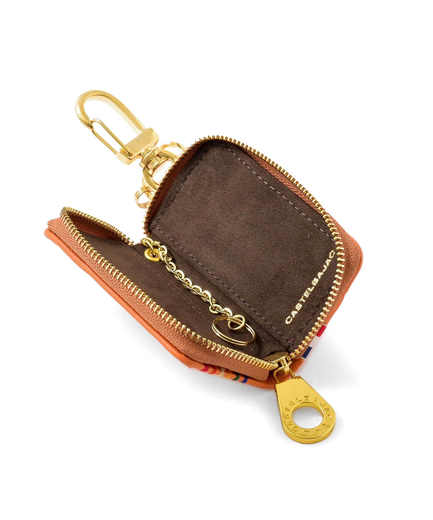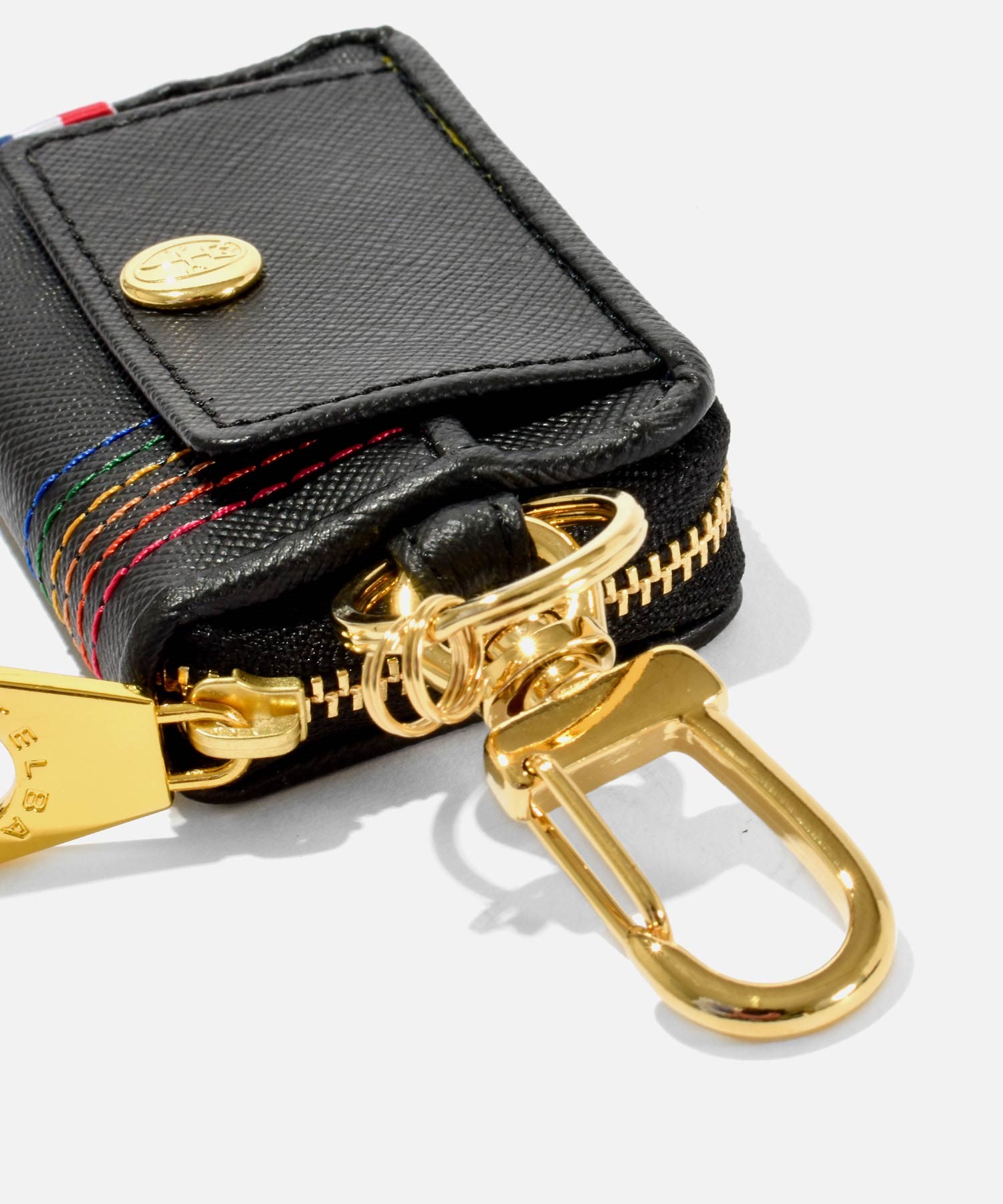 カステルバジャックで使用される6色のイメージカラーを飾りステッチと手かがりステッチで表現したシェストシリーズのスマートキー対応キーケース。光沢のあるゴールド色ファスナー、金具そしてネーム表現と、小銭入れの裏地にもゴールド色のサテン生地を使用し、ユニセックスな感覚に仕上がっています。