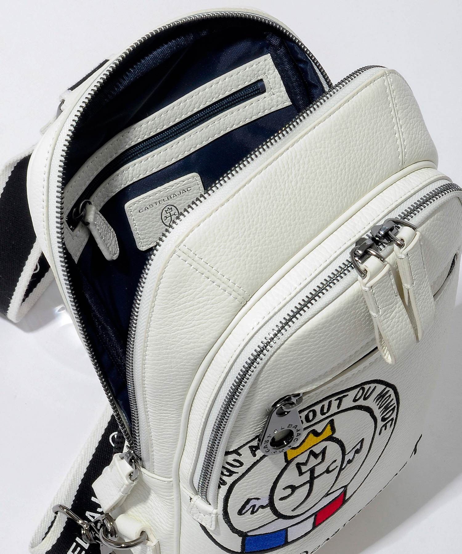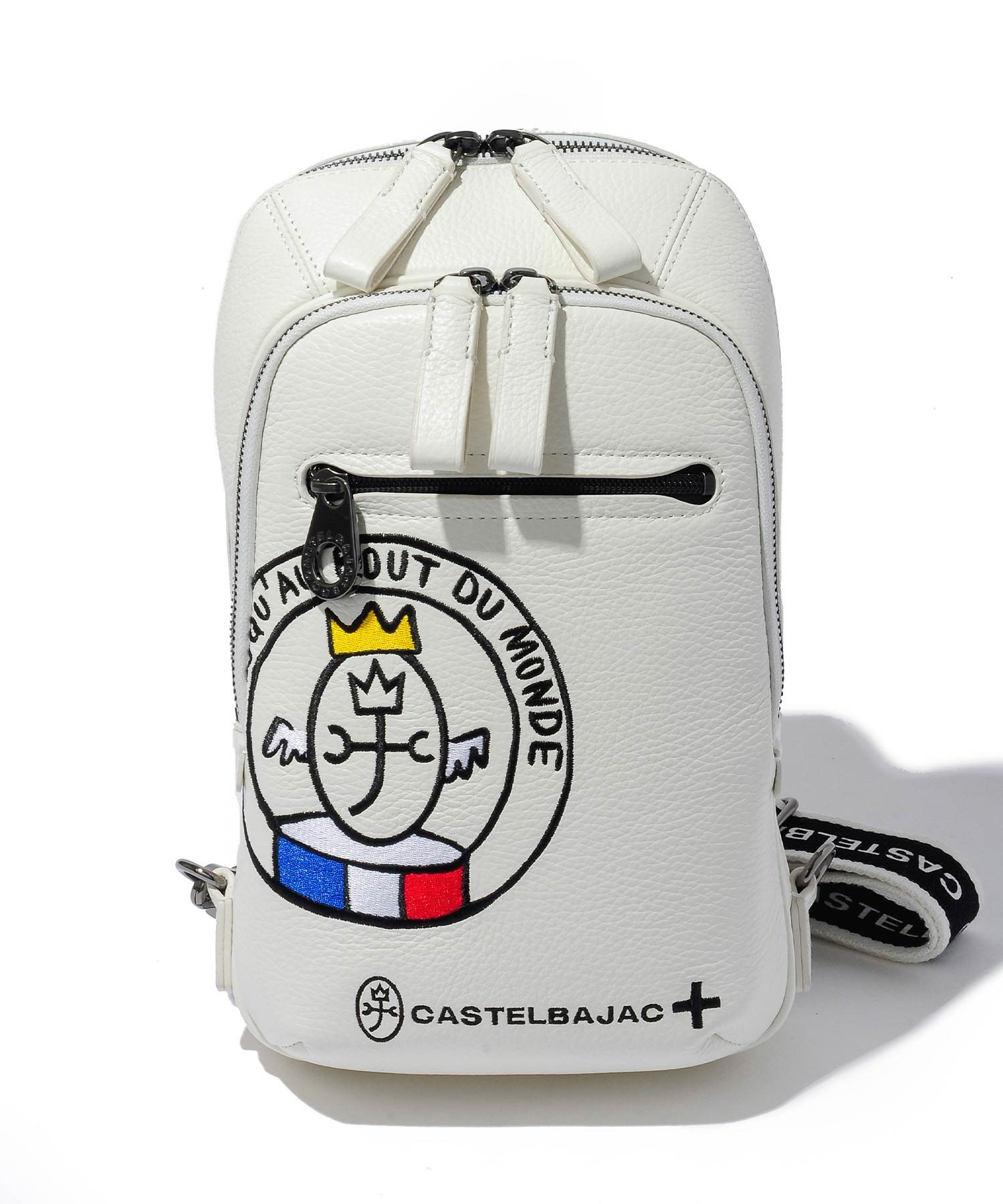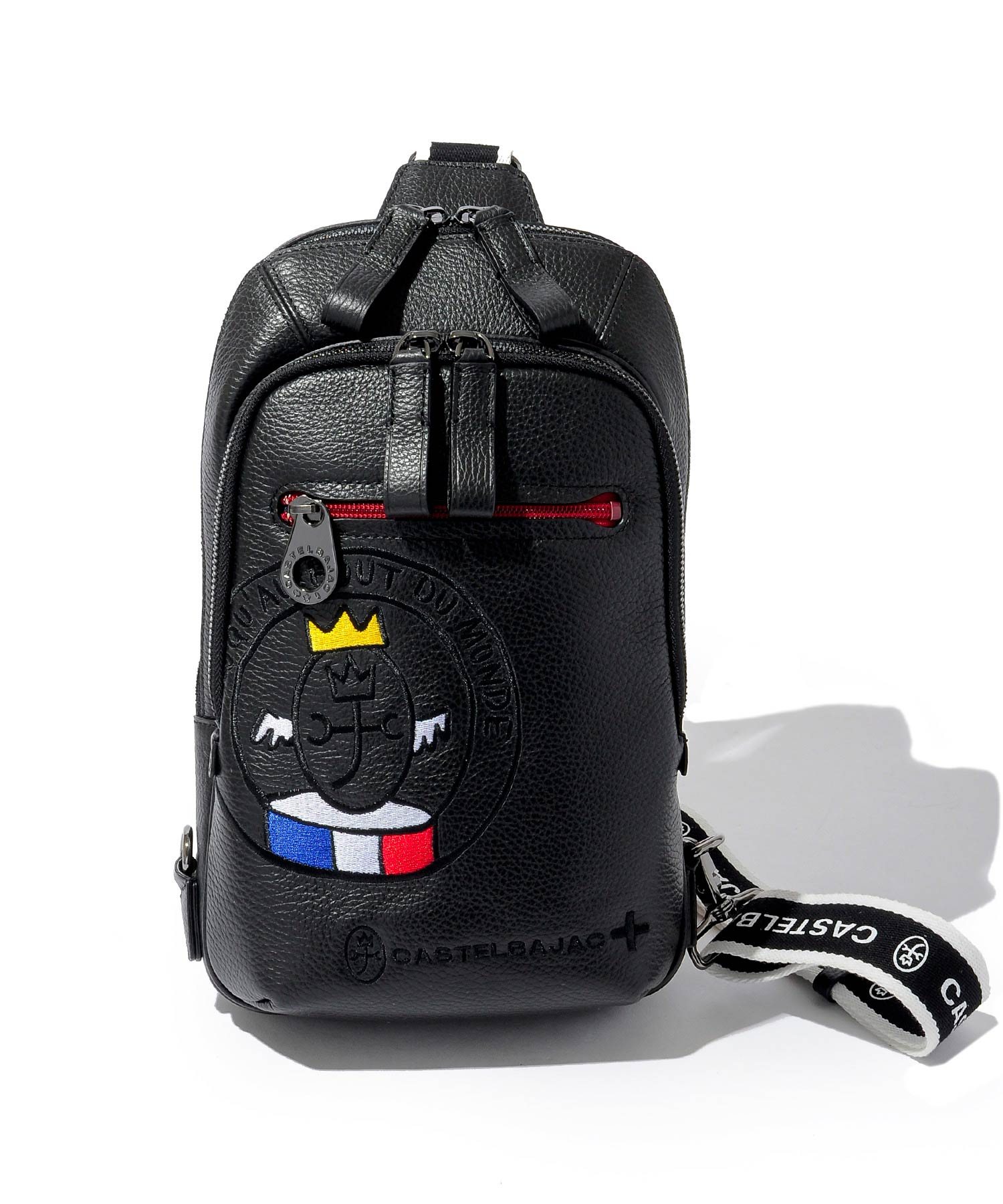 繊細な刺繍でカステルバジャックの家紋マークを表現した、ソフトで軽量なレザーカジュアルワンショルダーバッグ。カバンの本体素材には、イタリアの牛タンナーが集まる、世界的にも有名な牛革の一大生産地「ヴィツェンツァ」で作られた牛革を使用しています。CASTELBAJACのロゴ入りのオリジナルショルダーテープも魅力です。
