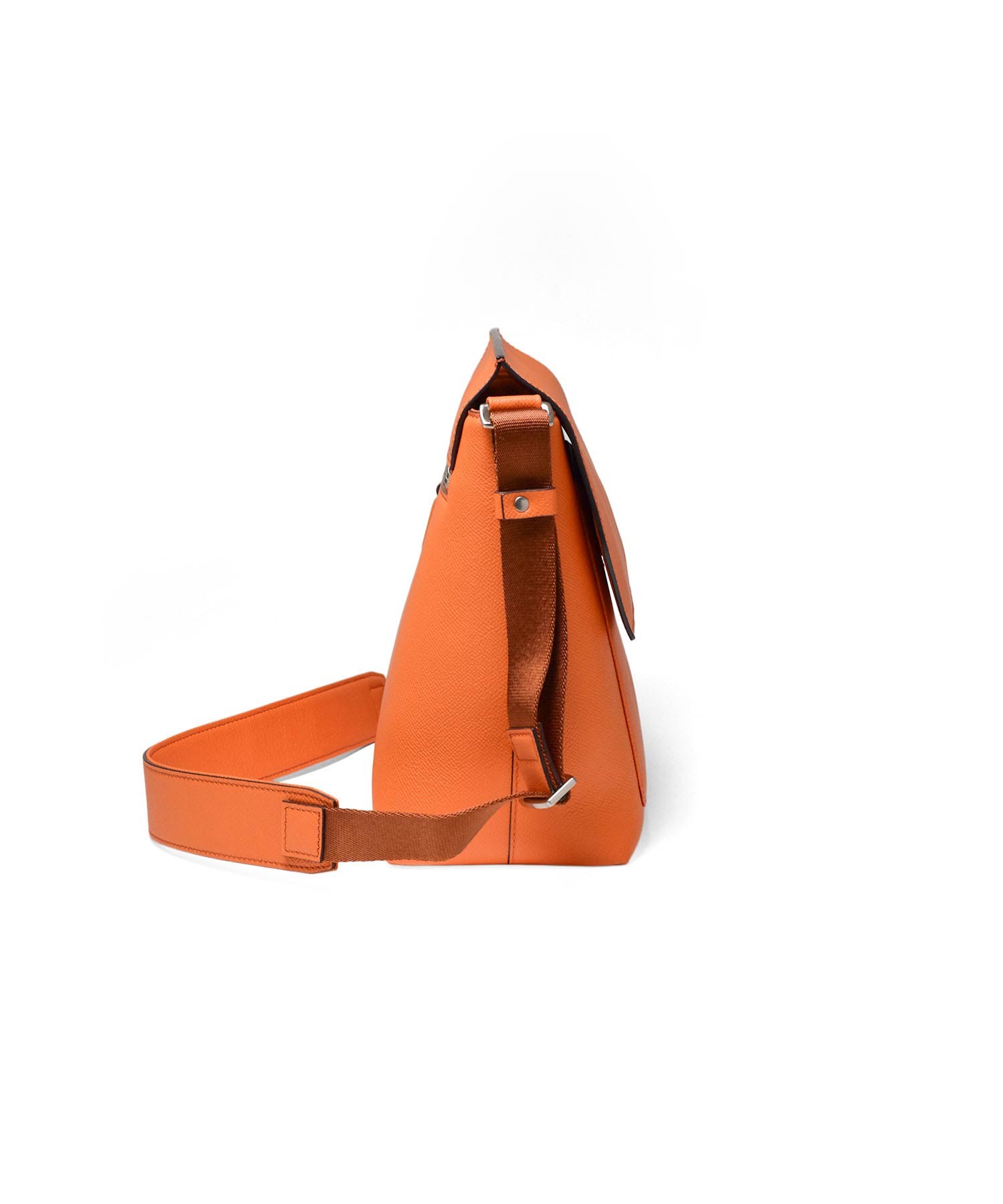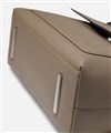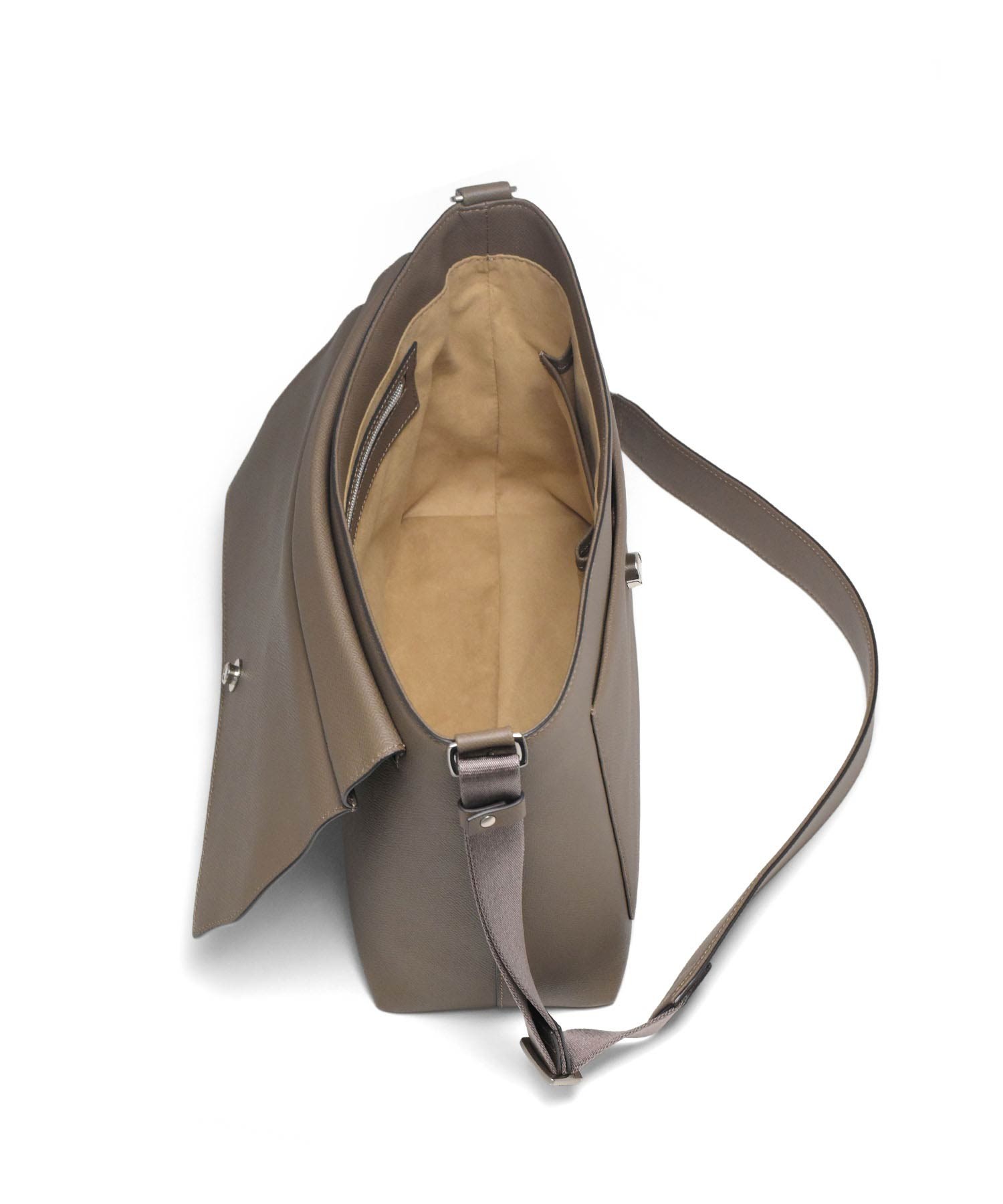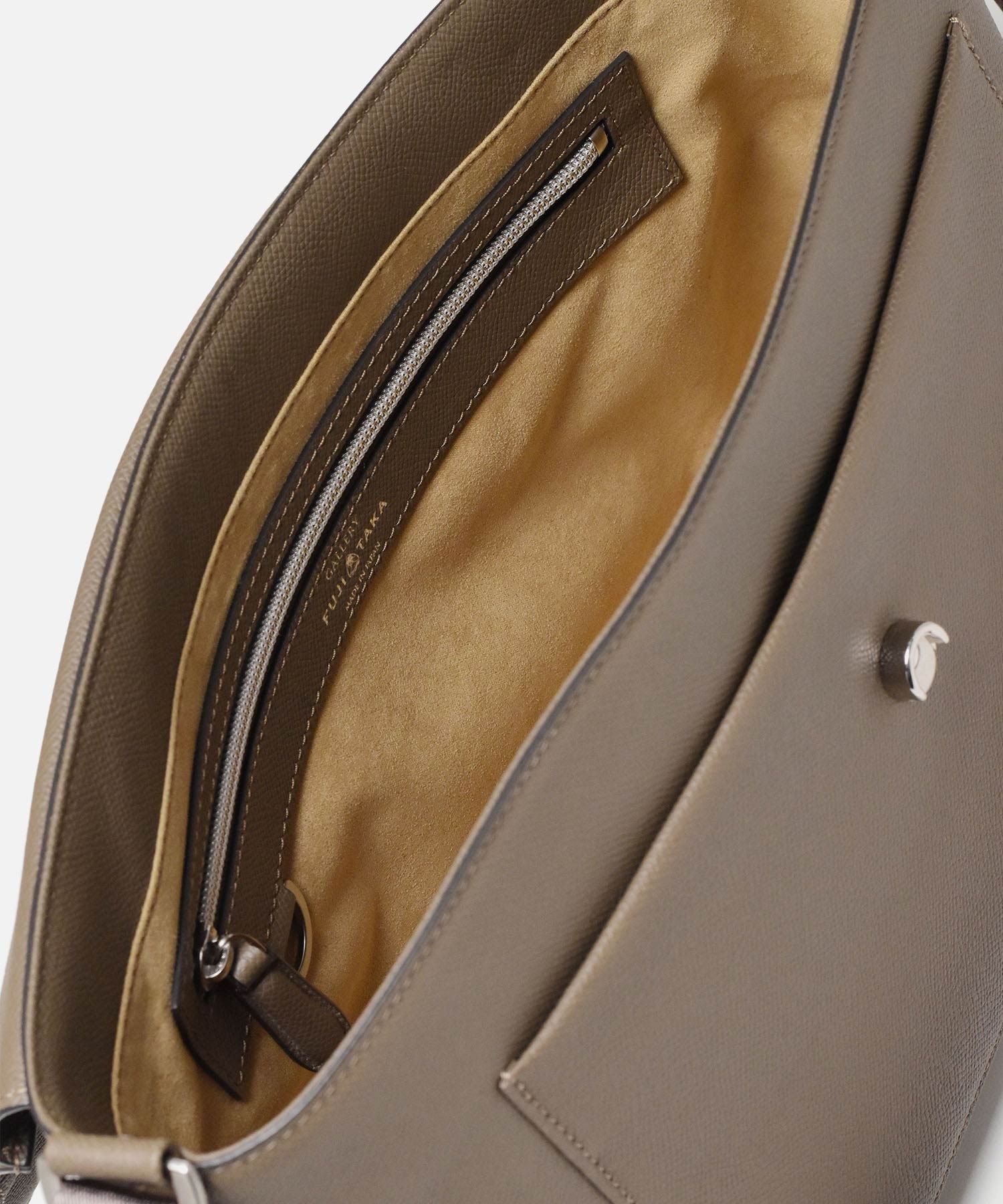 カバンの内側にはスエード生地を採用、軽くて柔らかく、なめらかな肌触りが特徴です。ポストミシンと呼ばれる特殊なミシンを使って生み出されるマチ構造によりコンパクトな横幅ながら十分な収納スペースを確保、そのほか、手にぴたりと馴染む絶妙のカーブを持つ手縫いの持ち手や丁寧に磨かれた革のコバ(断面)など随所に職人のこだわりの技が光ります。