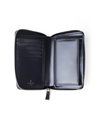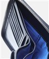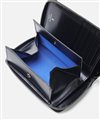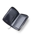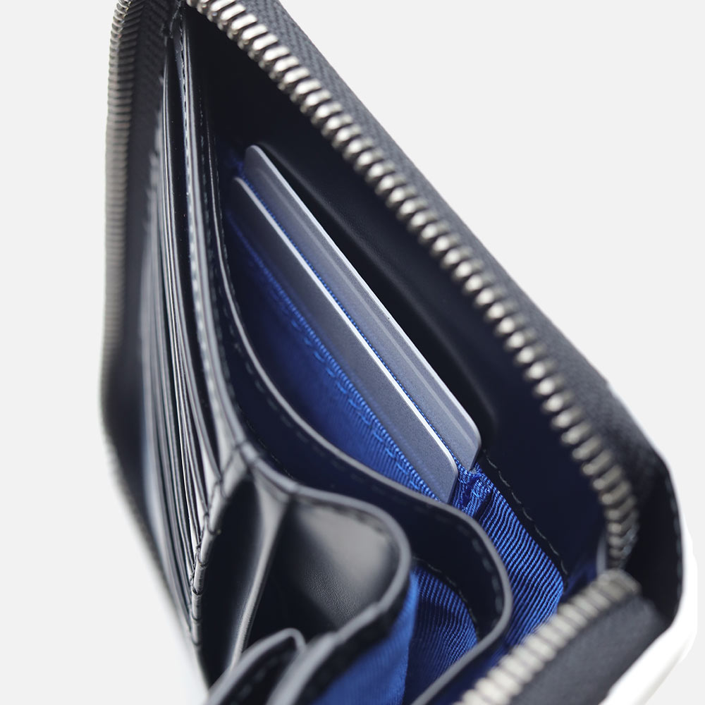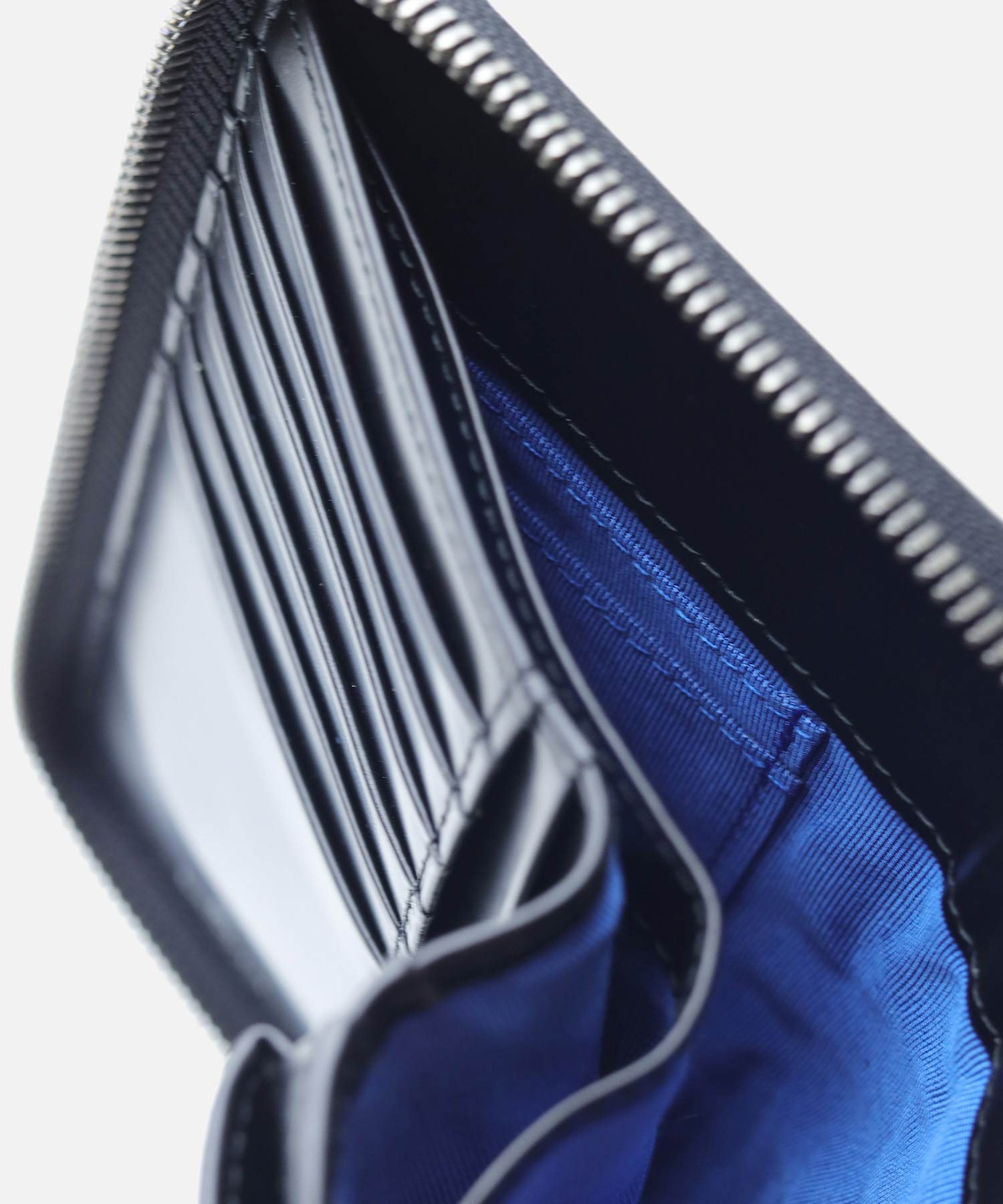 高級感あるラウンドファスナー型の折り財布です。札入れが2つ、小銭入れが1つ、カード段が6つ、ポケットが4つあります。札入れ内にはさらにカードポケットが2つあり、収納力抜群です。小銭入れはBOX型で、硬貨の確認や出し入れがしやすいつくりです。