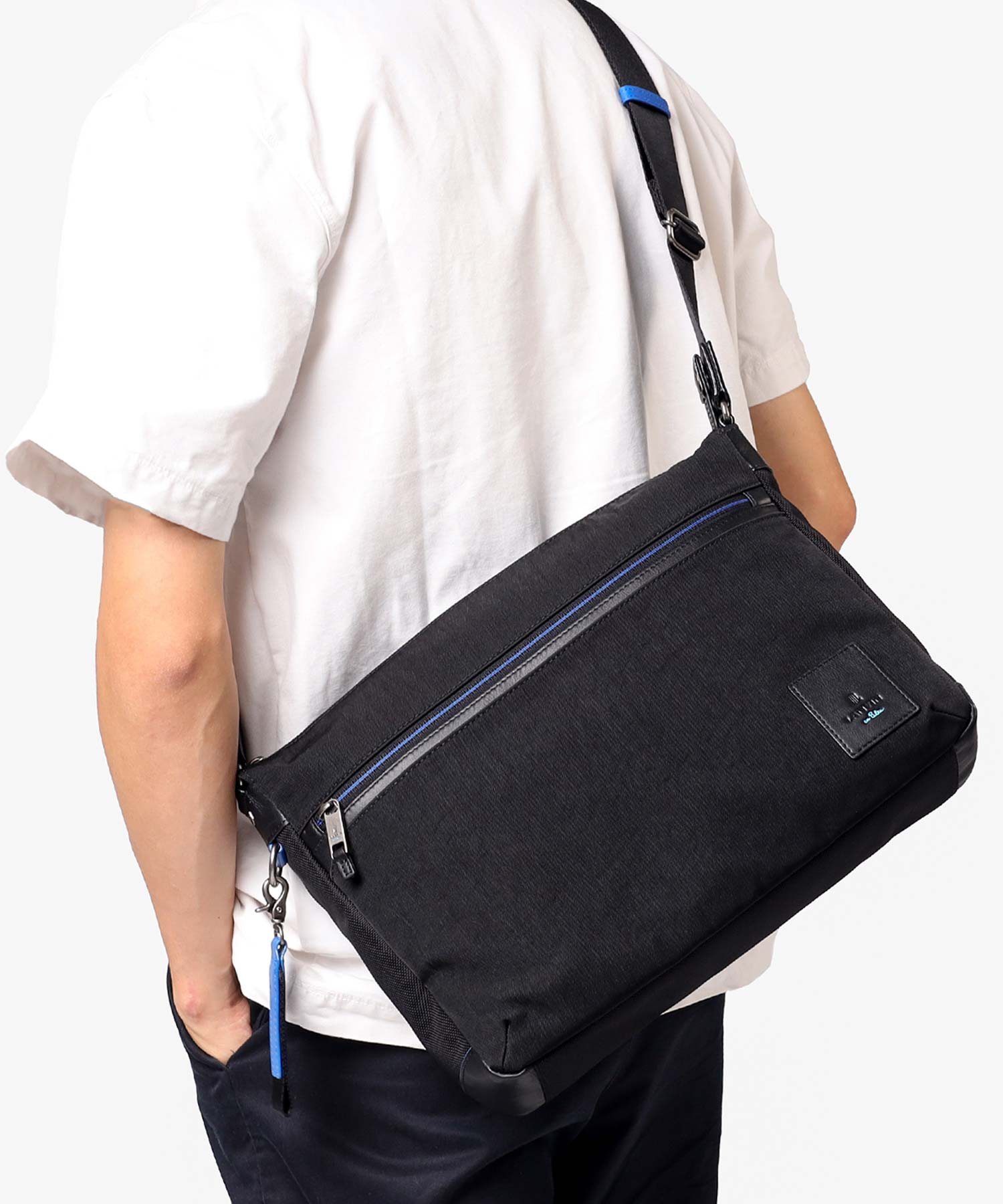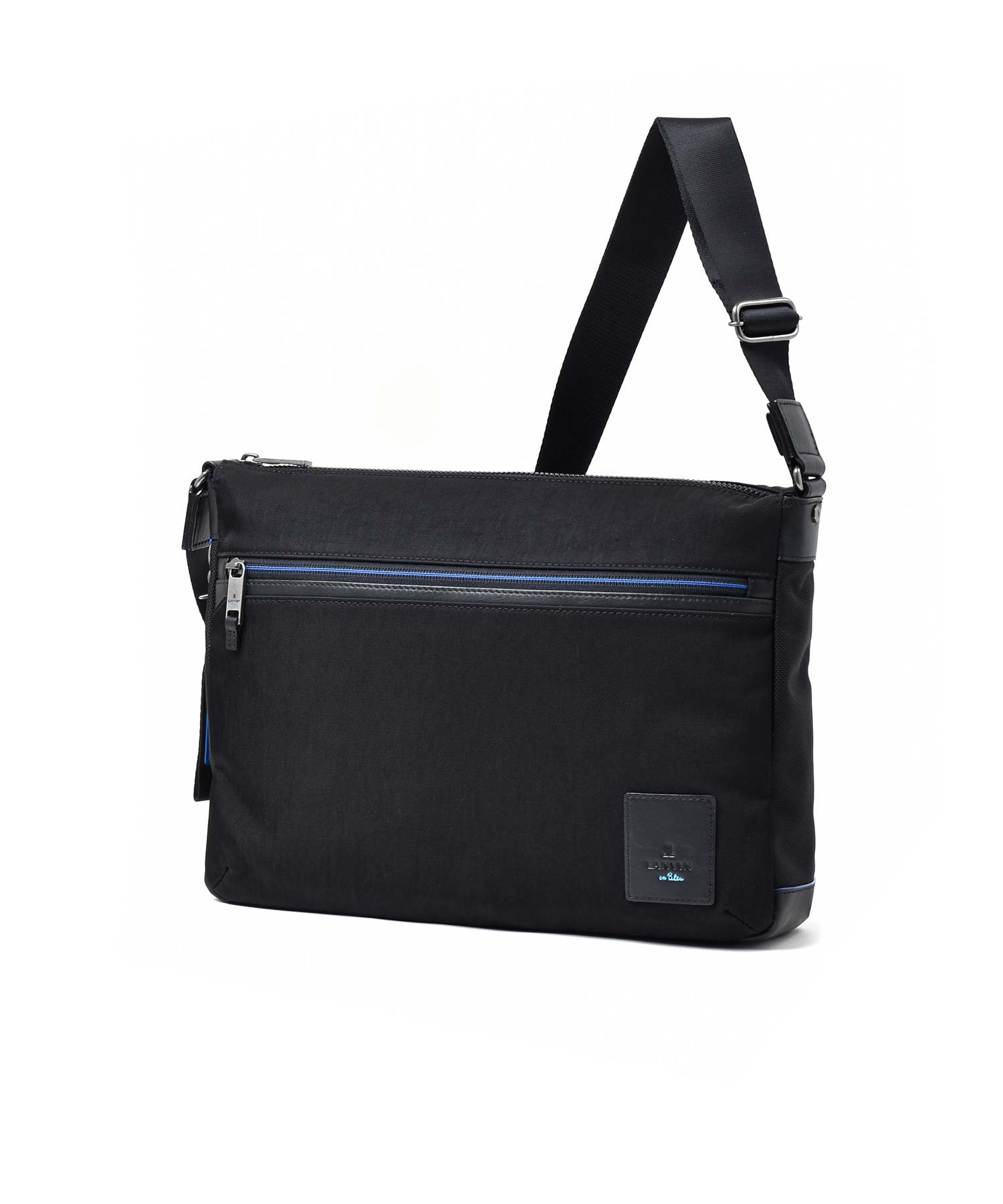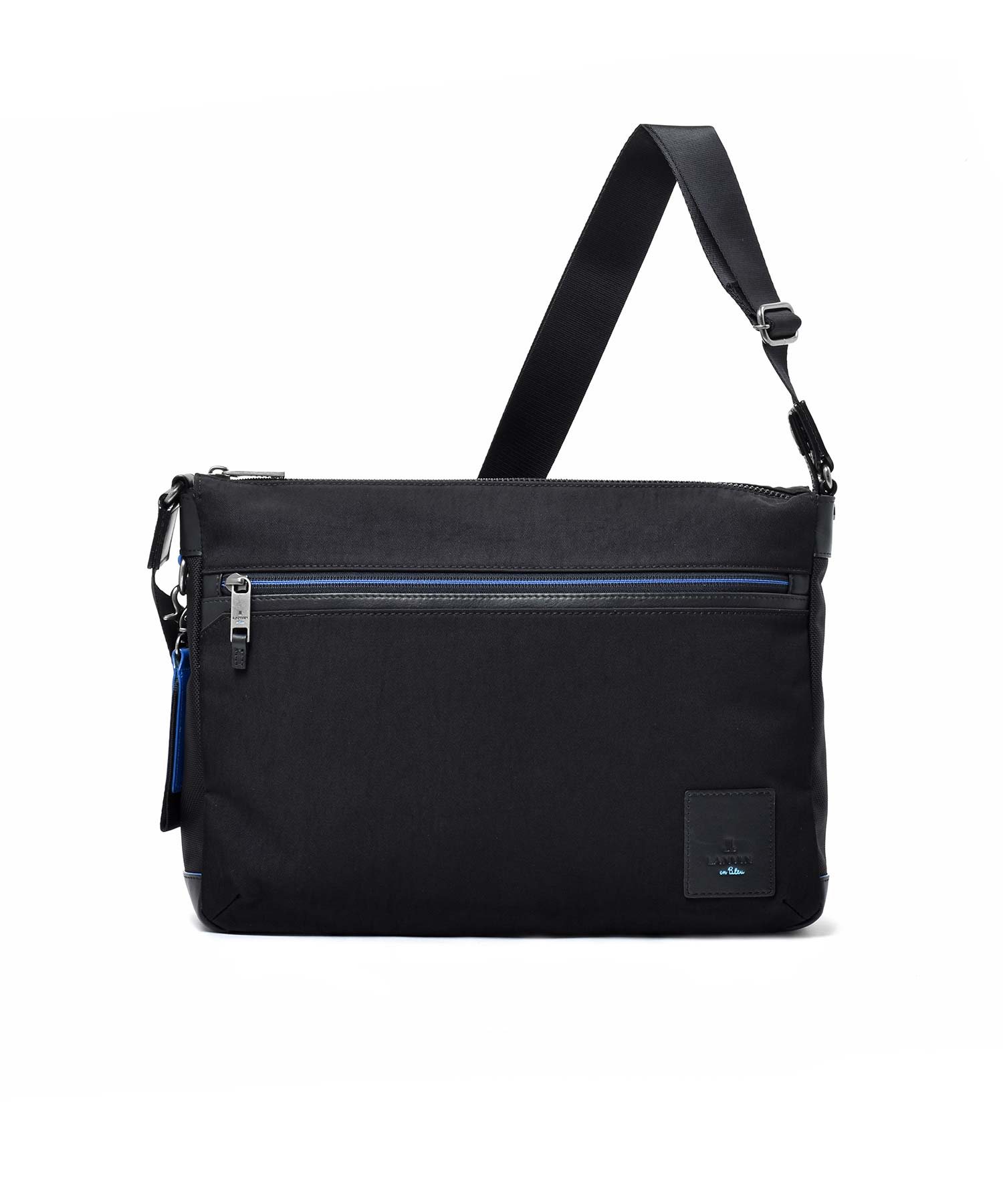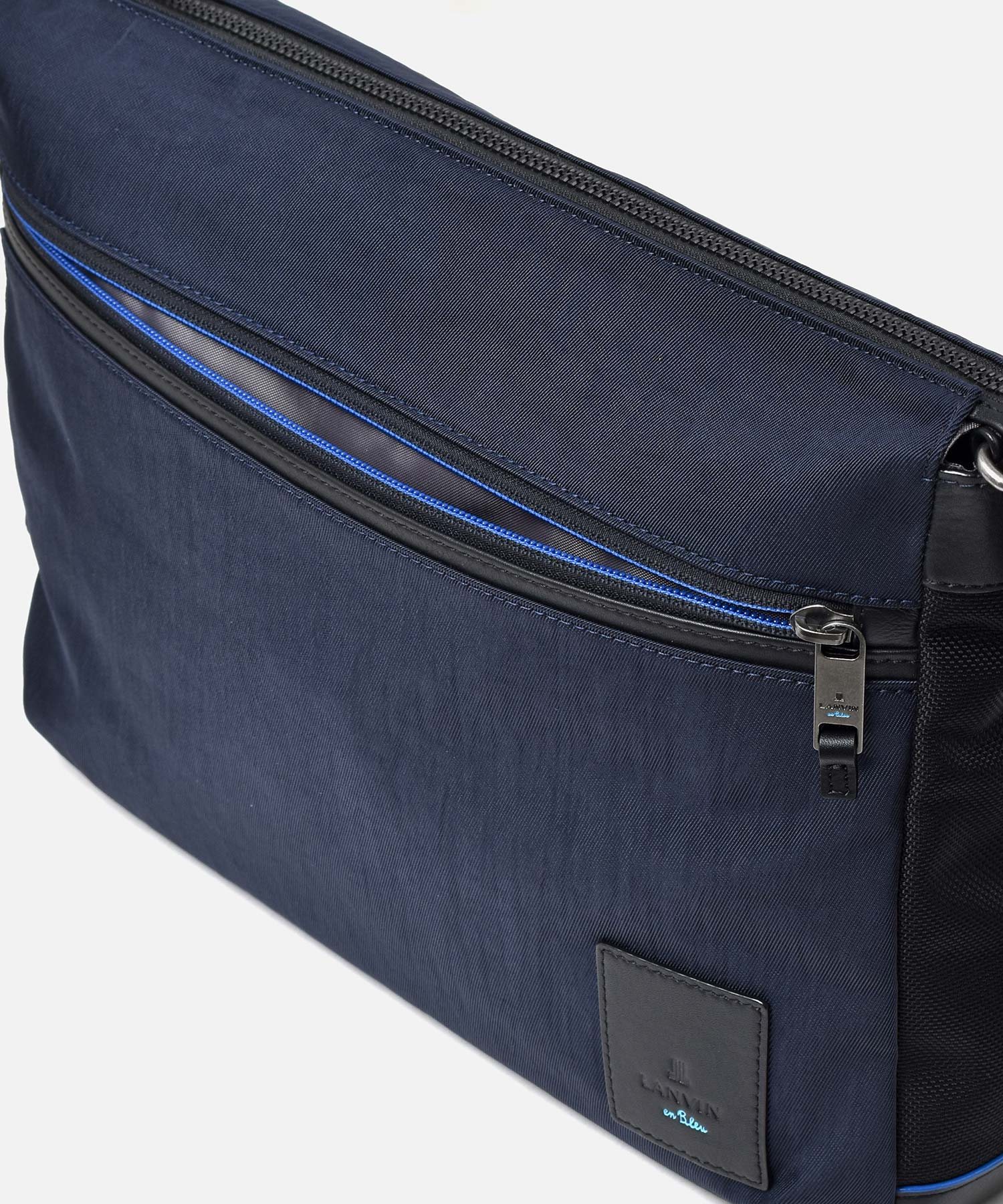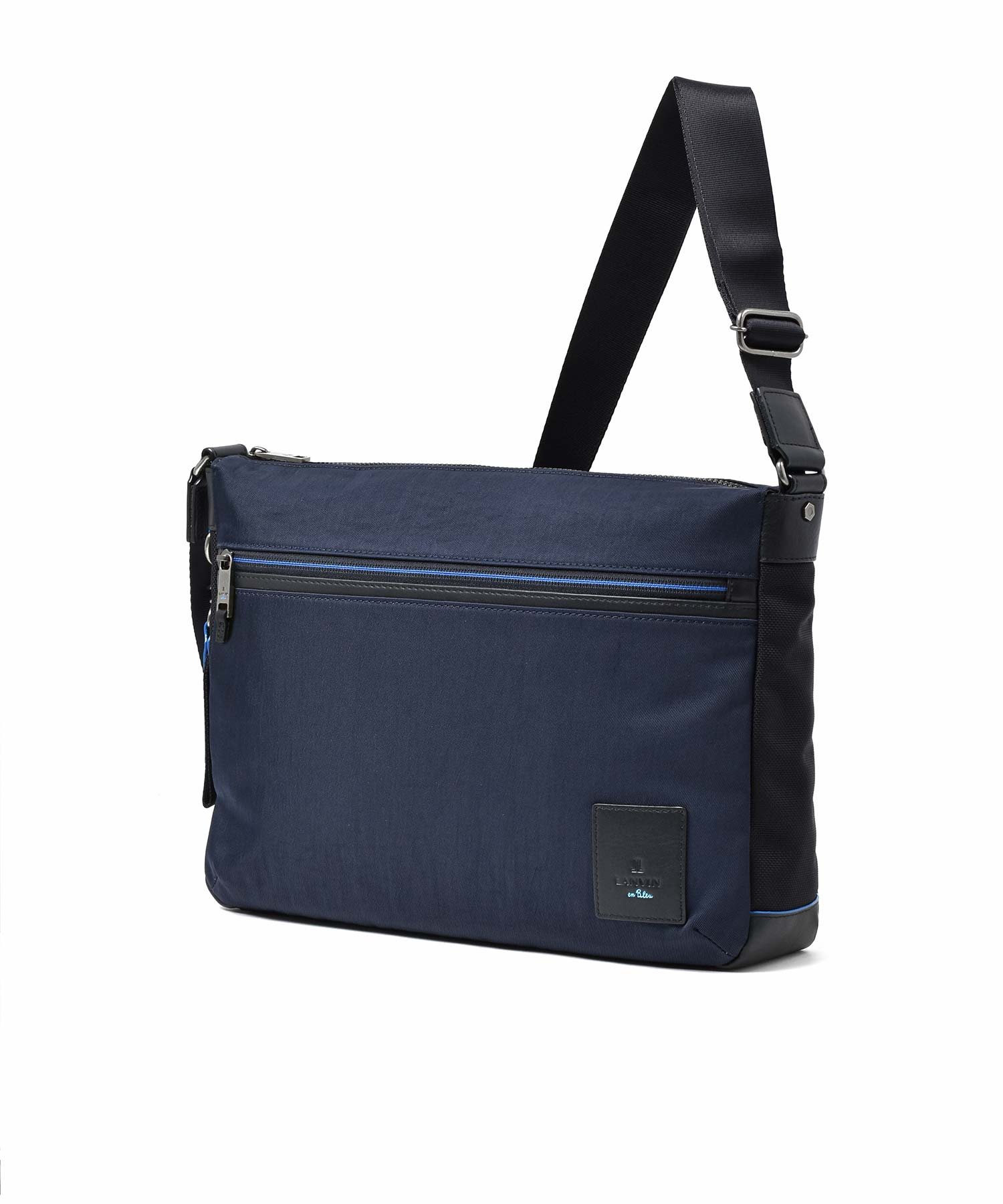 ナイロン×牛革のメリハリのある素材感が特徴的なランバンオンブルーのA4サイズショルダーバッグ。中央に細いブルーのラインが入ったオリジナルファスナーを使用し、随所にもブルーのパーツを用いてランバンオンブルーらしさを表現しました。機能的かつ軽量に仕上げており、デイリーユースから旅行まで様々なシーンでお使いいただけます。