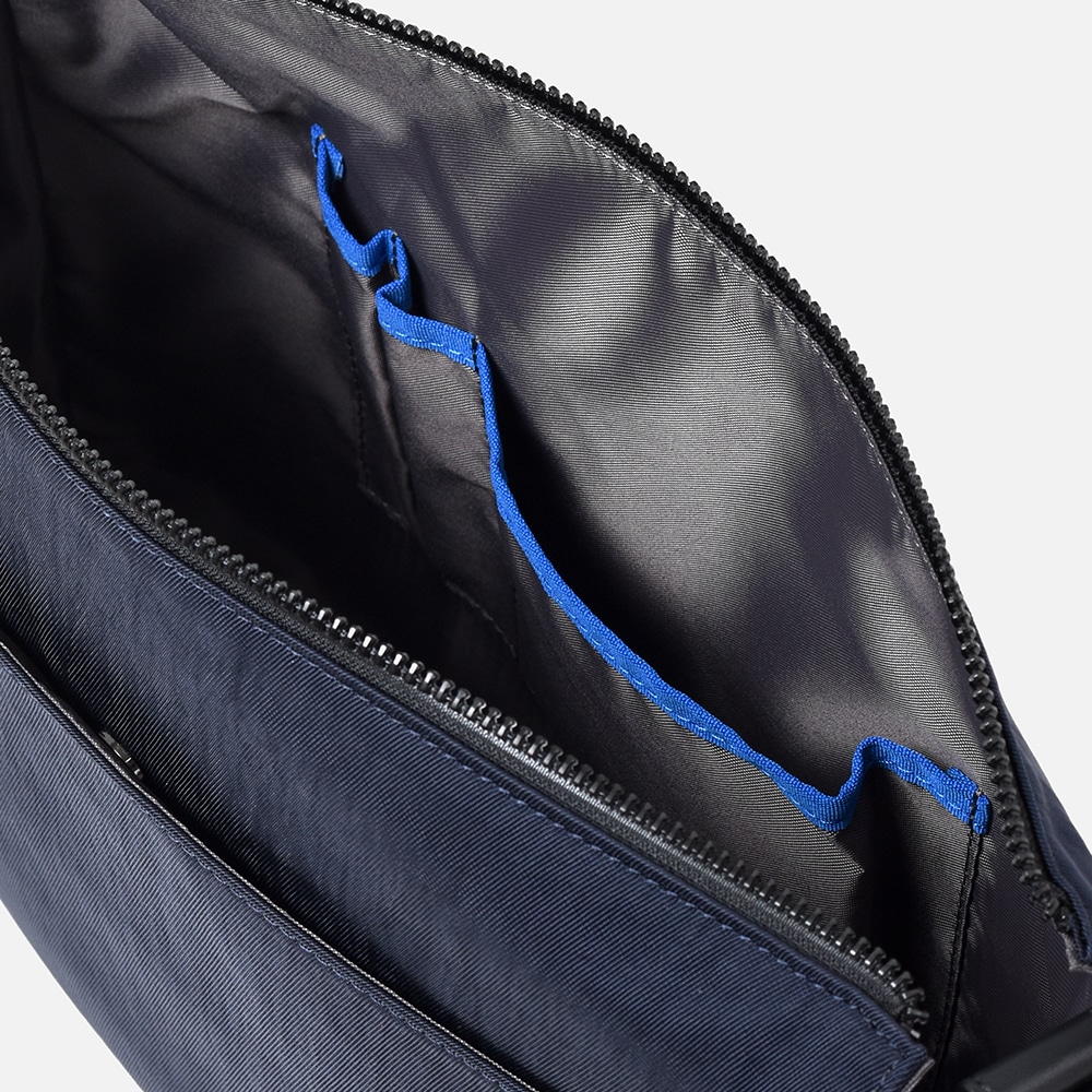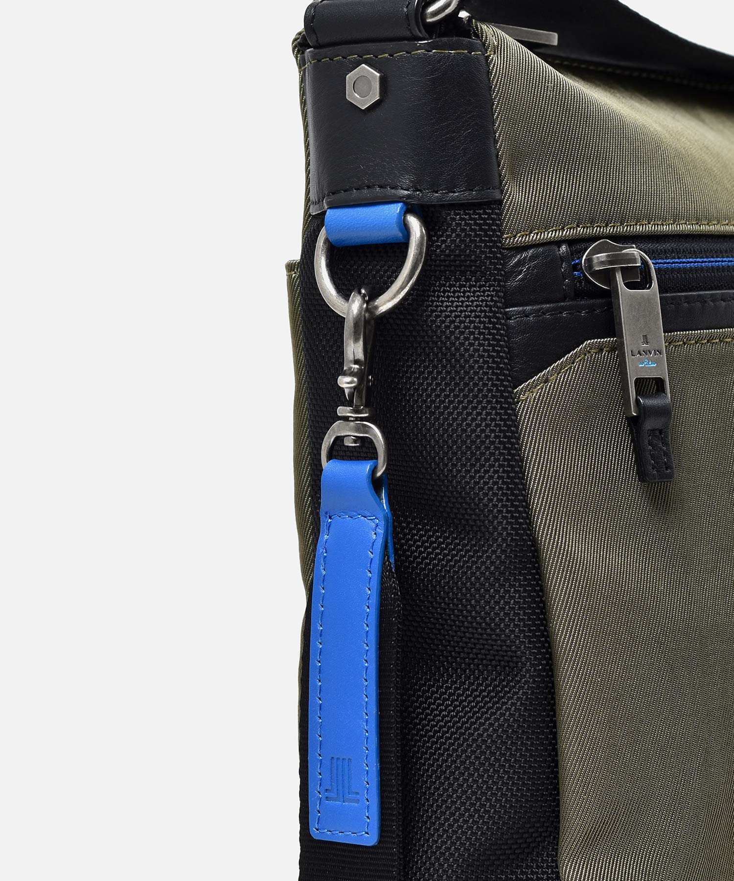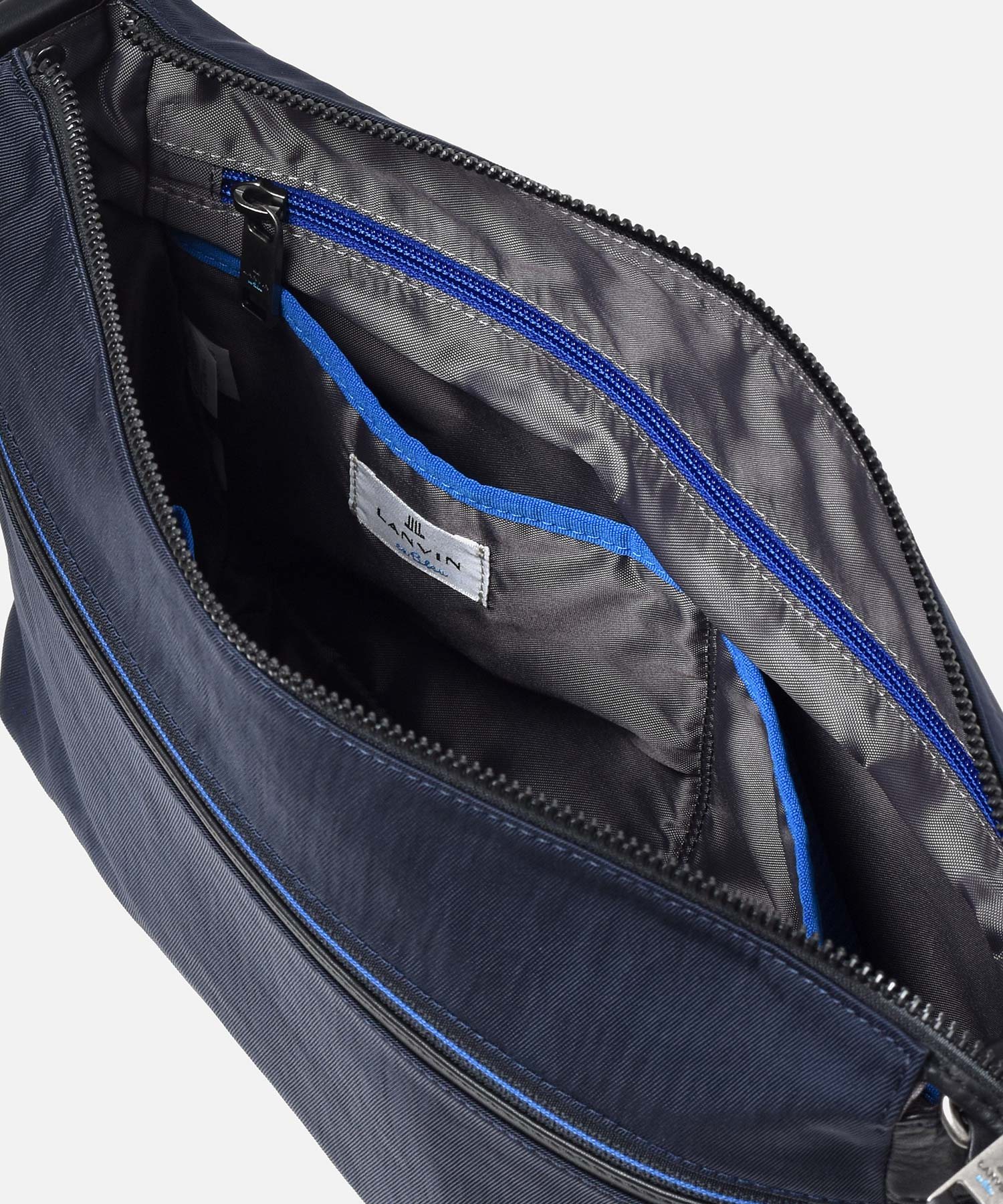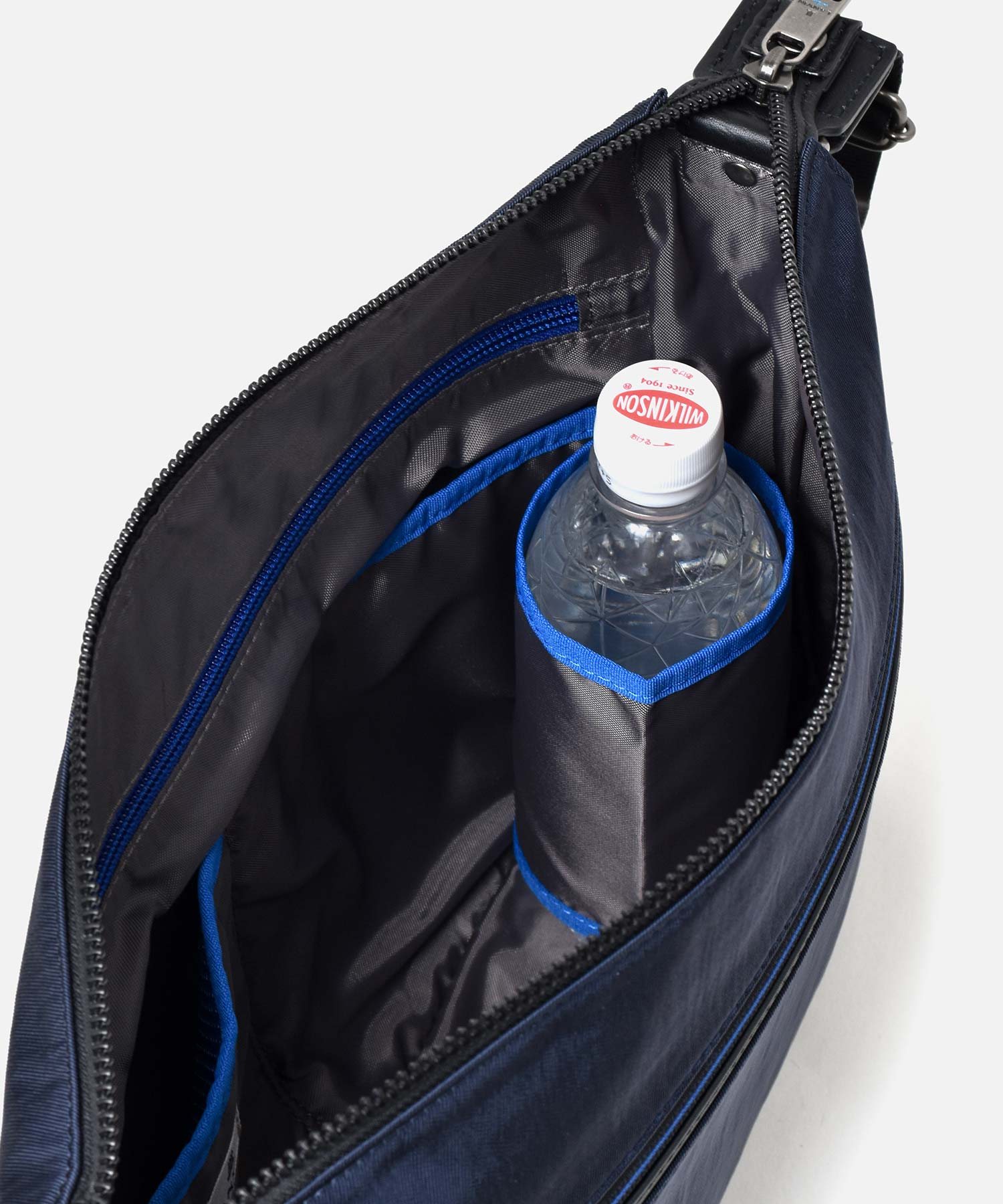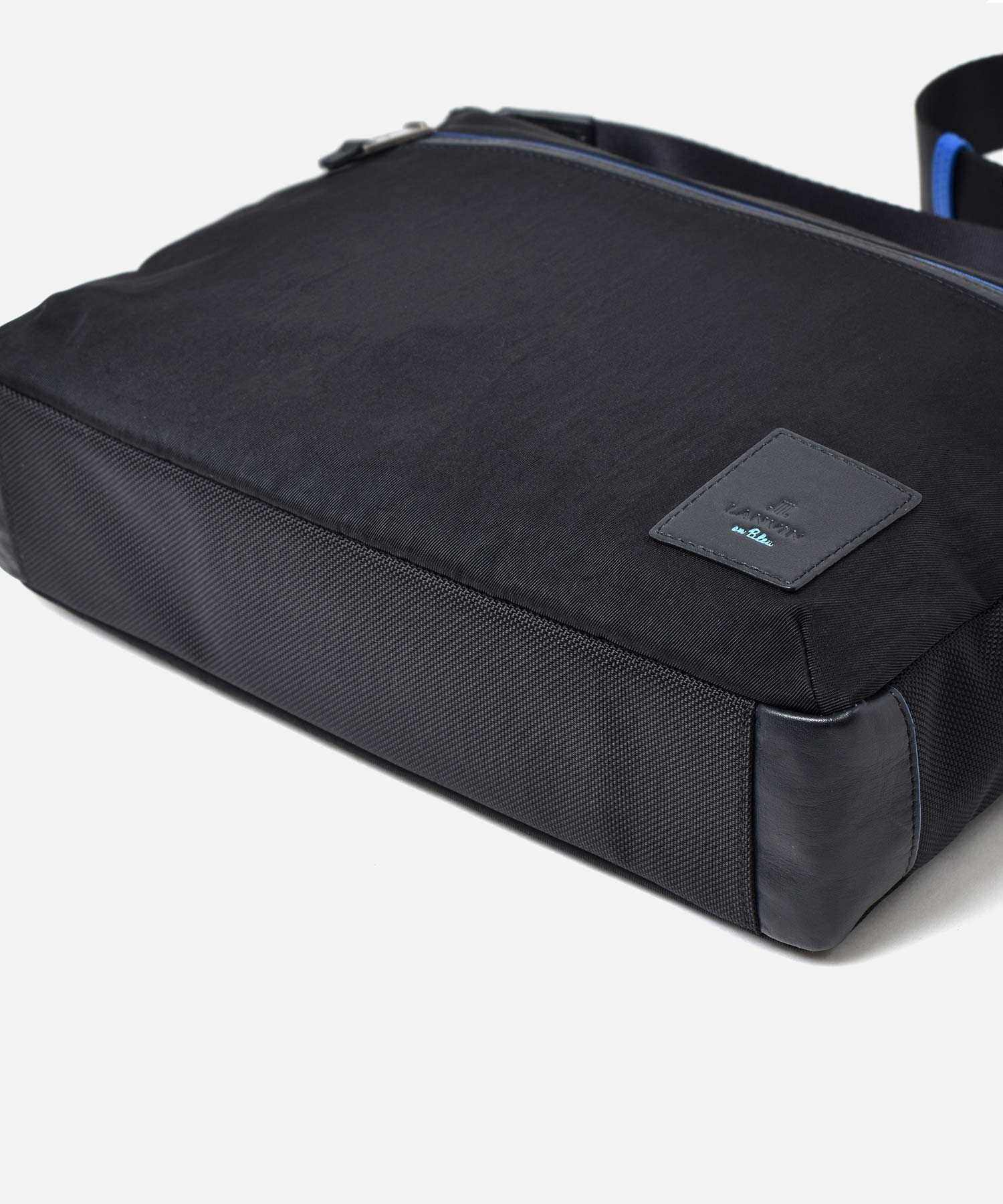 ナイロン×牛革のメリハリのある素材感が特徴的なランバンオンブルーのA4サイズショルダーバッグ。中央に細いブルーのラインが入ったオリジナルファスナーを使用し、随所にもブルーのパーツを用いてランバンオンブルーらしさを表現しました。機能的かつ軽量に仕上げており、デイリーユースから旅行まで様々なシーンでお使いいただけます。