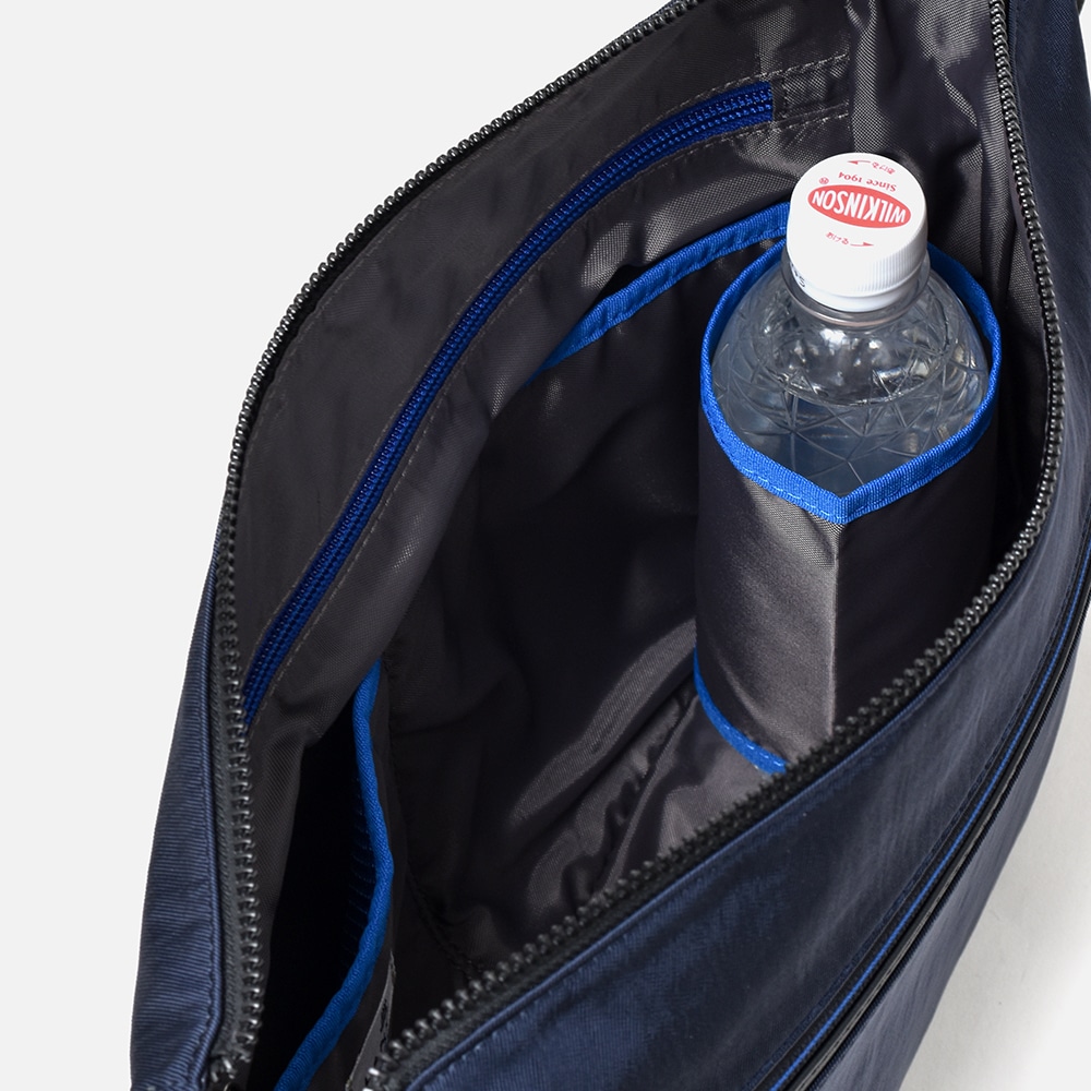 総重量530gの軽量仕様、A4ノートがすっぽり入るサイズ感になっております。前面にファスナーポケット、背面にはマグネット式のオープンポケットがあります。内装機能はオープンポケット×3、ファスナーポケット、ペン差し×2に加え、ペットボトルホルダー付属となっております。また、側面のJLマークチャームは取り外し可能になっており、キーホルダーとしてもお使いいただけます。