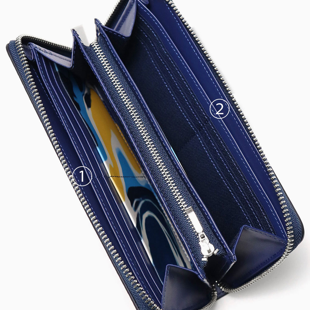 抽象的なマーブル柄を、エンボス加工したレザーで表現した長財布。繊細なツートーンでの染色と最終の加工で光沢感を調整し、素材の奥行き感を出してエンボスを引き立てています。ランバンオンブルーらしい個性的な素材で、大人な雰囲気を演出しています。内装の一部にもインパクトあるマーブル柄のプリントを施しており、本体素材とのギャップ感も魅力です。