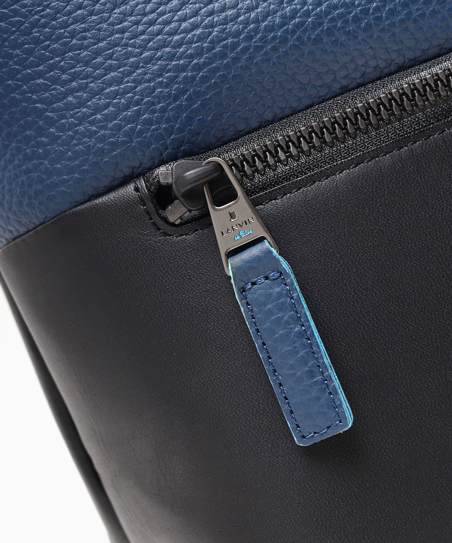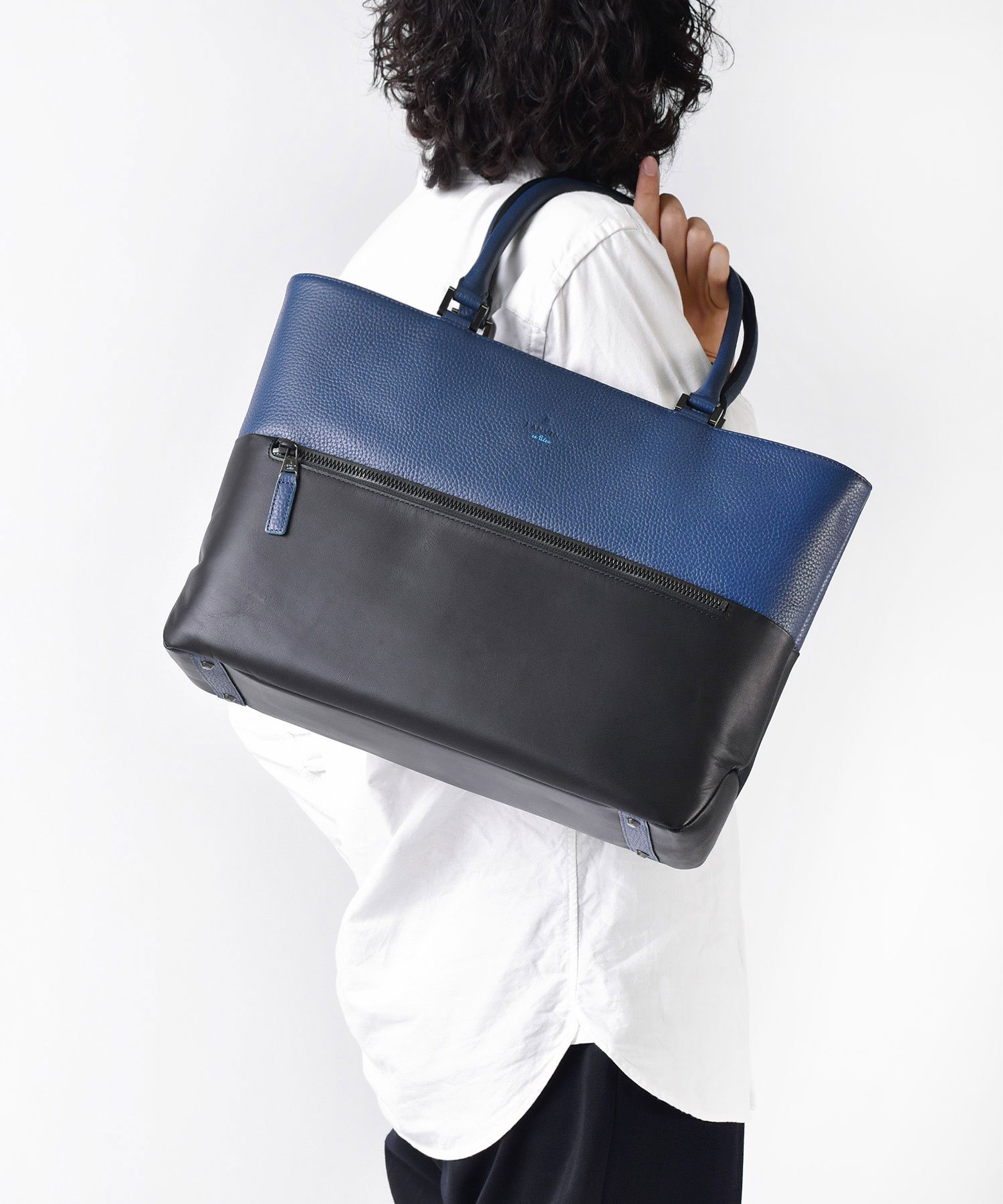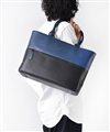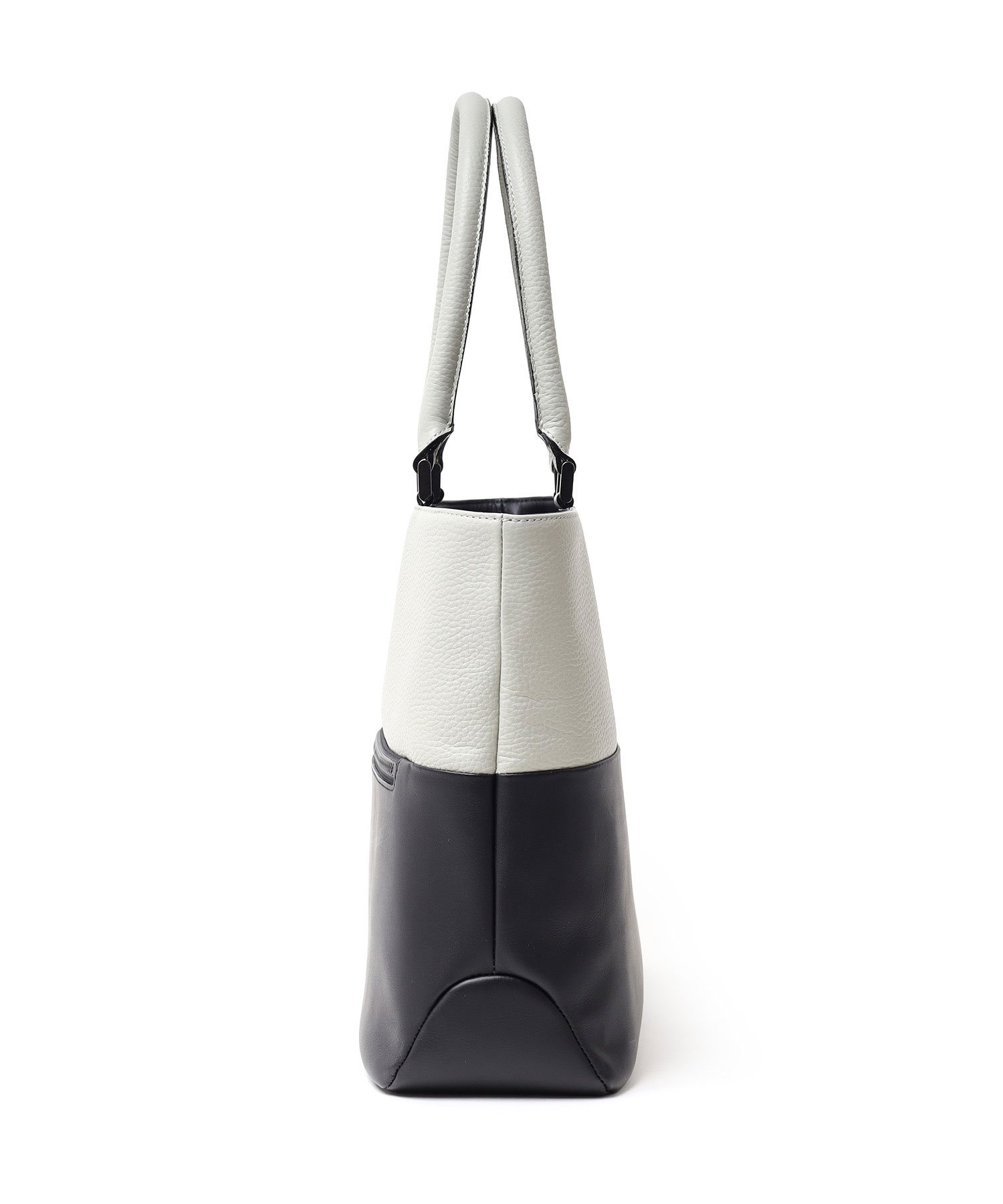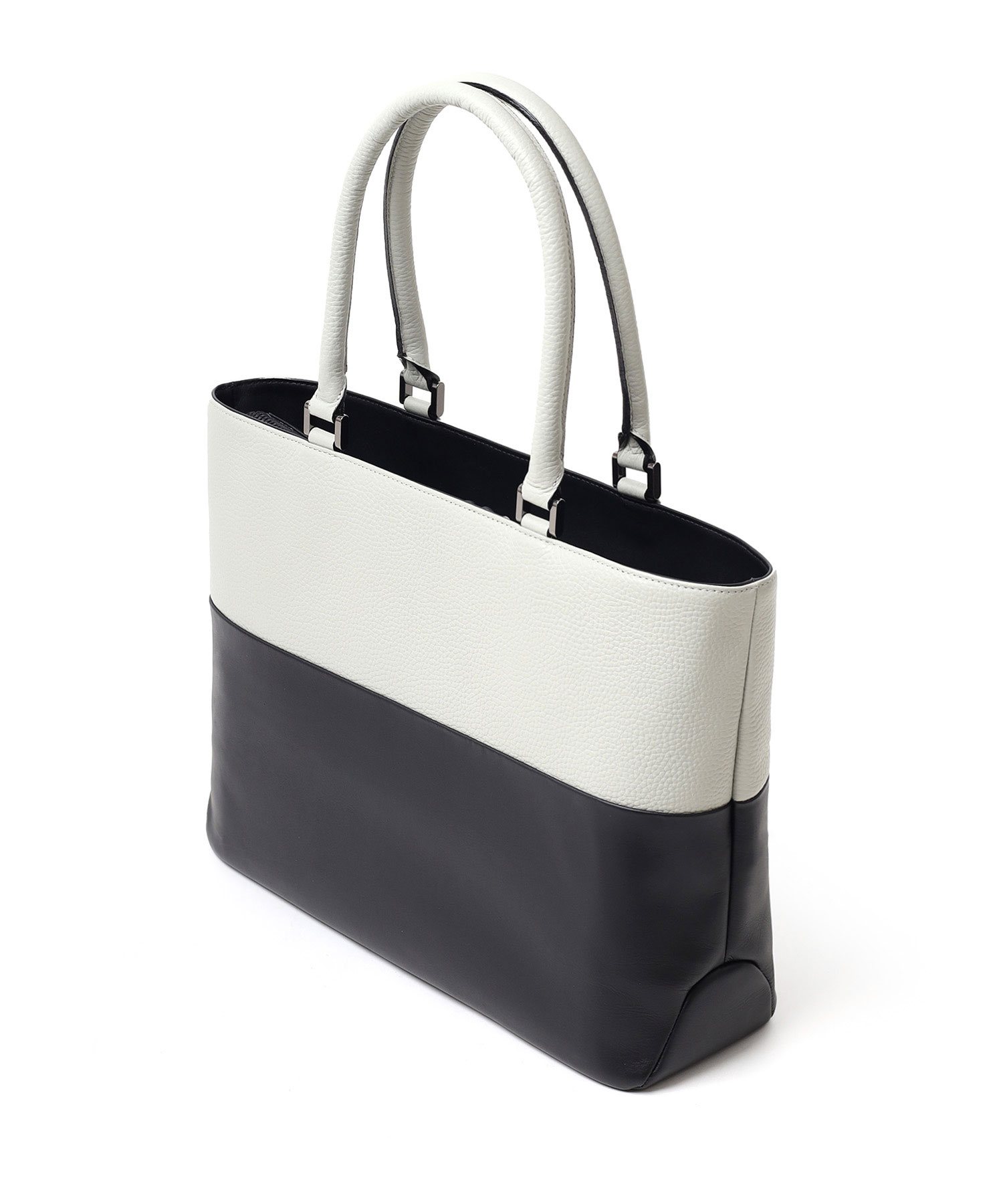 大胆なバイカラーと異素材ミックスが特徴の、A4サイズのカジュアルレザートートバッグ。カラーはランバンオンブルーらしいブルー、爽やかなシロ、シックが好きな方におすすめのクロの3色展開。
