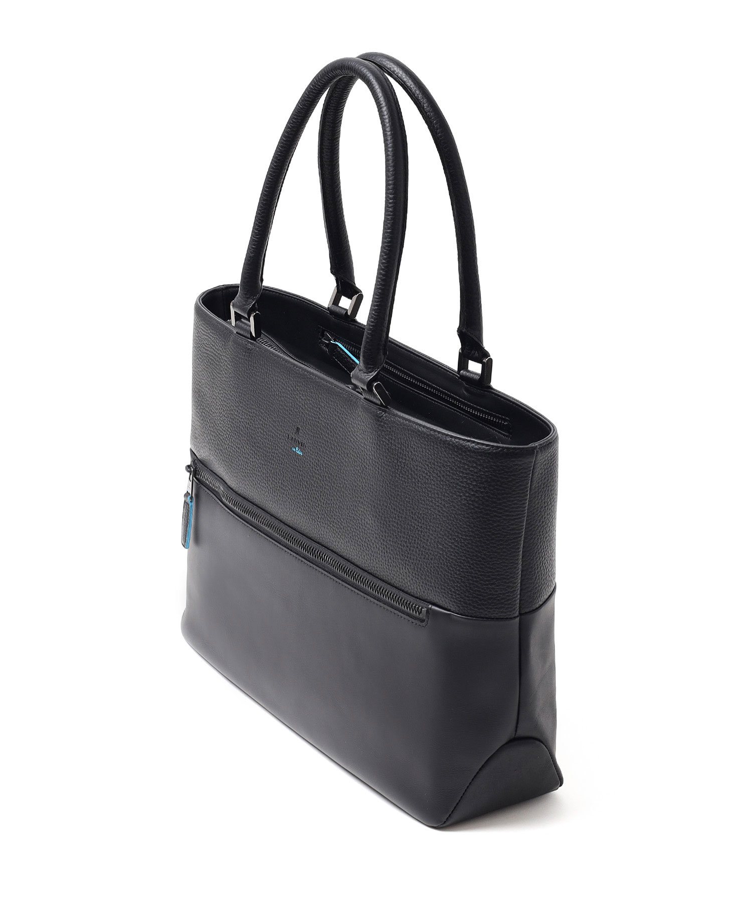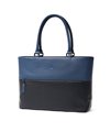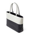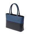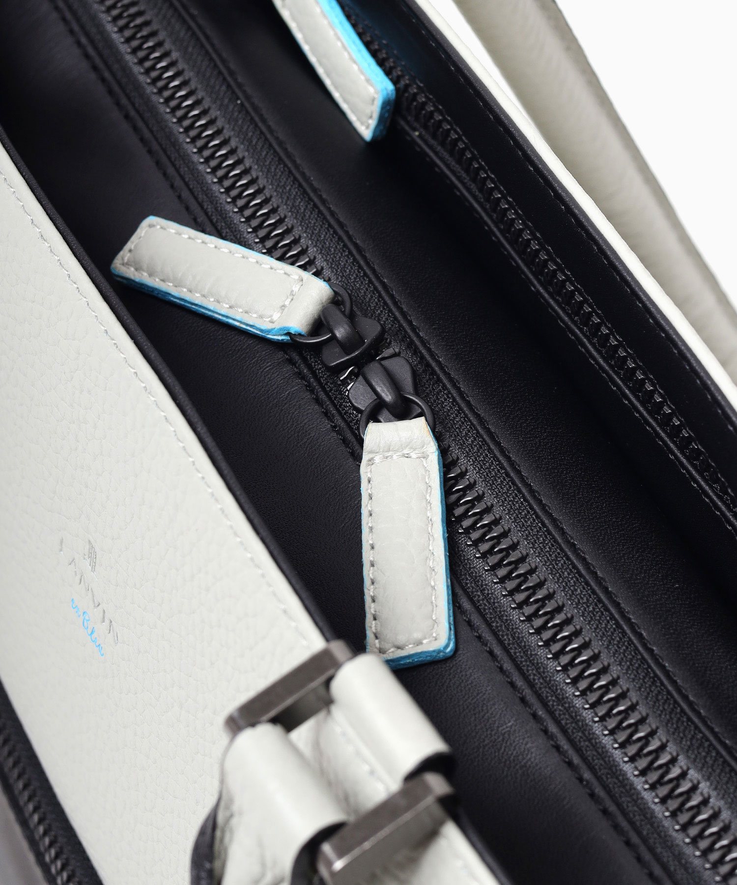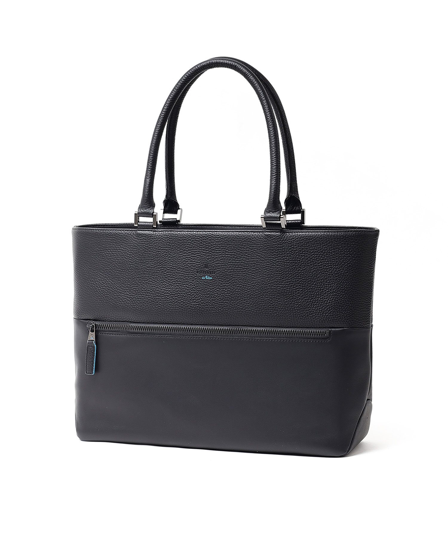 大胆なバイカラーと異素材ミックスが特徴の、A4サイズのカジュアルレザートートバッグ。カラーはランバンオンブルーらしいブルー、爽やかなシロ、シックが好きな方におすすめのクロの3色展開。