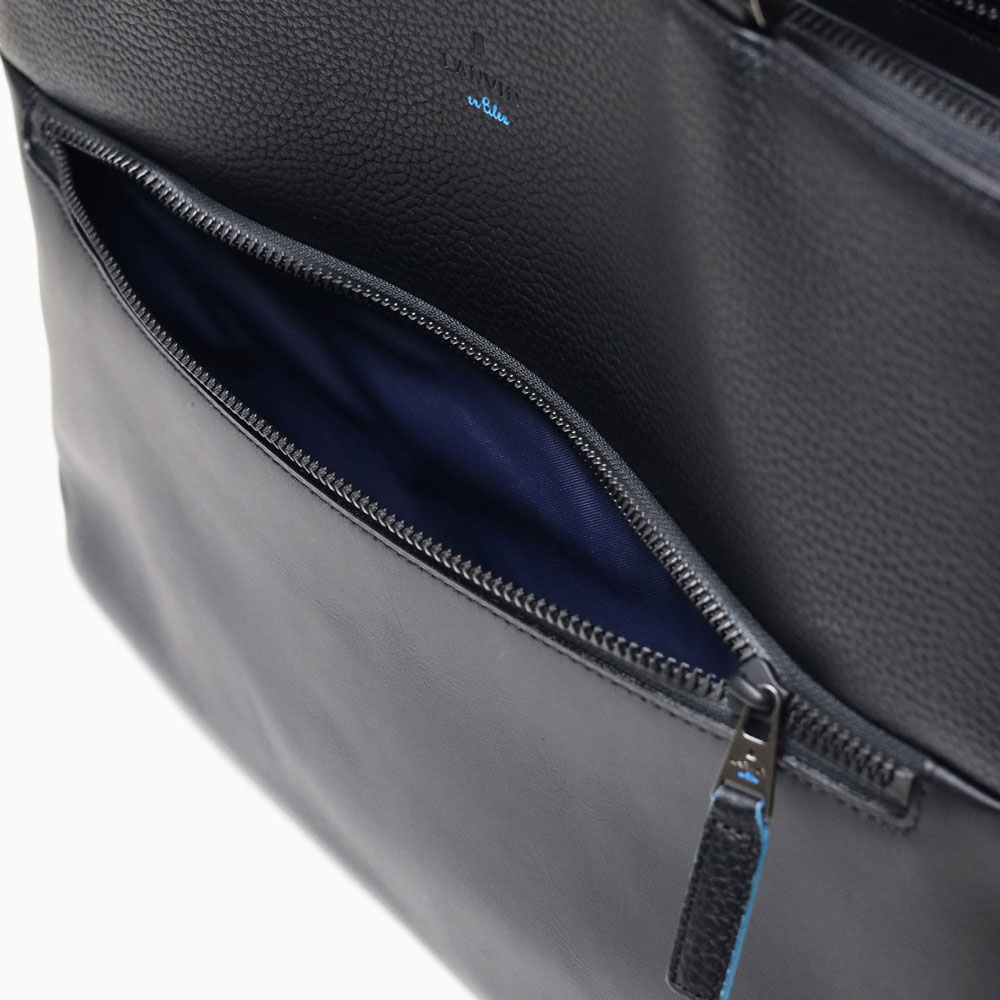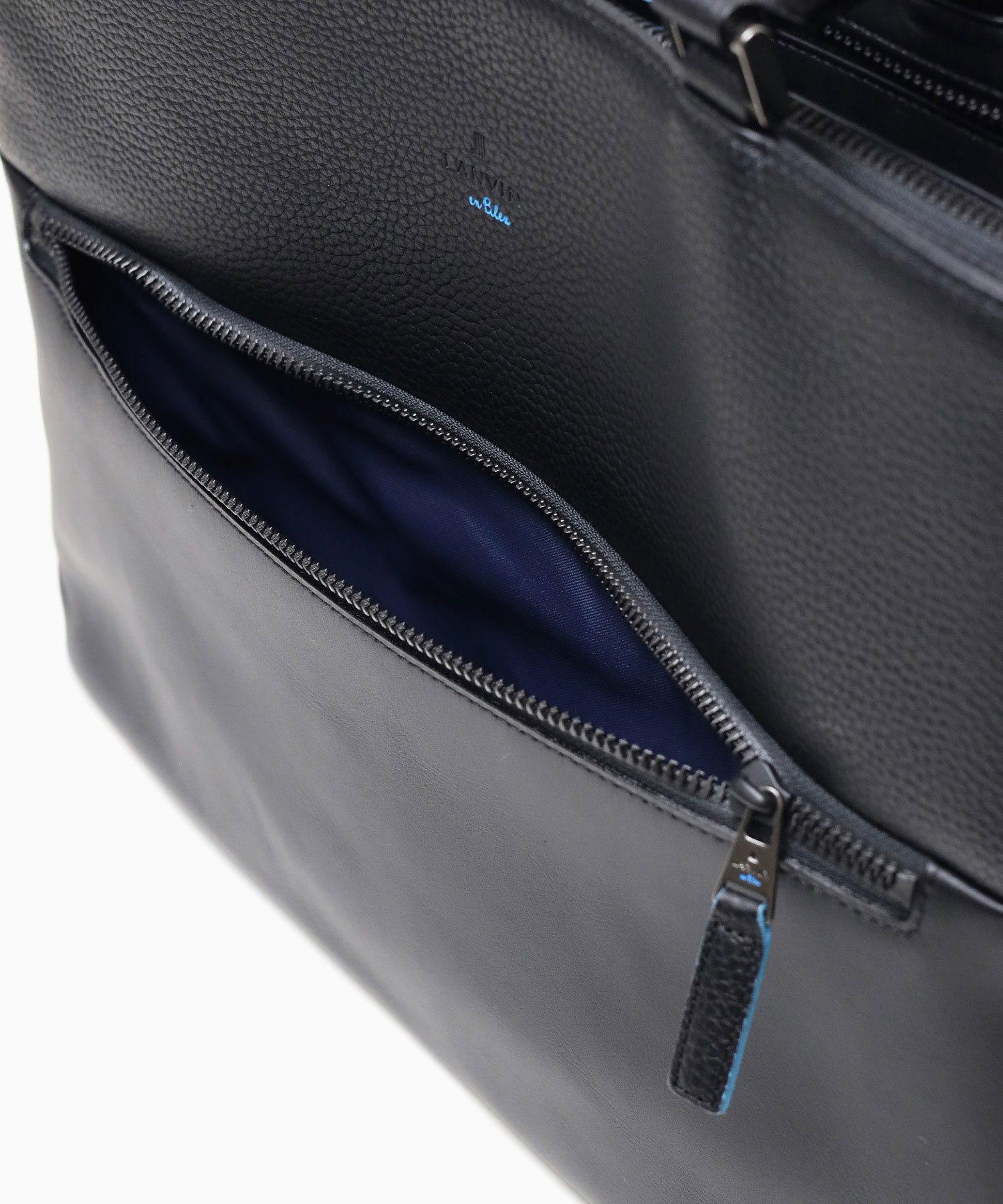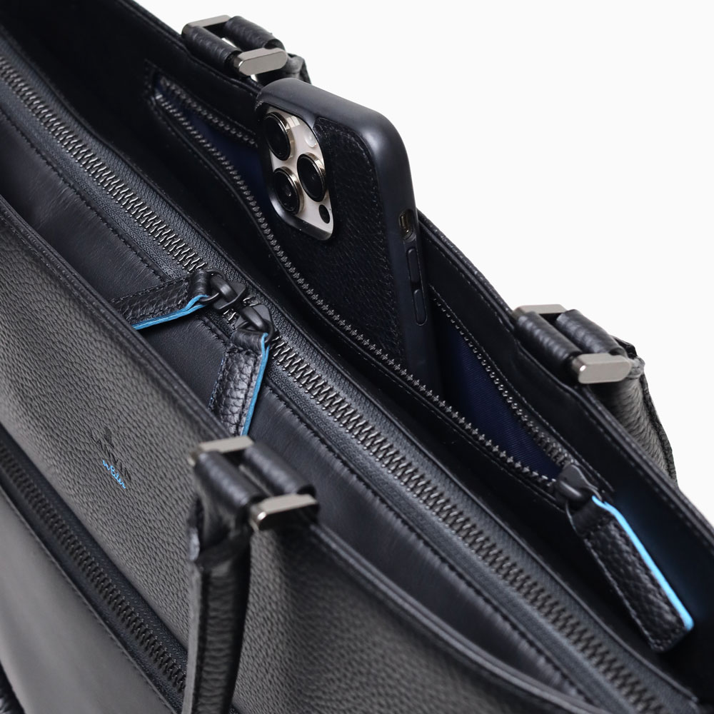 メインルームはA4ファイルが収納可能なサイズで、ファスナーポケット、オープンポケットが2つ、PC収納ポケット(13.3インチ対応)があります。前面や天部分にはファスナーポケットがあり、スマホや小物類の収納に便利です。