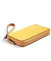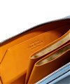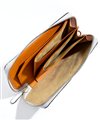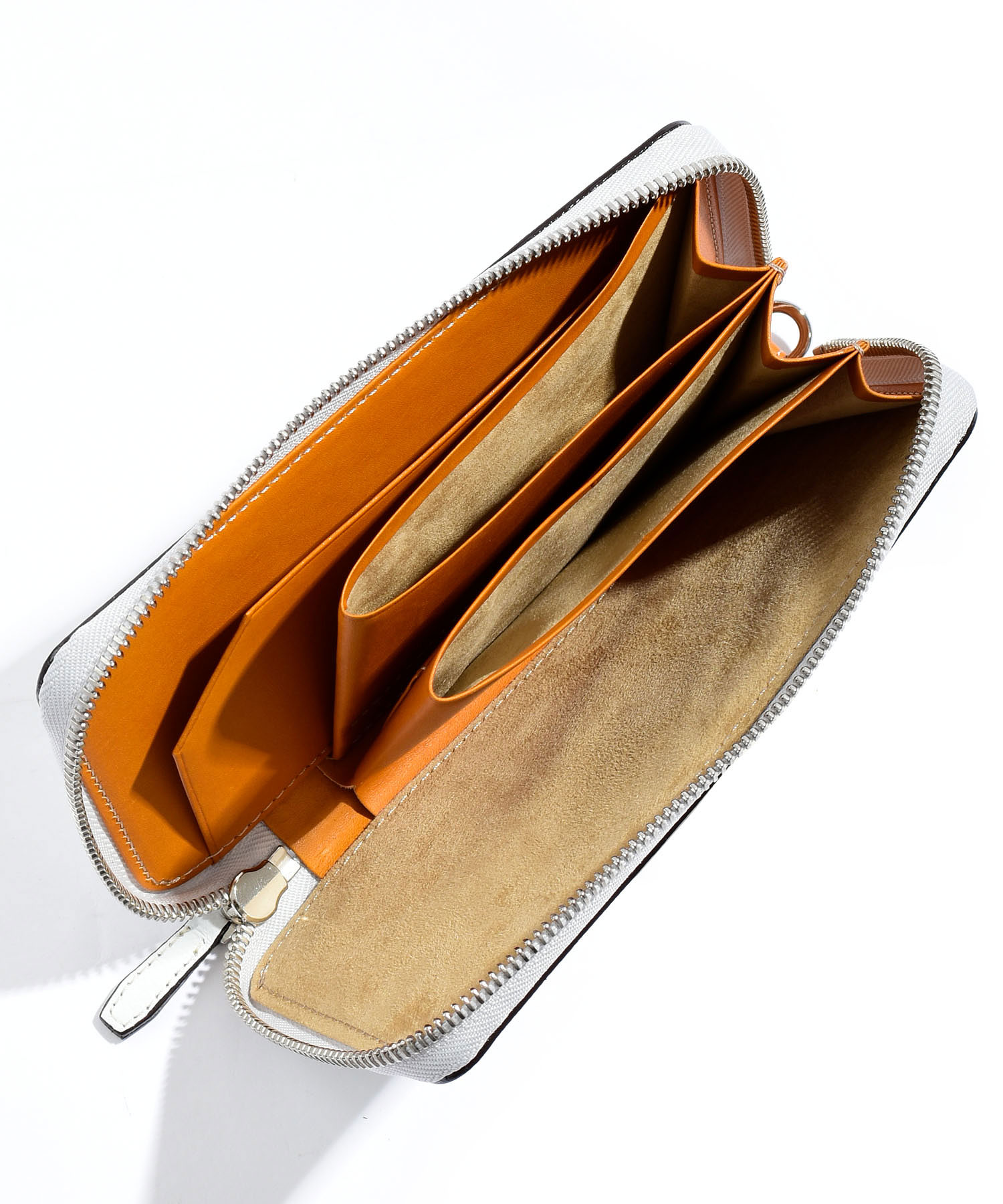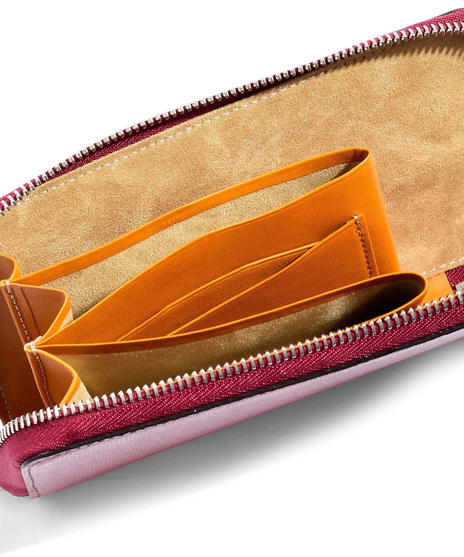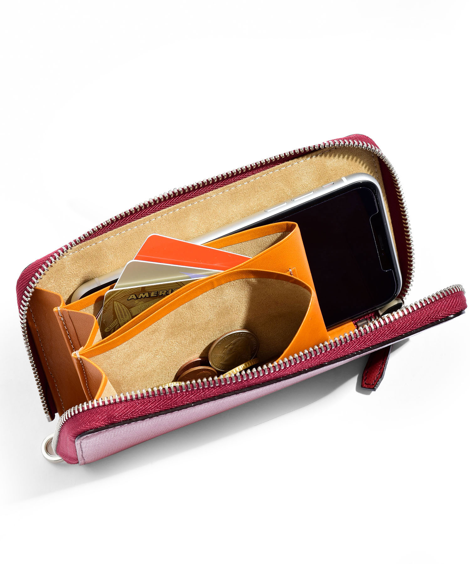 内装のベージュ部分にはスウェード素材を使用。スマートフォンを優しく包み、傷つけることなく収納が可能です。また小銭、カードをまとめて収納するスペースをそれぞれ装備。財布としての機能はしっかりと持ちながらスマートフォンまで収納できる、今の時代にぴったりのアイテムです。