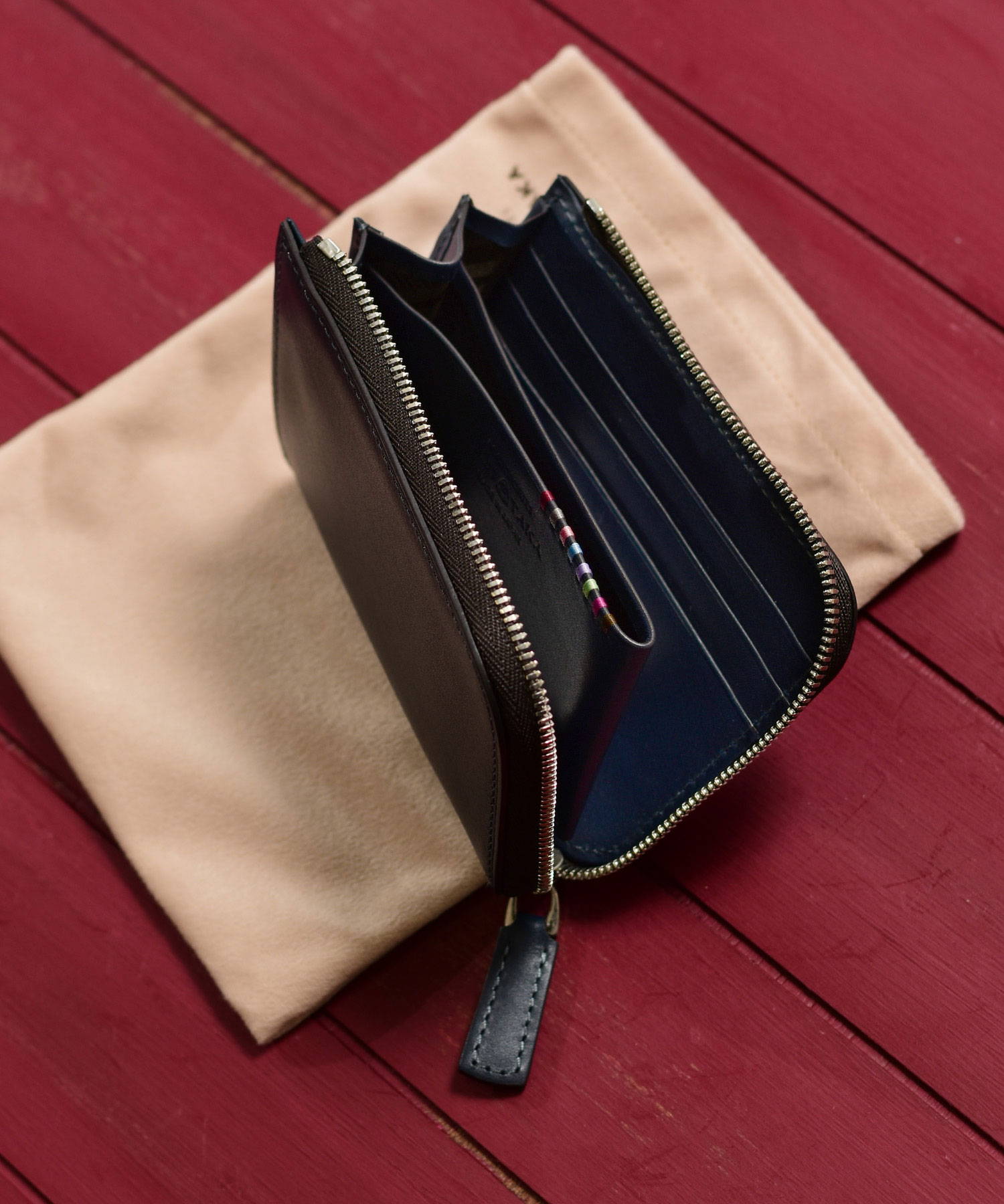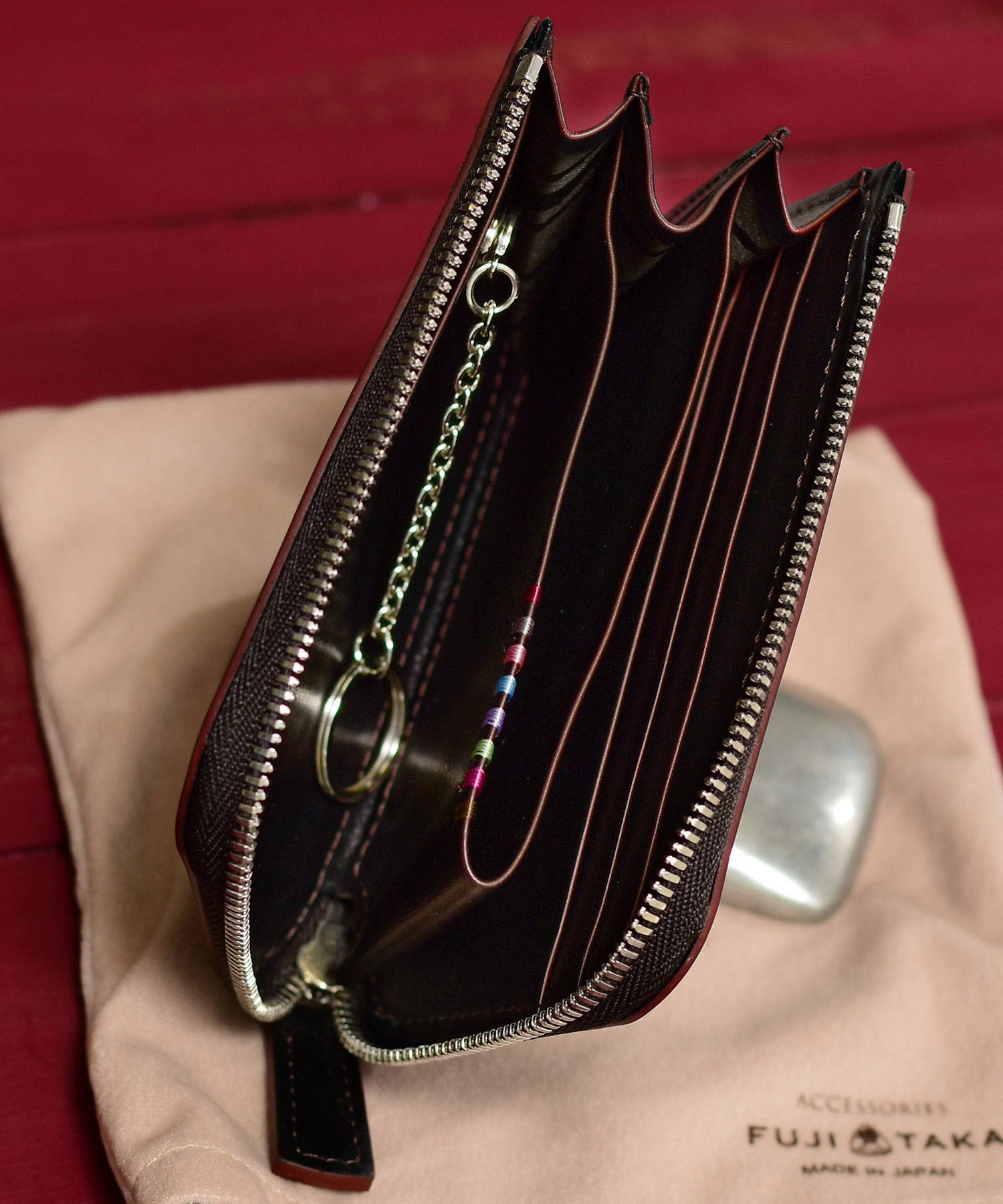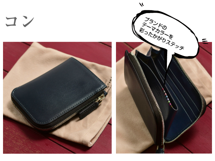 財布の内側には、片側にカード段が3段、反対側にカード段が1段と取り外し可能なキーチェーンが付いています。手掛かりステッチがほどこされたセンターポケットには小銭の収納が可能。お札を折って入れれば、これ一つでお出かけもお任せです。