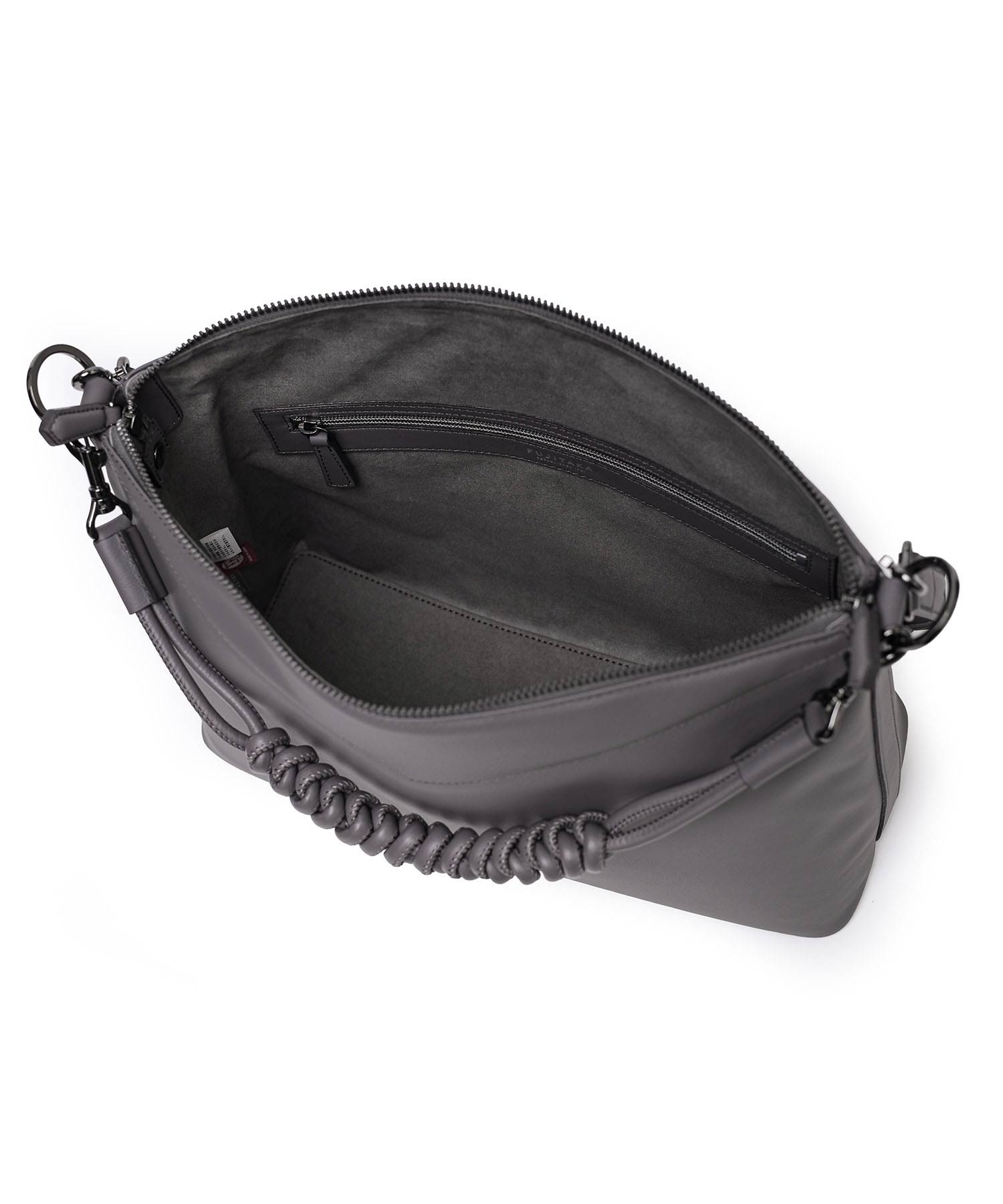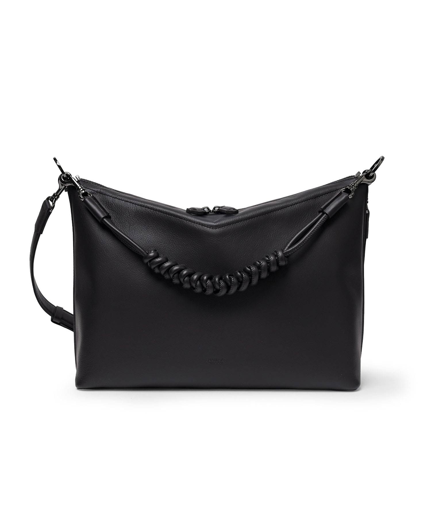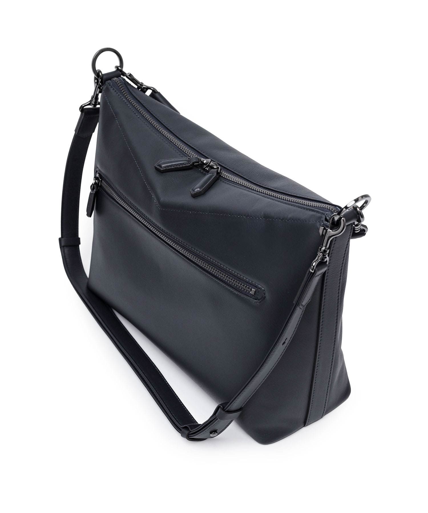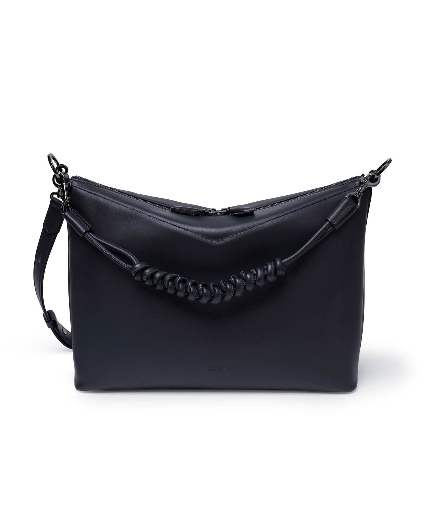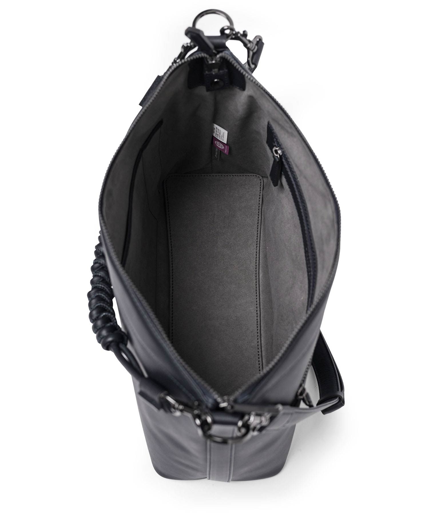 バッグの内側にはホック付きポケットとファスナーポケット、ペンさしが1つずつあります。天マチを広げることでA4サイズの書類が収まる設計。ゆとりある収納力でビジネスにも対応します。ショルダーベルトには、ギボシ式の長さ調整を採用。調整後の余りベルトもスマートに収まるよう、スライドループ仕様とし、美しい佇まいを保ちます。また底面には身体に沿うよう緩やかなカーブを設け、持ち心地にも配慮。デザイナーと職人のこだわりが、細部に宿るディテールです。