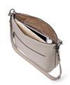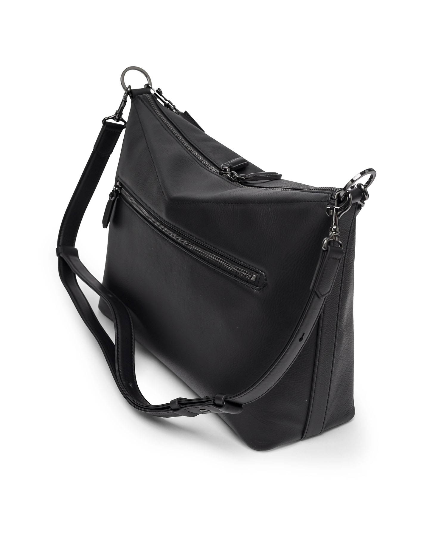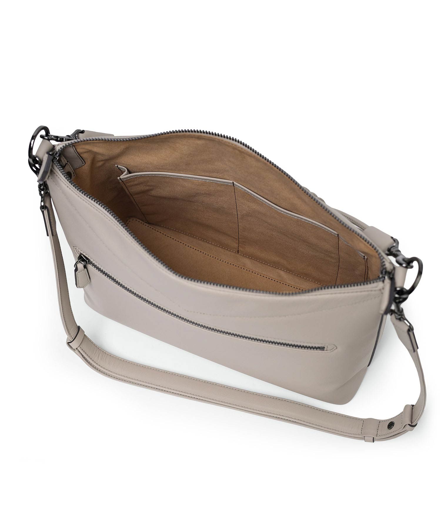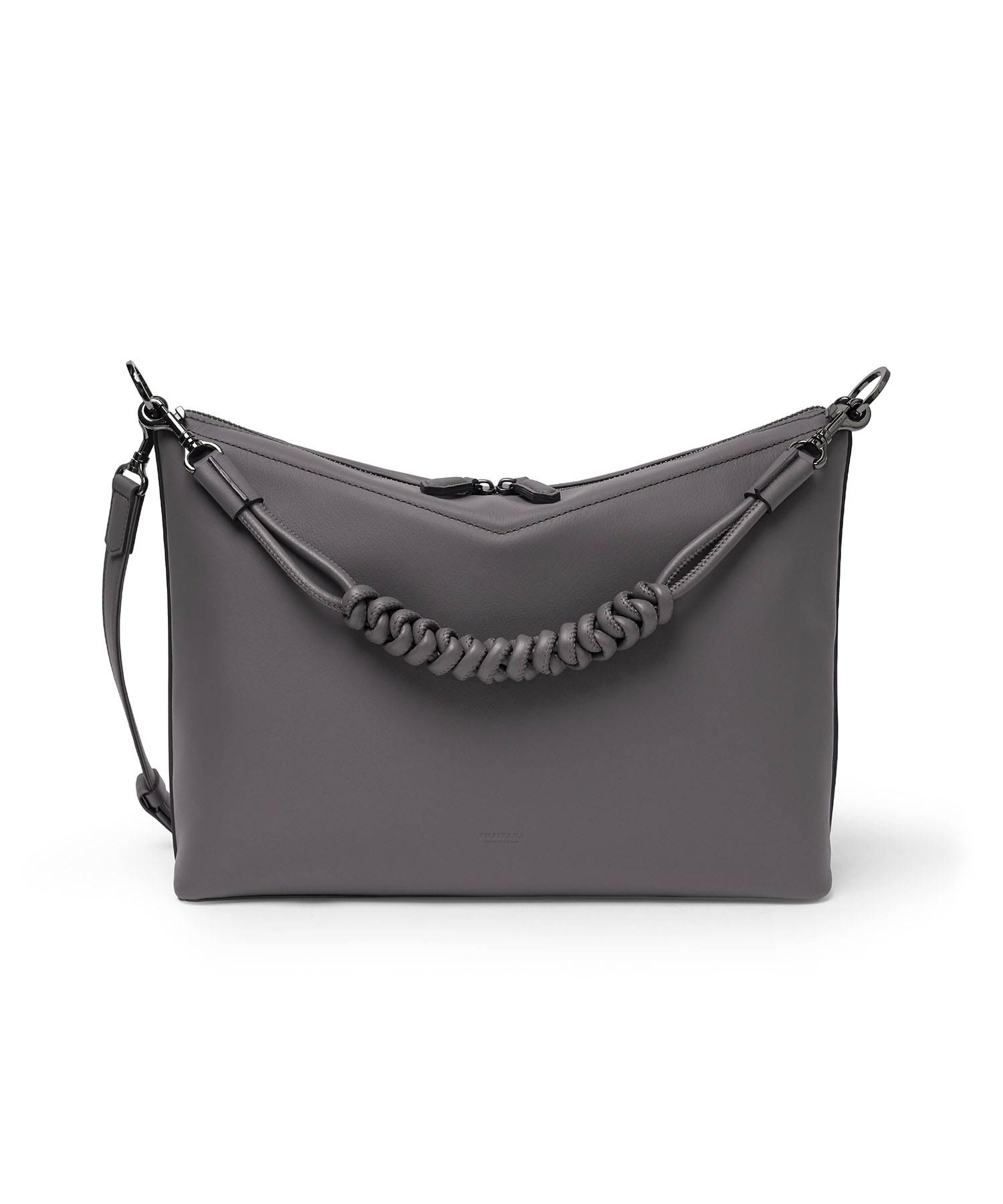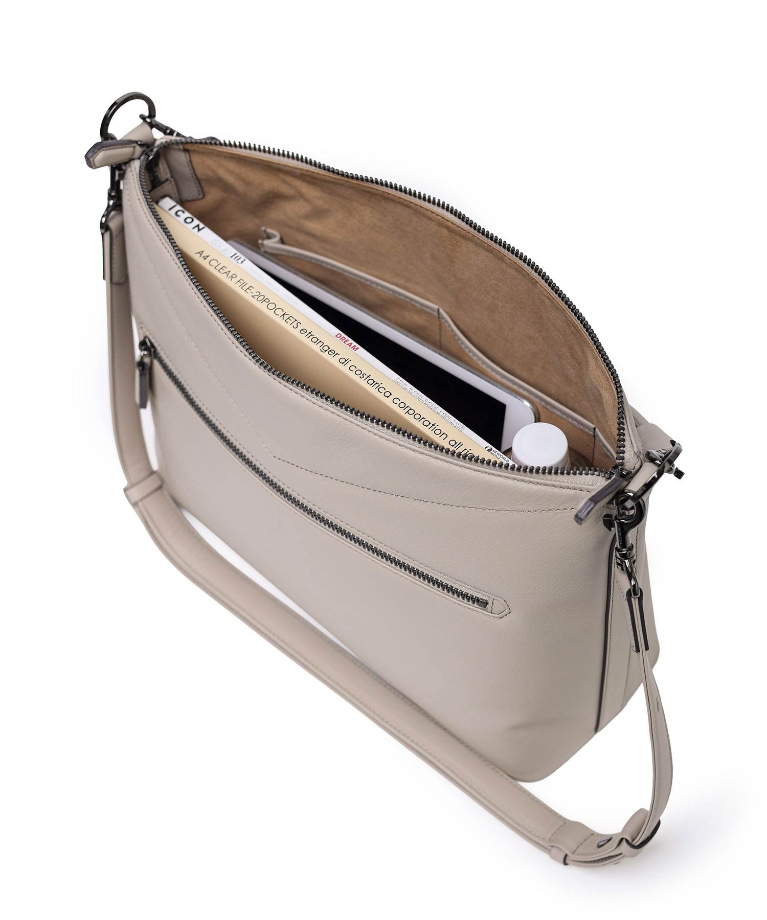 バッグの内側にはホック付きポケットとファスナーポケット、ペンさしが1つずつあります。天マチを広げることでA4サイズの書類が収まる設計。ゆとりある収納力でビジネスにも対応します。ショルダーベルトには、ギボシ式の長さ調整を採用。調整後の余りベルトもスマートに収まるよう、スライドループ仕様とし、美しい佇まいを保ちます。また底面には身体に沿うよう緩やかなカーブを設け、持ち心地にも配慮。デザイナーと職人のこだわりが、細部に宿るディテールです。
