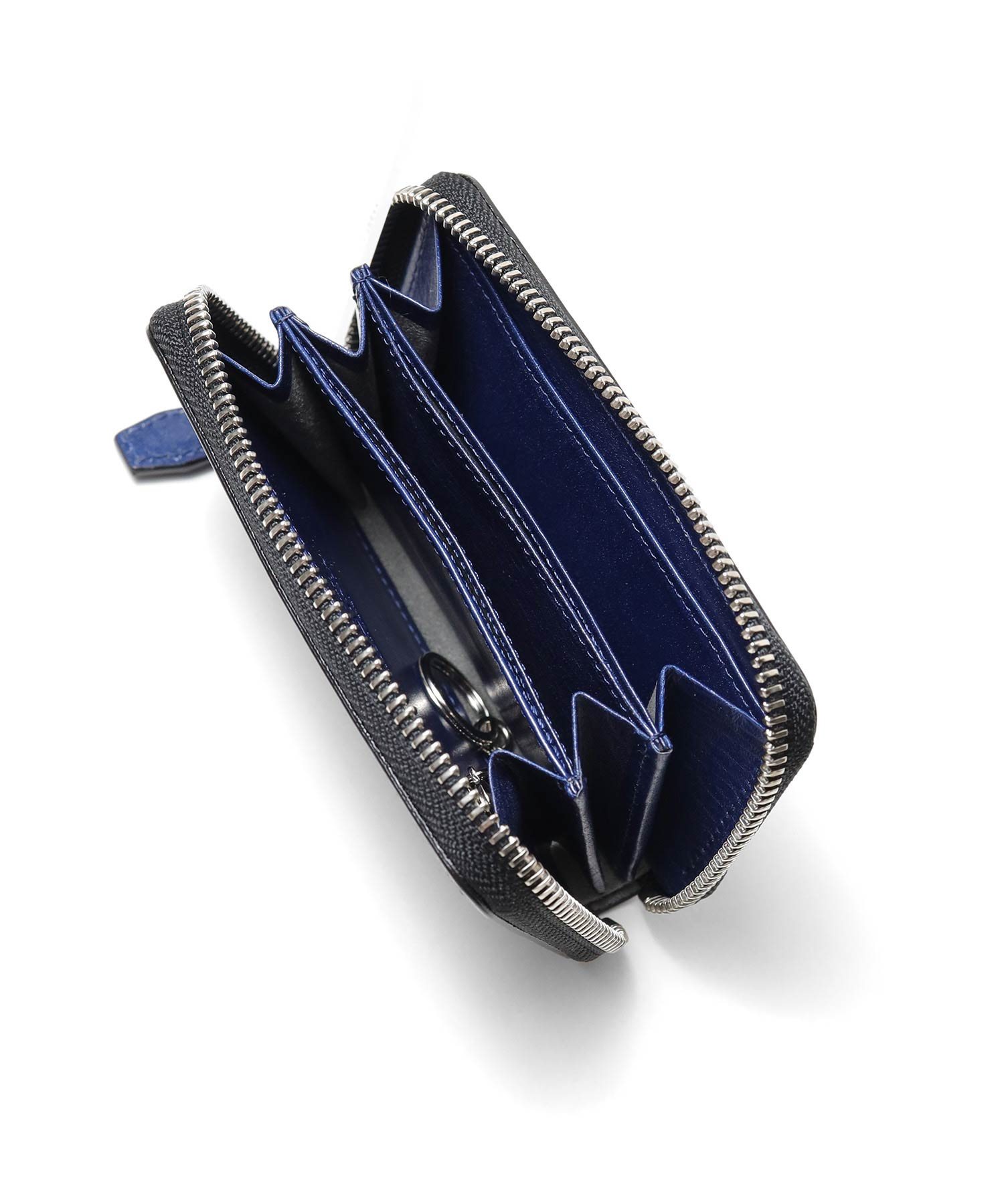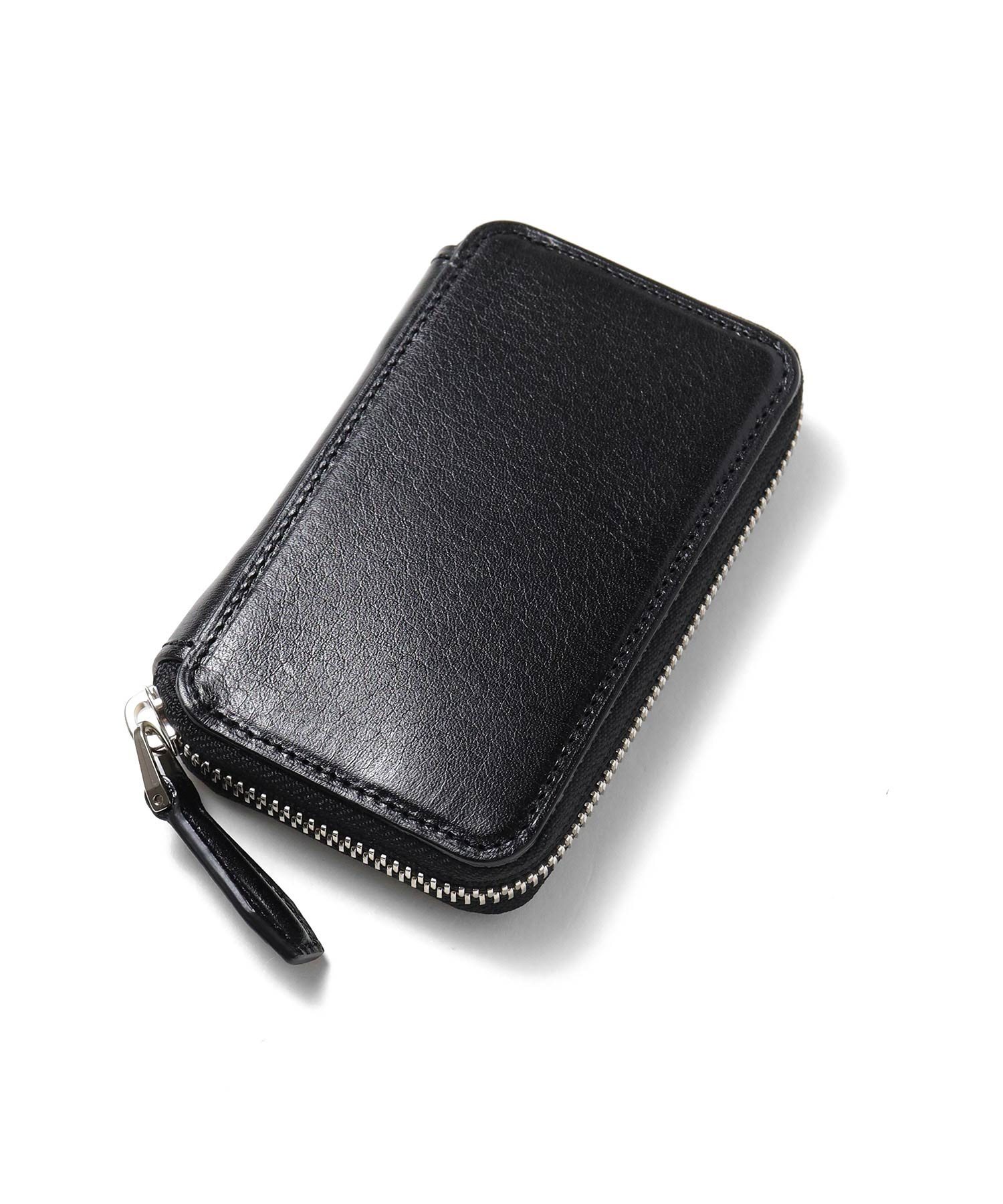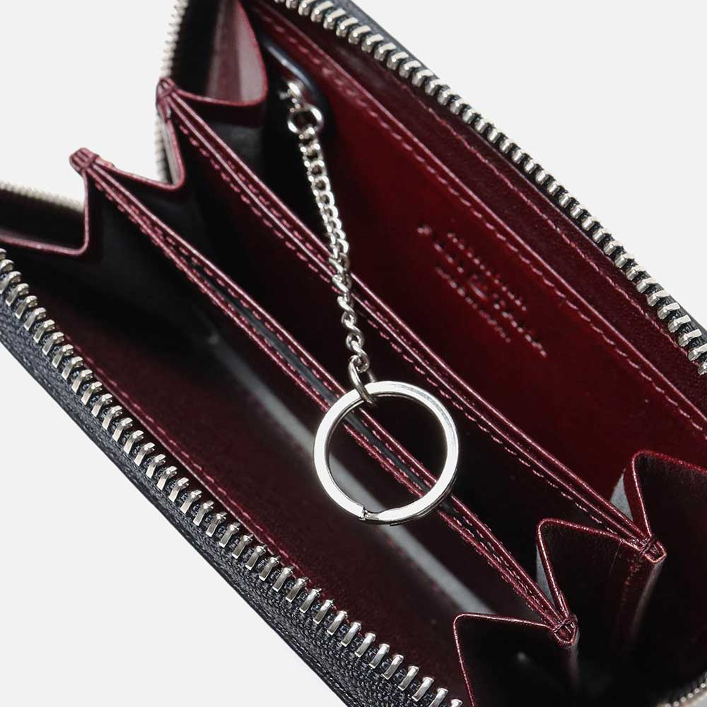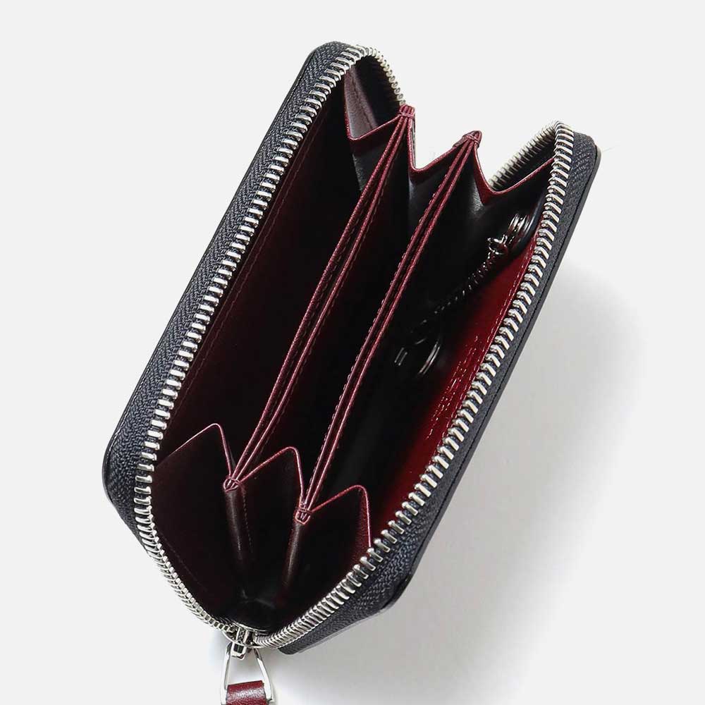 ケース内は、仕切りがありメインルームは3つに分かれています。一般的な小銭入れよりも一回り大きく、4つのポケットにはカード収納も可能です。さらに取り外しが可能なキーチェーンが付属しています。硬貨やカード類の他、三つ折りにした紙幣や、鍵も収納することができるマルチケースです。