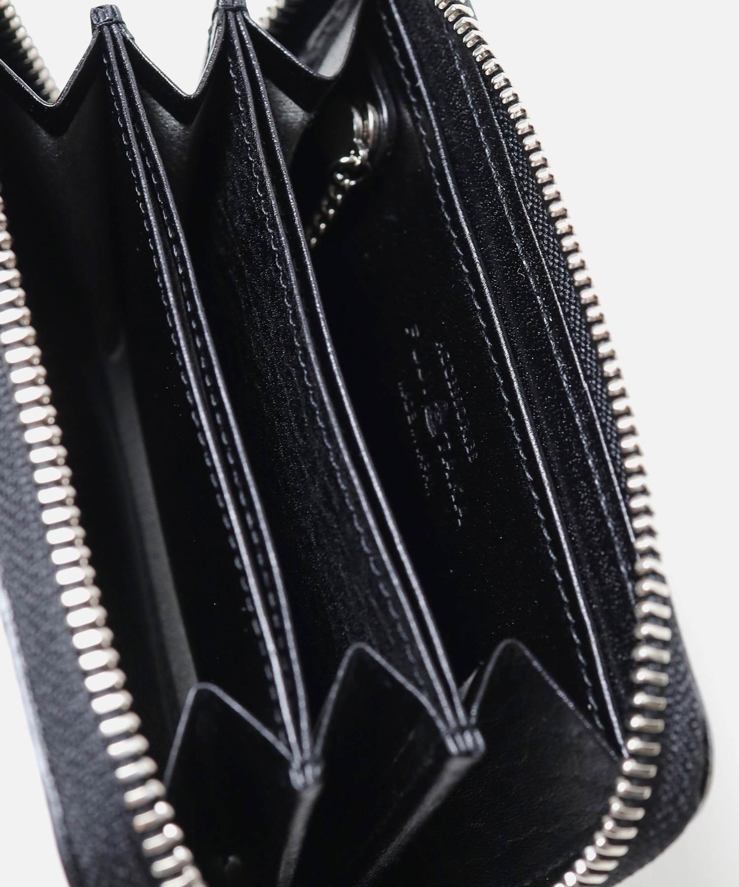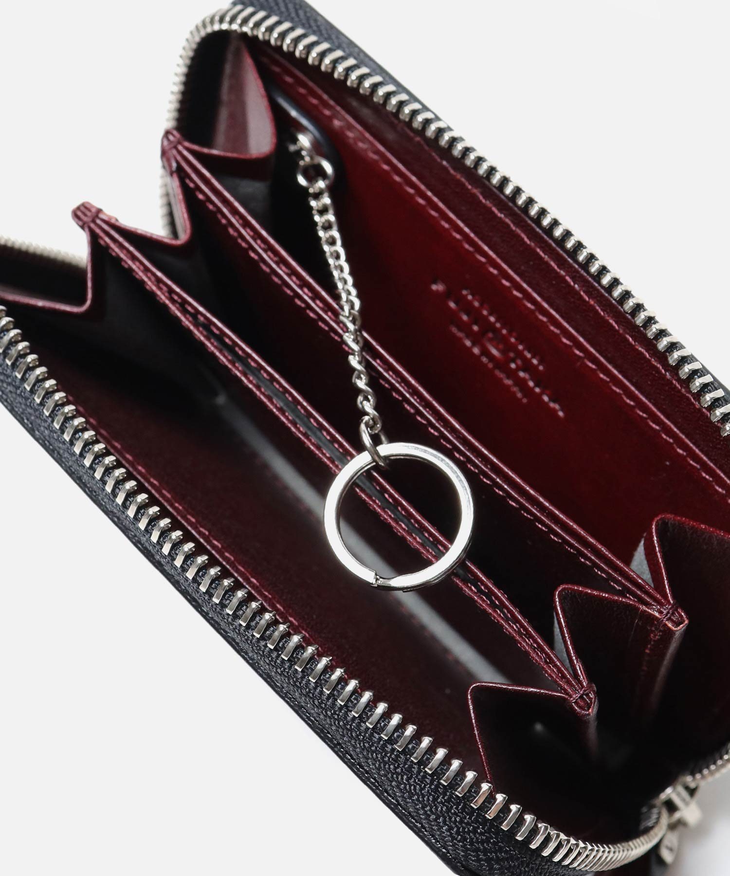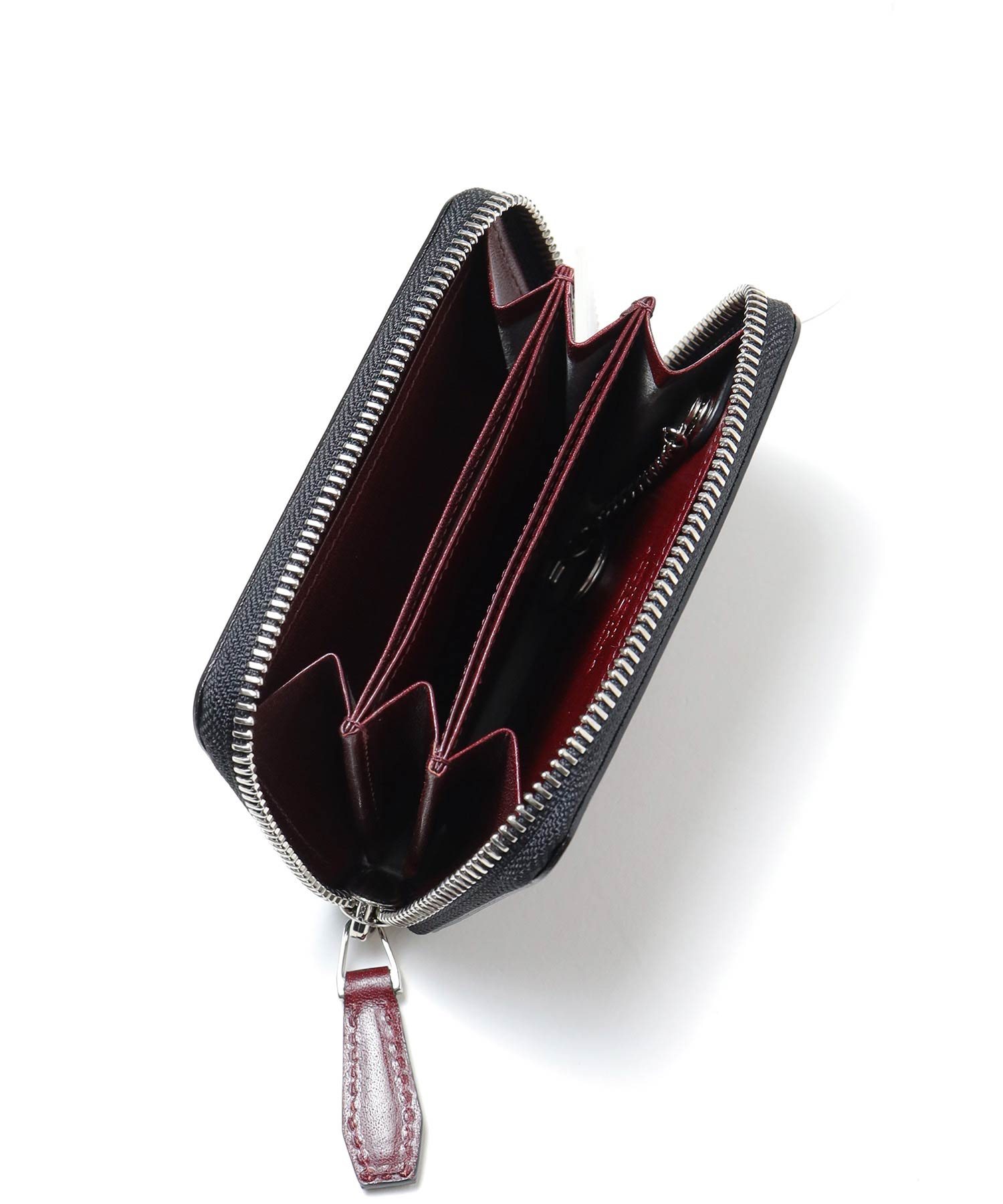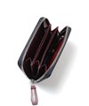 ケース内は、仕切りがありメインルームは3つに分かれています。一般的な小銭入れよりも一回り大きく、4つのポケットにはカード収納も可能です。さらに取り外しが可能なキーチェーンが付属しています。硬貨やカード類の他、三つ折りにした紙幣や、鍵も収納することができるマルチケースです。