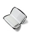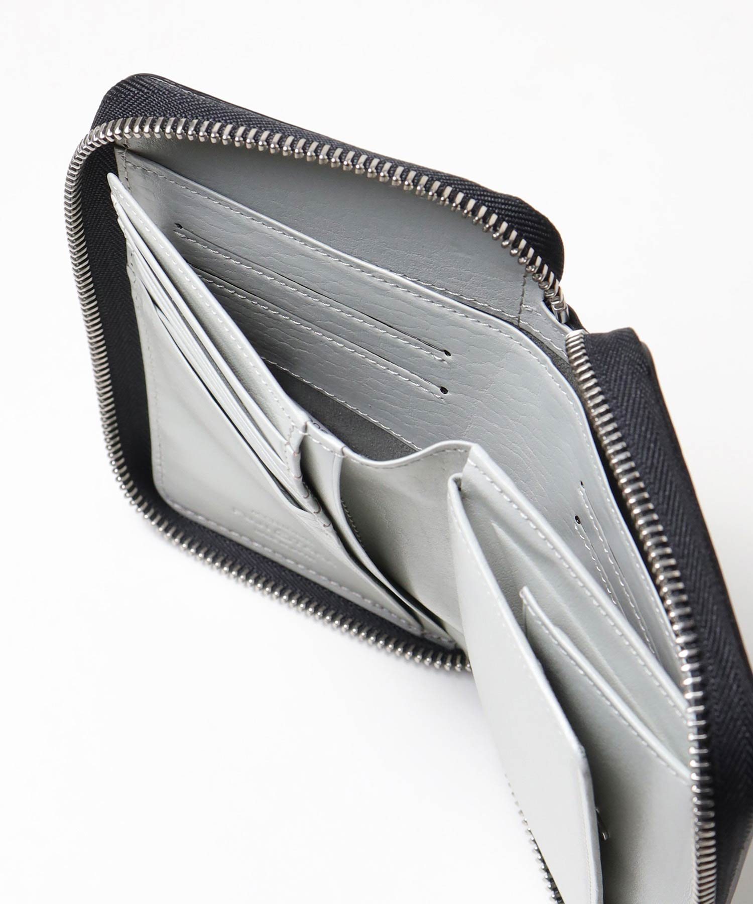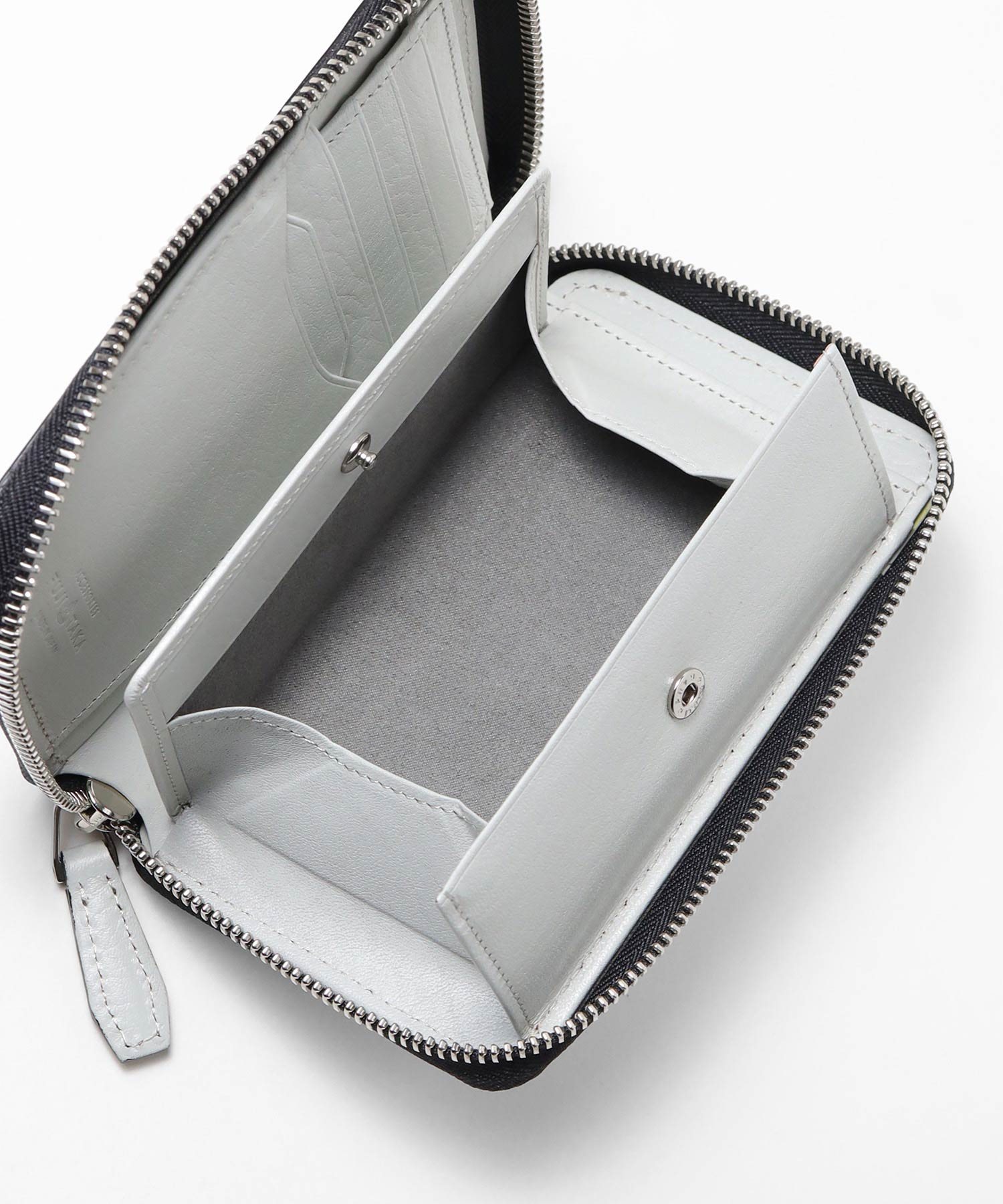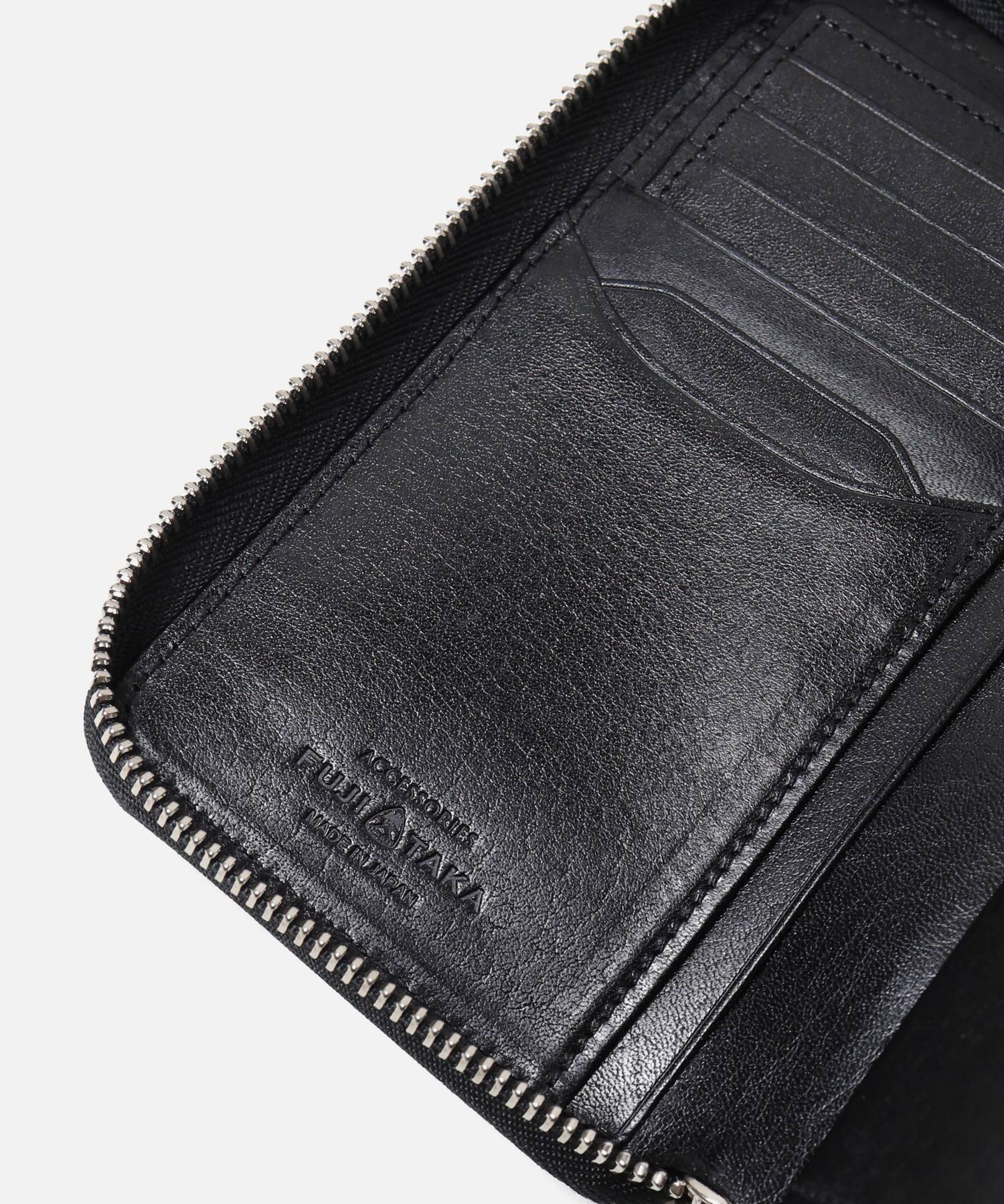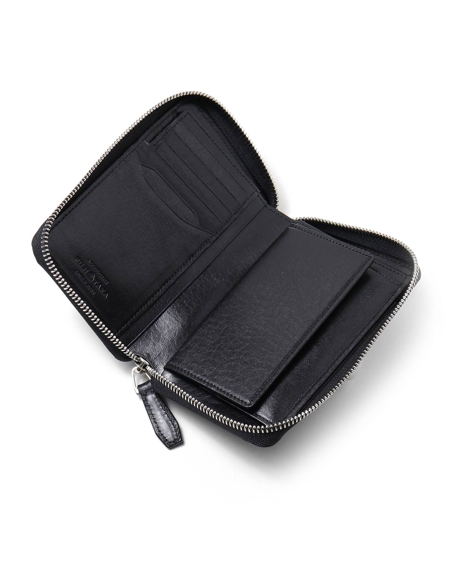硬貨の取り出しに便利なBOX型小銭入れが使いやすい、ラウンドファスナータイプの二つ折り財布です。2室ある札入れの前側は深さを浅くしており、さらに内にはカード収納を4枚設け、使いやすさと収納力にこだわっています。他にもカード段が6つと、大ポケットが3つあります。