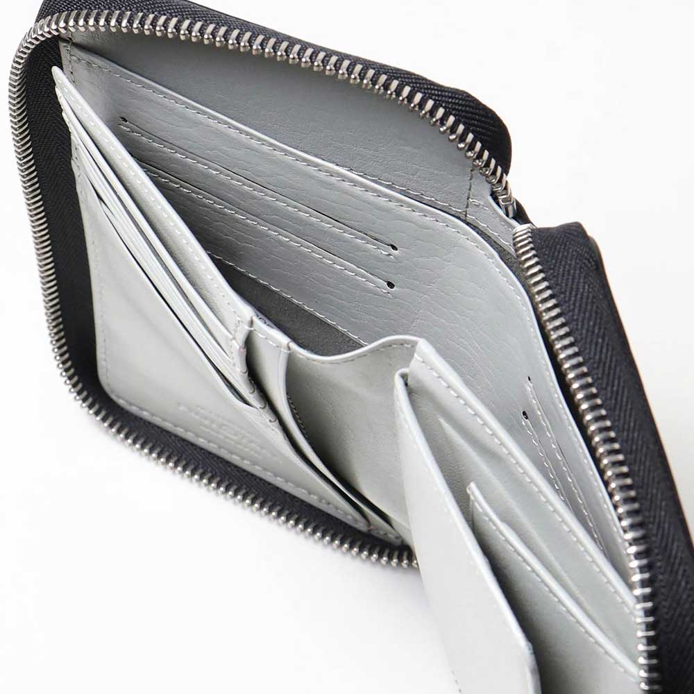 二つの出会いから生まれたハイスペックサスティナブルレザーを使用したセミハーフサイズの折り財布。日本エコレザー認証も取得しているハイスペックサスティナブルレザーを使用しています。硬貨の取り出しに便利なBOX型小銭入れが使いやすい、ラウンドファスナータイプの二つ折り財布です。
