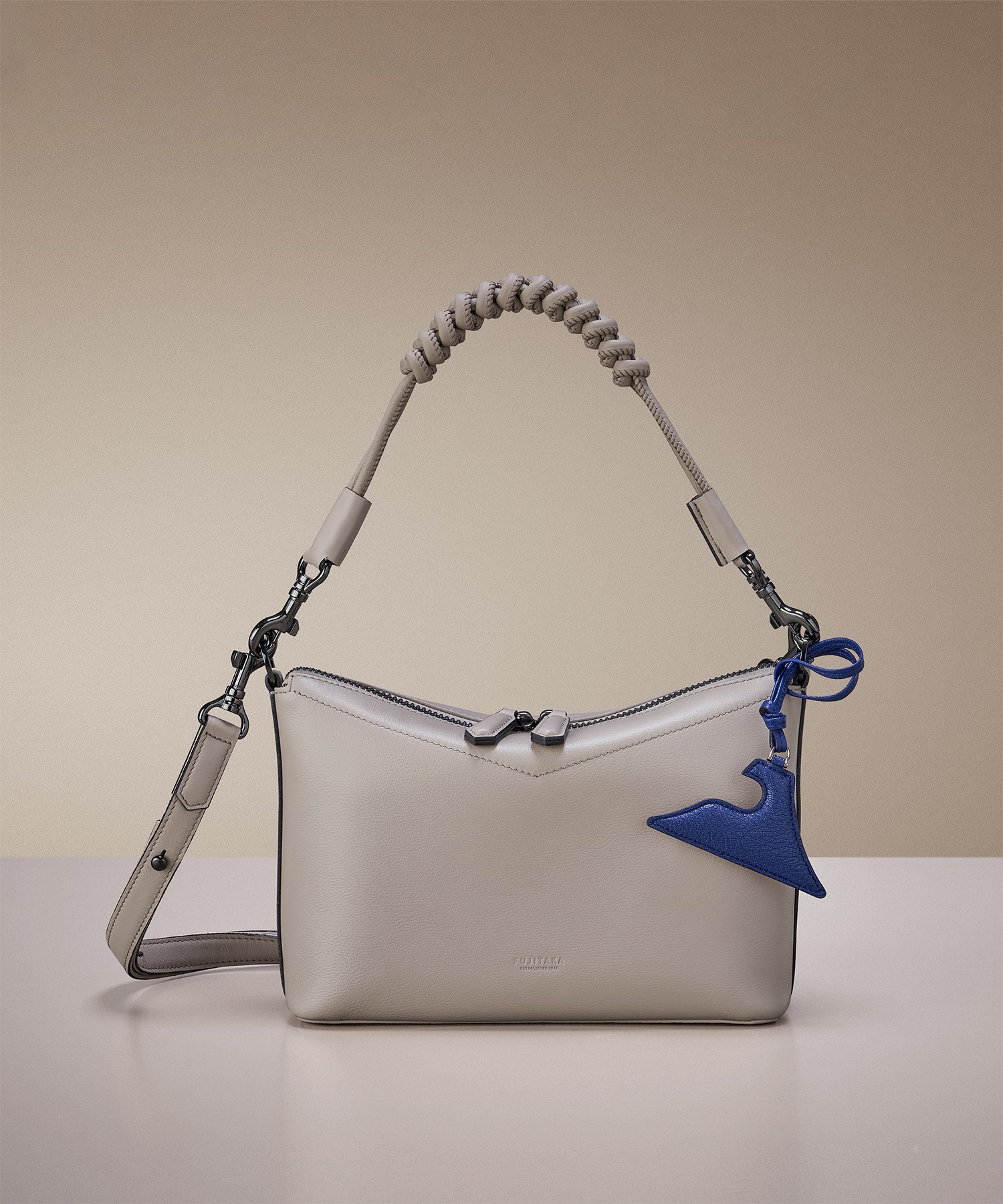「富士」に宿る五象をテーマに、フジタカらしい上質さで仕立てたレザーバッグチャームシリーズ。ブランドマーク「FUJITAKA」を象った、象徴性あふれるデザインです。