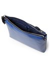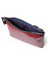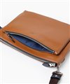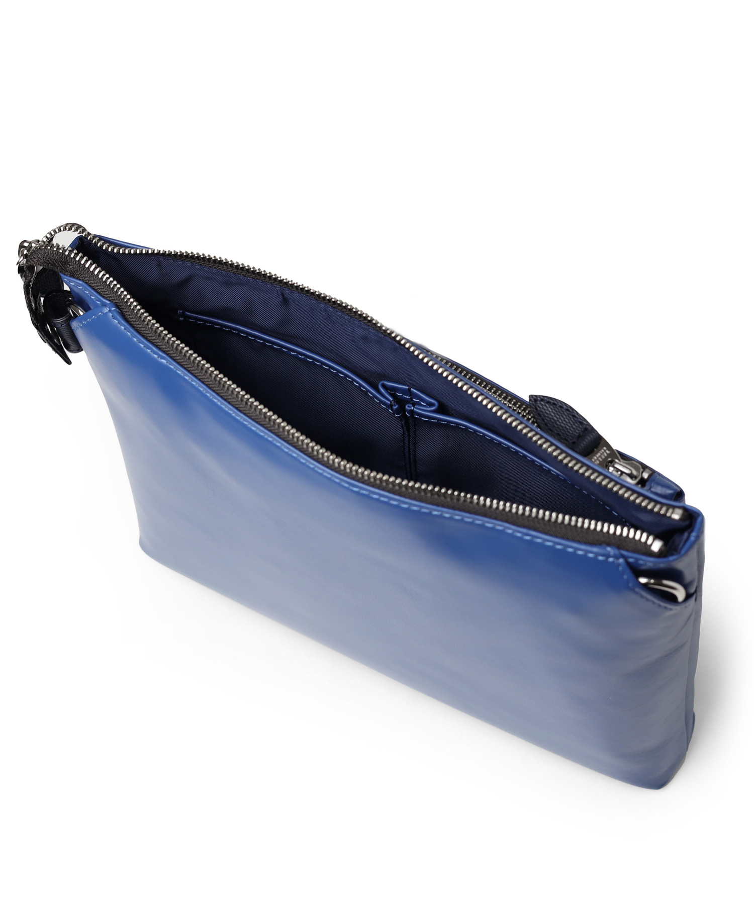 メインルームはB5クリアファイルがぴったりと収まるサイズ感です。オープンポケットが2つ、ファスナーポケットが1つ、また前面にはマチのあるファスナーポケットがございます。また底面にクラッチバッグとしてお持ちいただく際に便利なハンドルがございます。