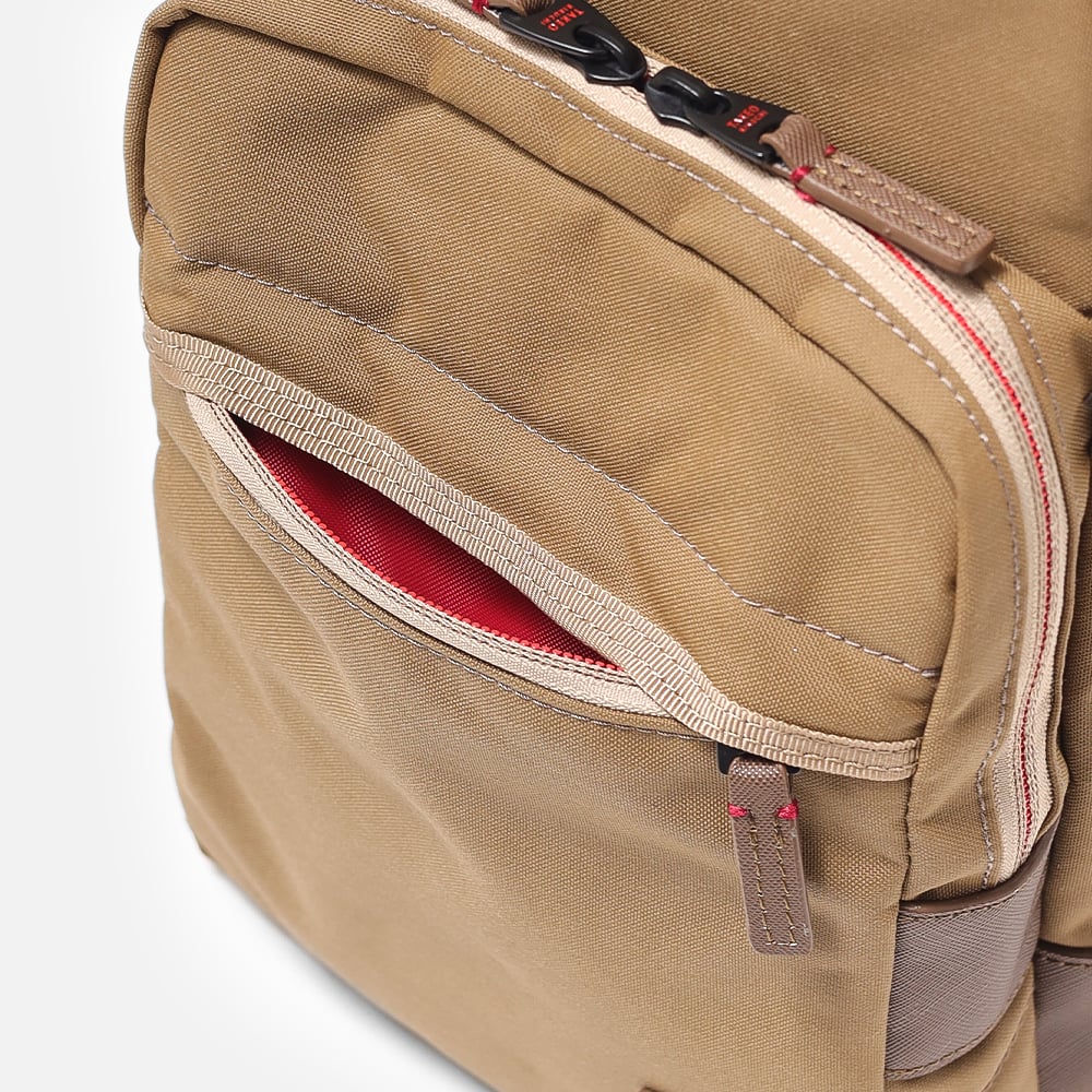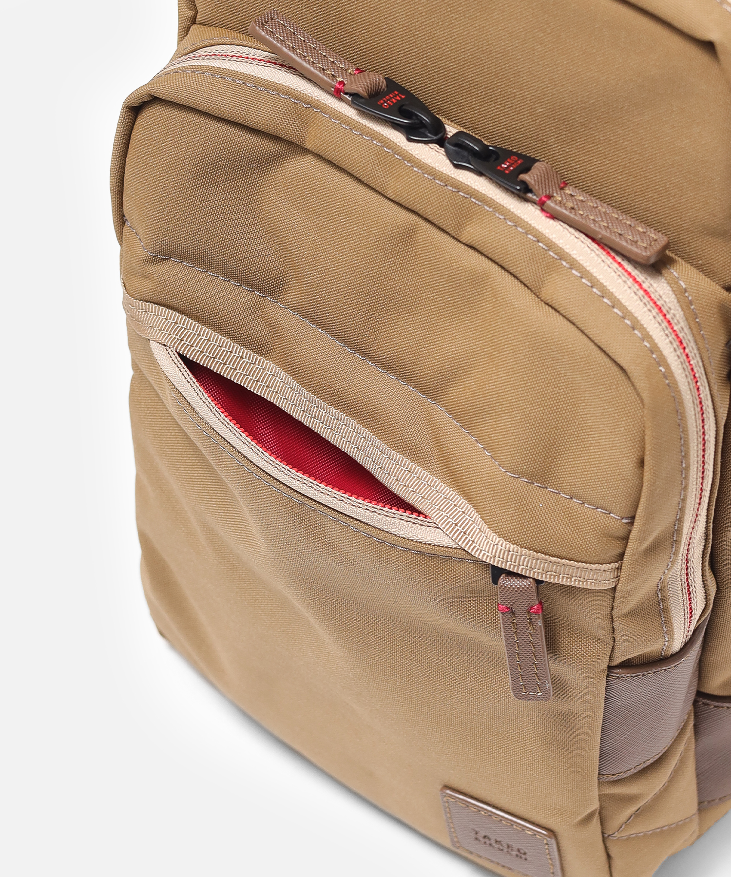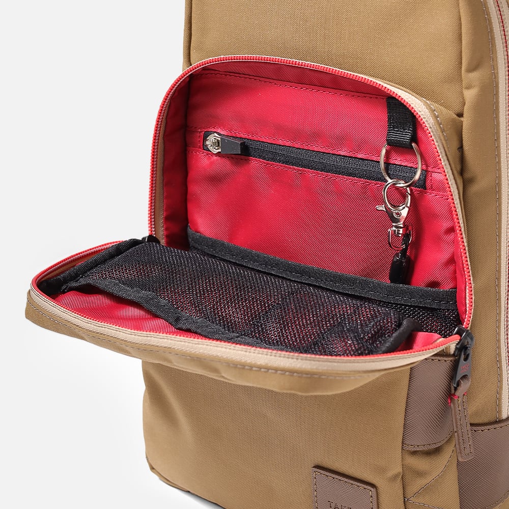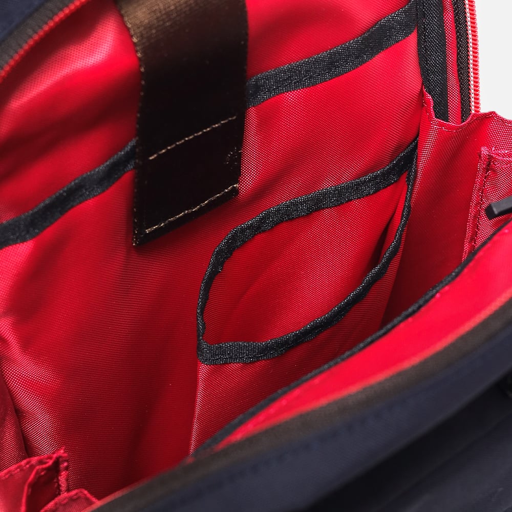 本体素材は、コーデュラの新素材「トゥルーロックファブリック」を使用。高い耐水性(3000mg以上)、耐候性(紫外線による耐光堅牢度)、防汚性を持ち軽量であることが特徴で実際の米軍や米国警察にも使用されている実績があります。また染色工程では、特殊な原色糸を使用しているので通常の生地と比較しても水、電気、Co2の使用量が抑えられています。付属生地には合皮を使用しており、水に強く軽量で色落ちの心配もありません。