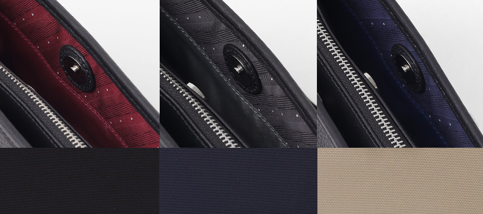 裏生地にはTAKEO KIKUCHIを象徴するネクタイ柄「ドットストライプ」のネクタイ生地をベースに裏生地用にアレンジし、本体カラーとバイカラーになるよう裏生地を合わせました。