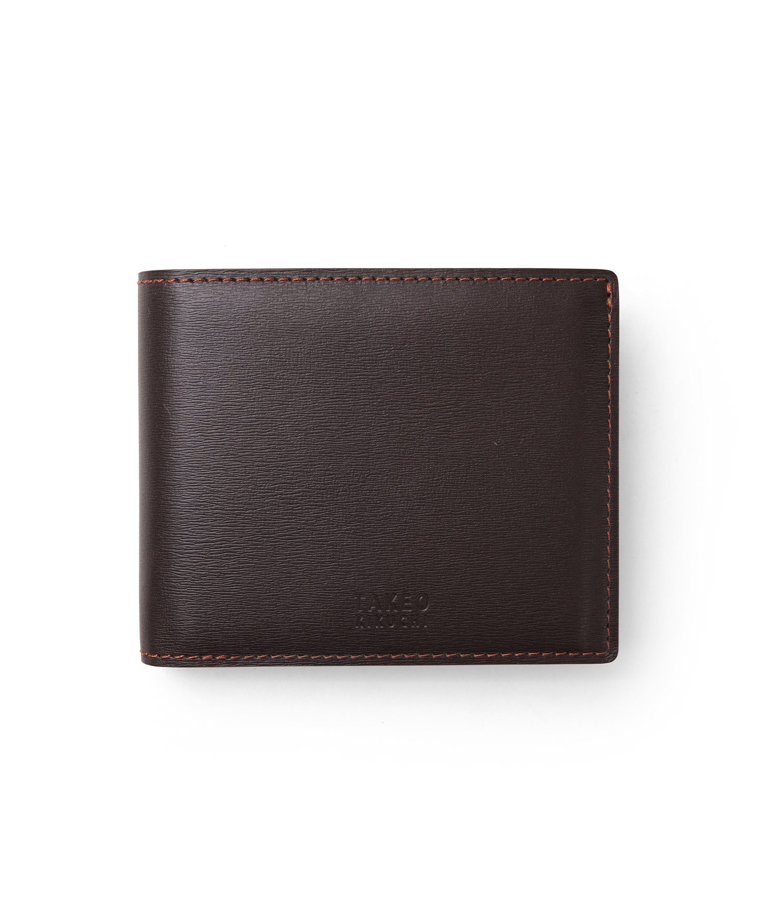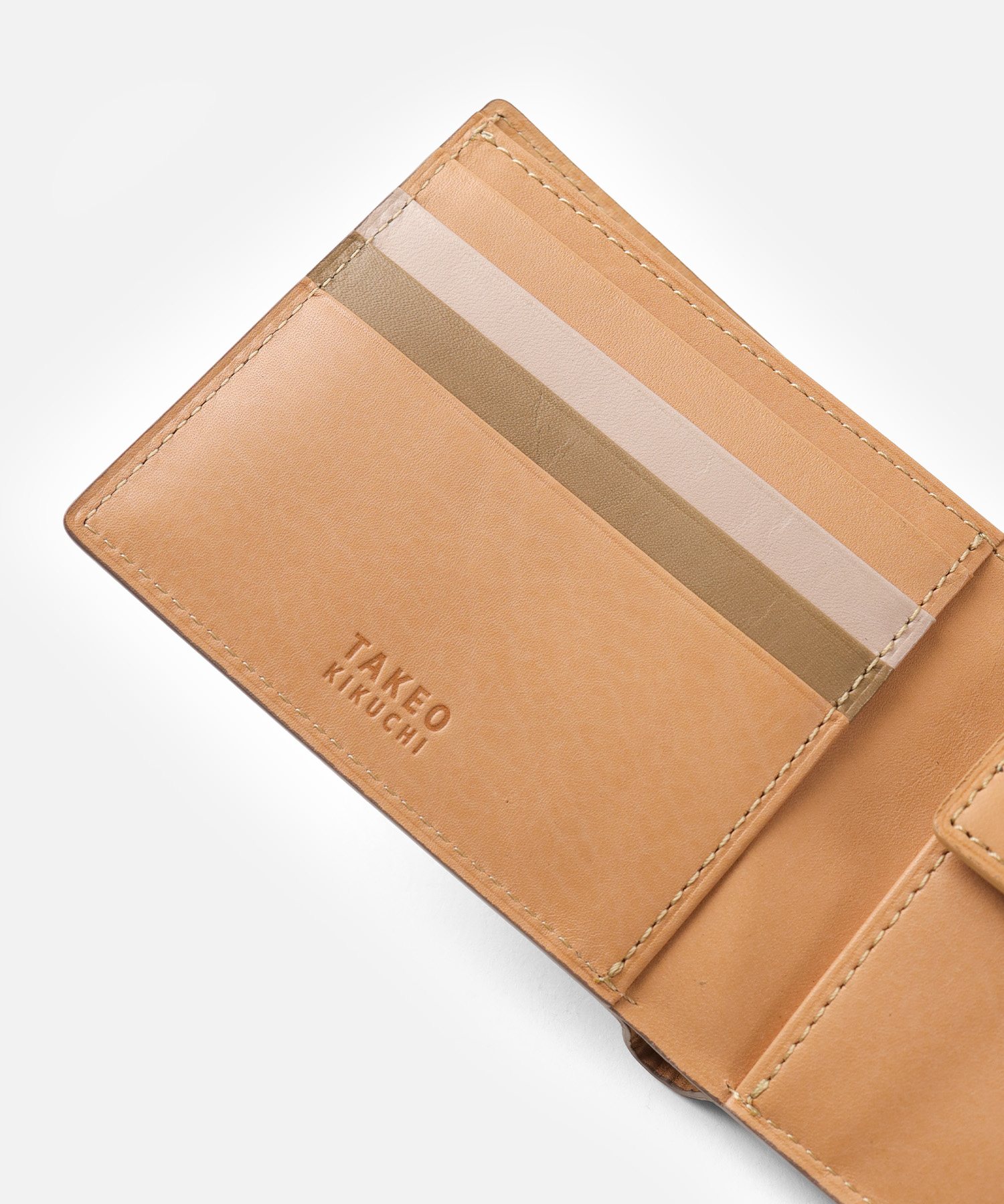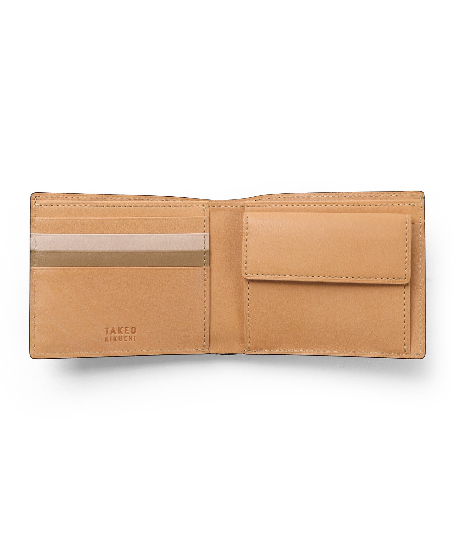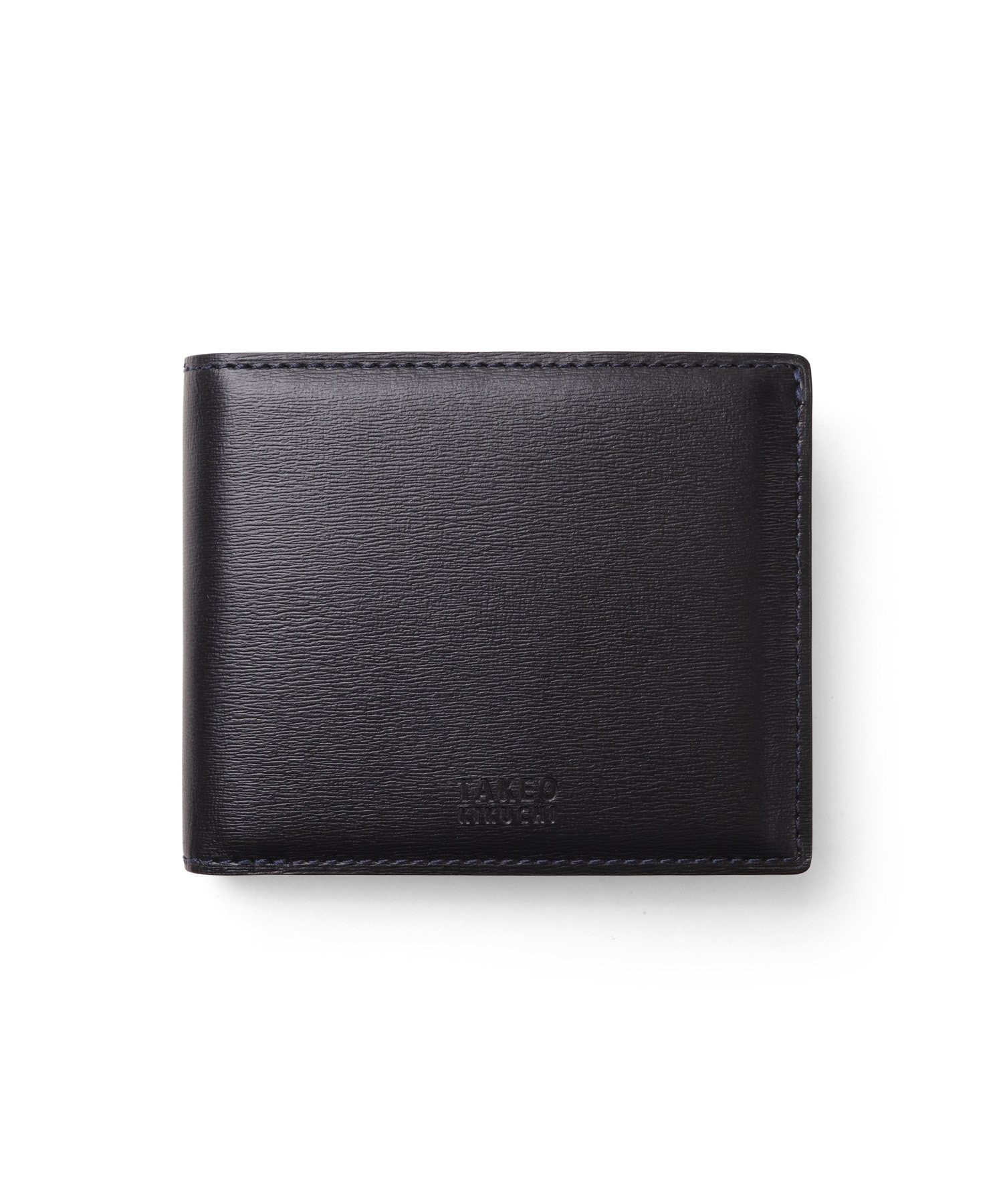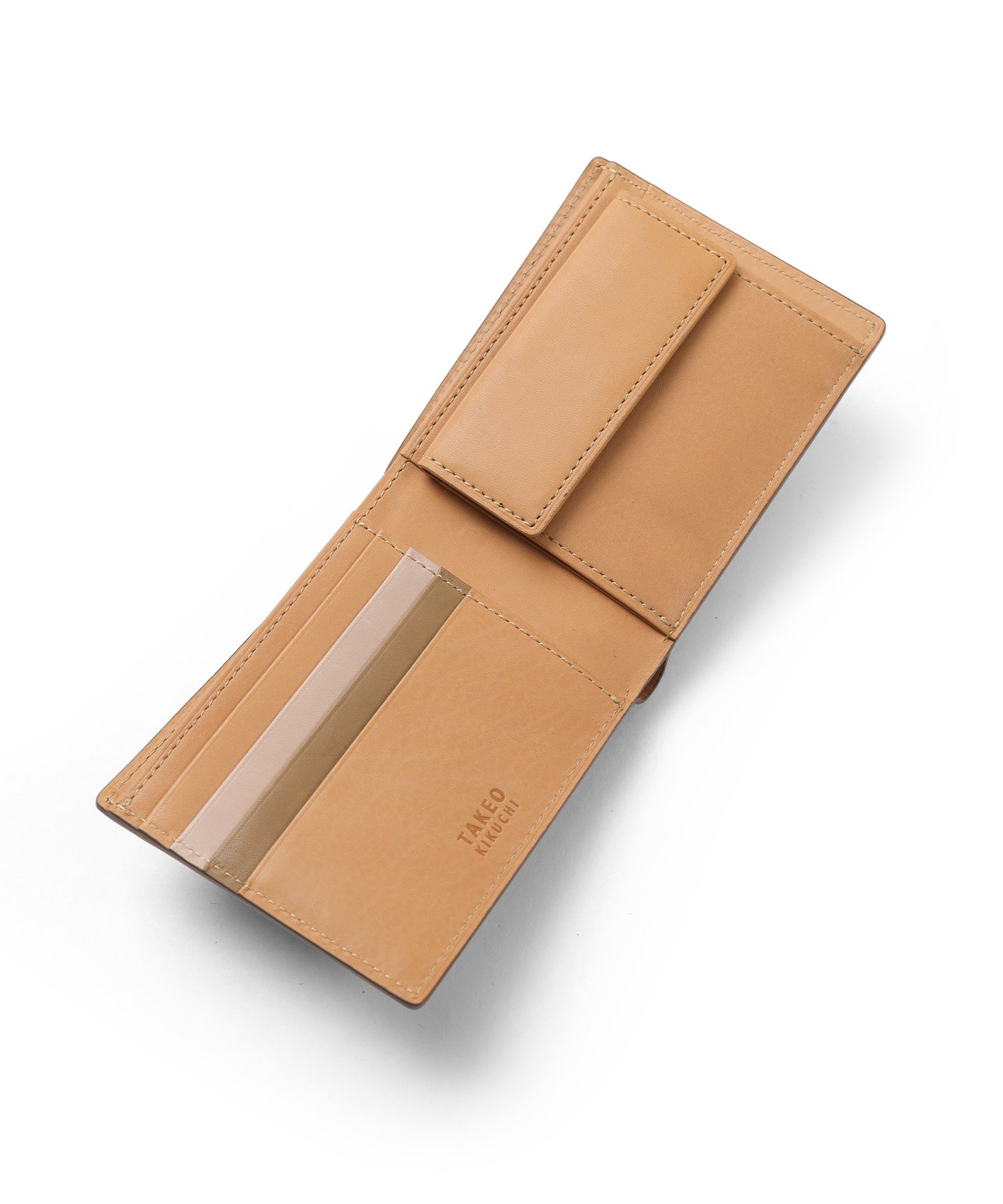 イタリア製の型押し牛革を用い、国内の職人が丁寧に仕立てたタケオキクチの二つ折り財布。薄マチ構造によって収納力はそのままに、一般的な二つ折り財布よりも薄い構造で、表素材には繊細な水シボの型押しを施したイタリアンレザーを、内側には視認性を高めるナチュラルカラーのソフト牛革を使用。切り目やコバ磨きなど、日本製ならではの丁寧な仕事が光る逸品です。