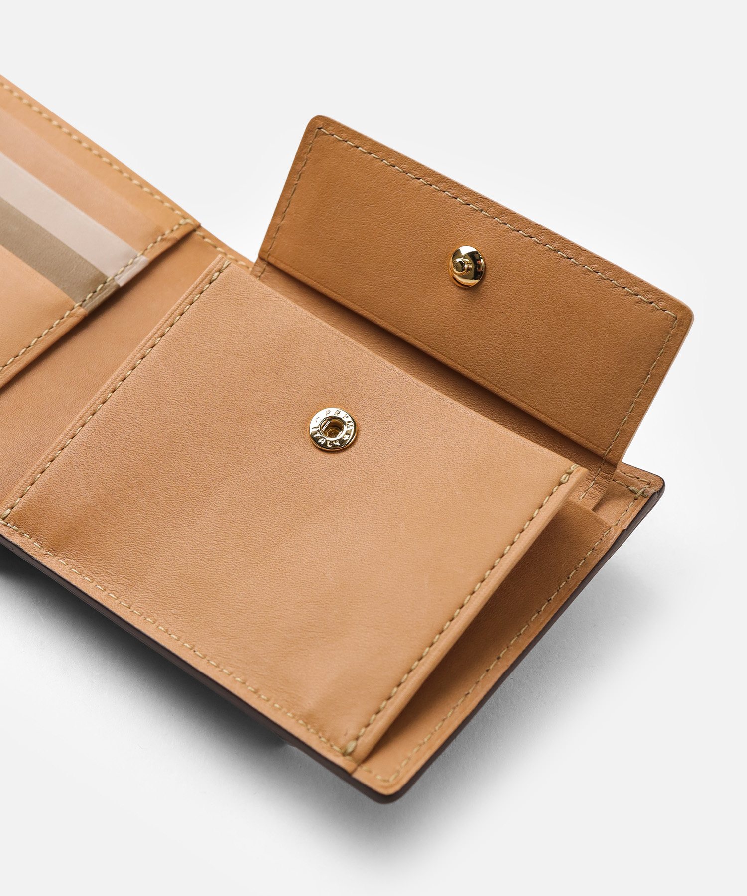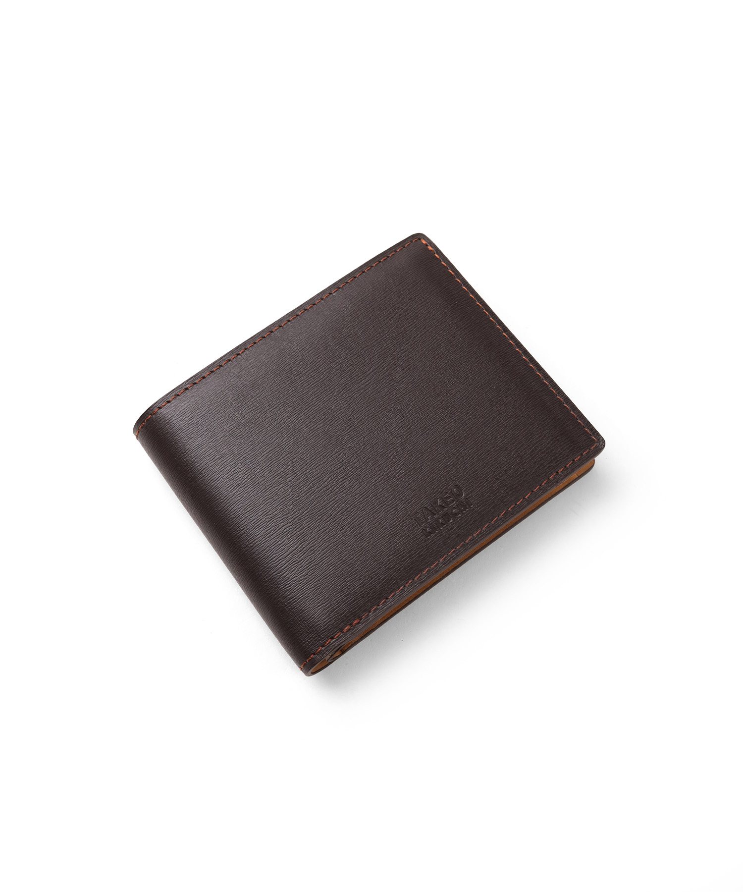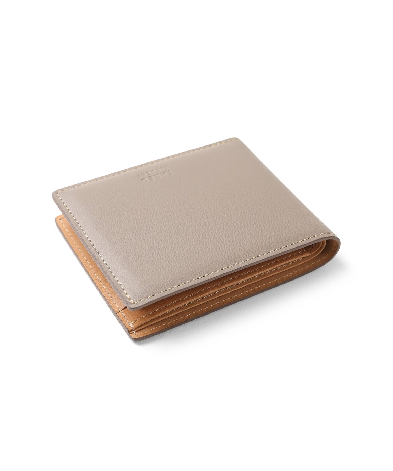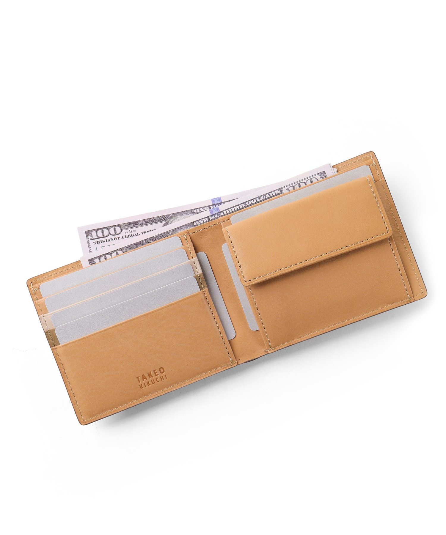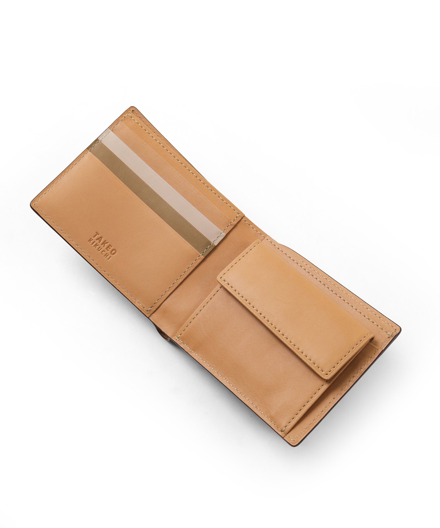 イタリア製の型押し牛革を用い、国内の職人が丁寧に仕立てたタケオキクチの二つ折り財布。薄マチ構造によって収納力はそのままに、一般的な二つ折り財布よりも薄い構造で、表素材には繊細な水シボの型押しを施したイタリアンレザーを、内側には視認性を高めるナチュラルカラーのソフト牛革を使用。切り目やコバ磨きなど、日本製ならではの丁寧な仕事が光る逸品です。