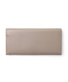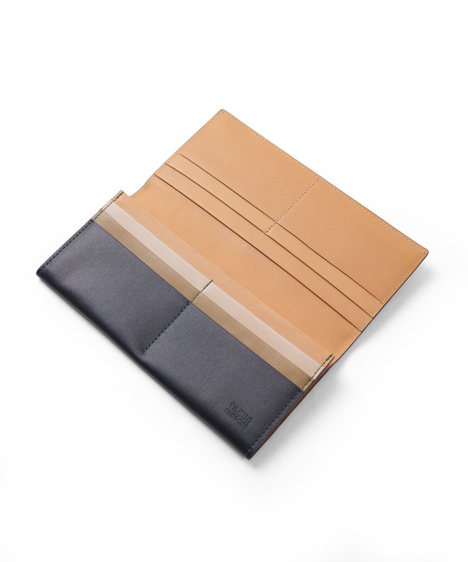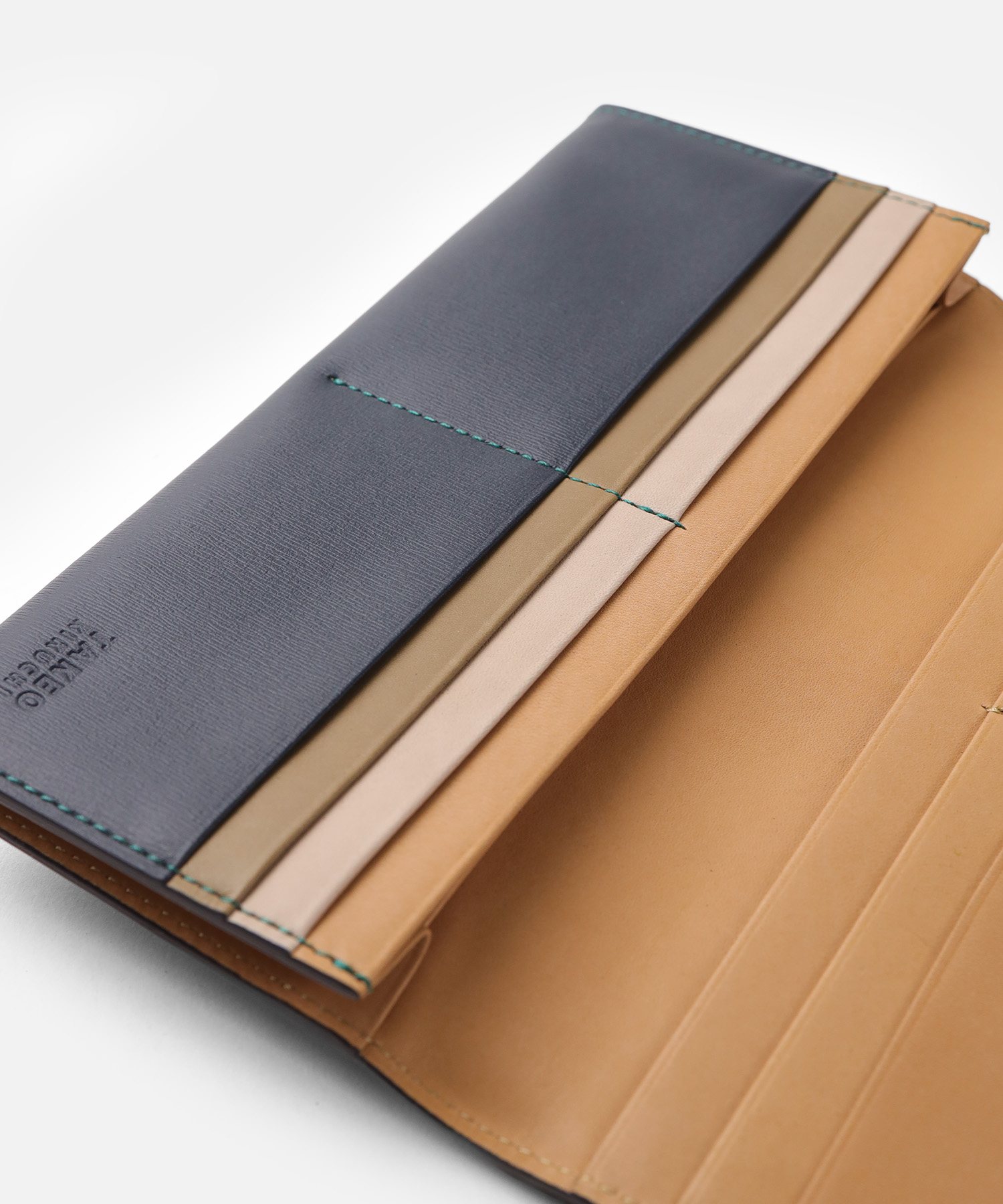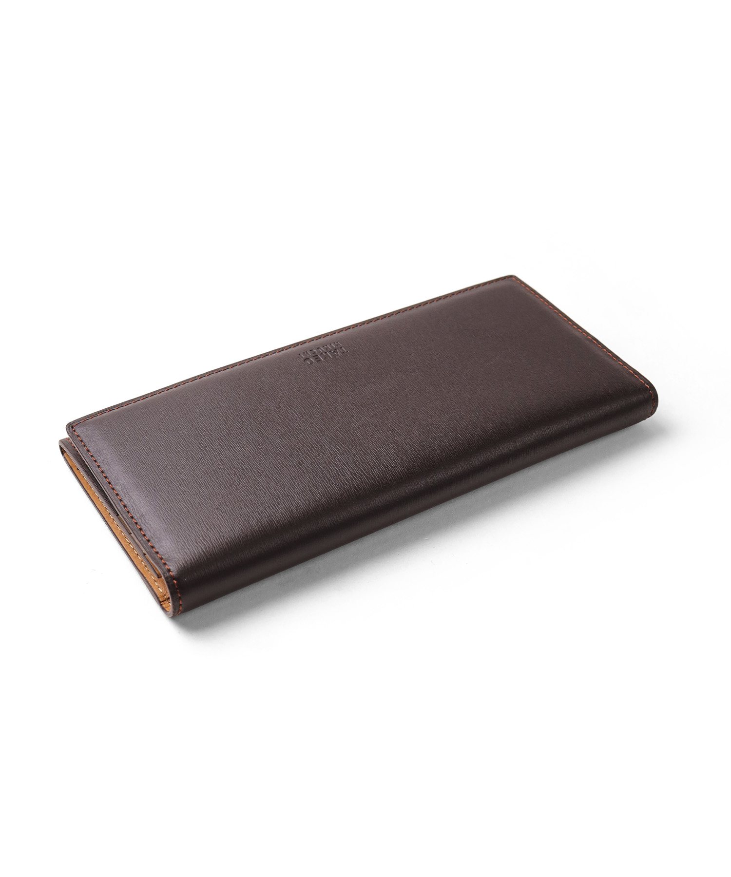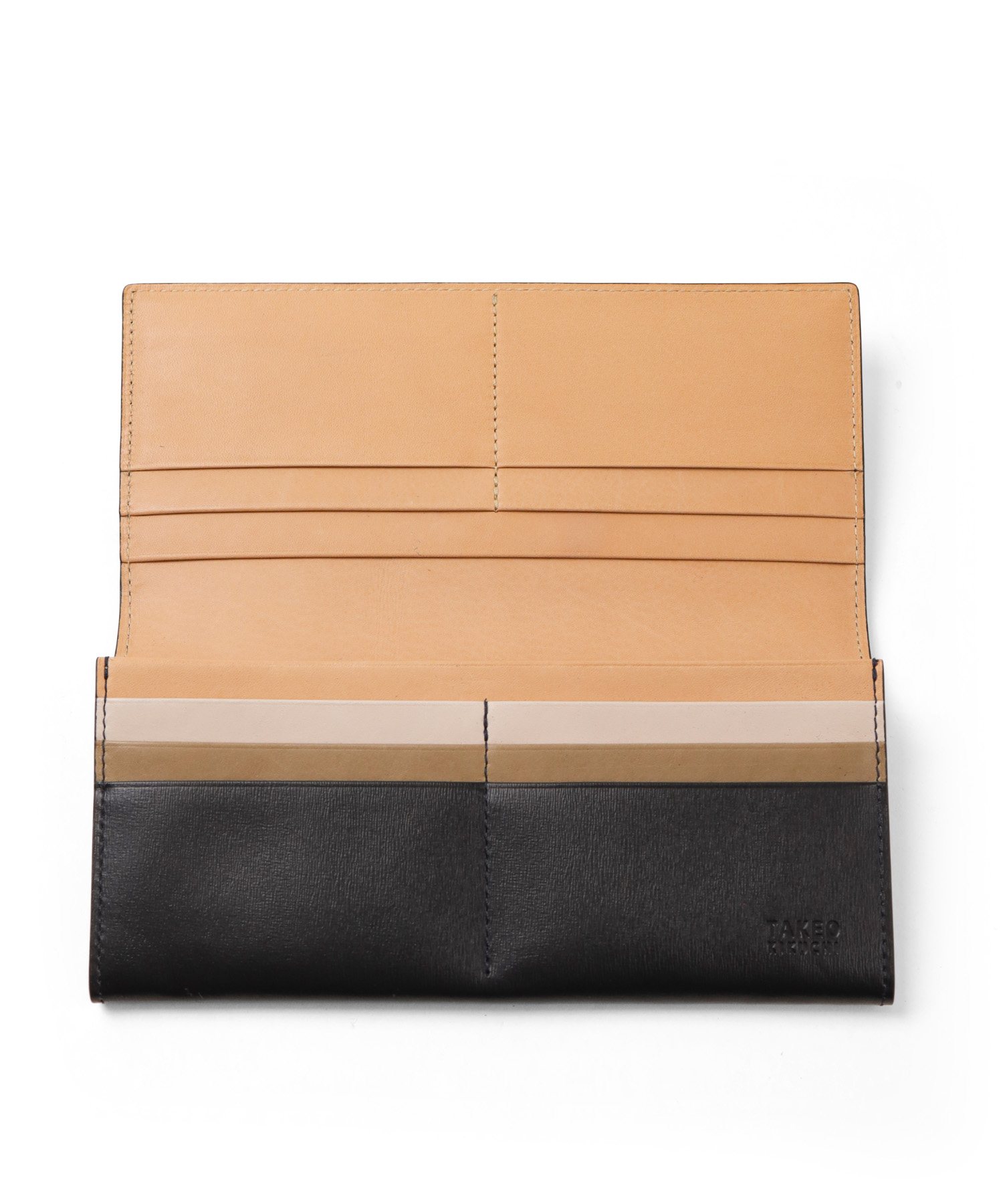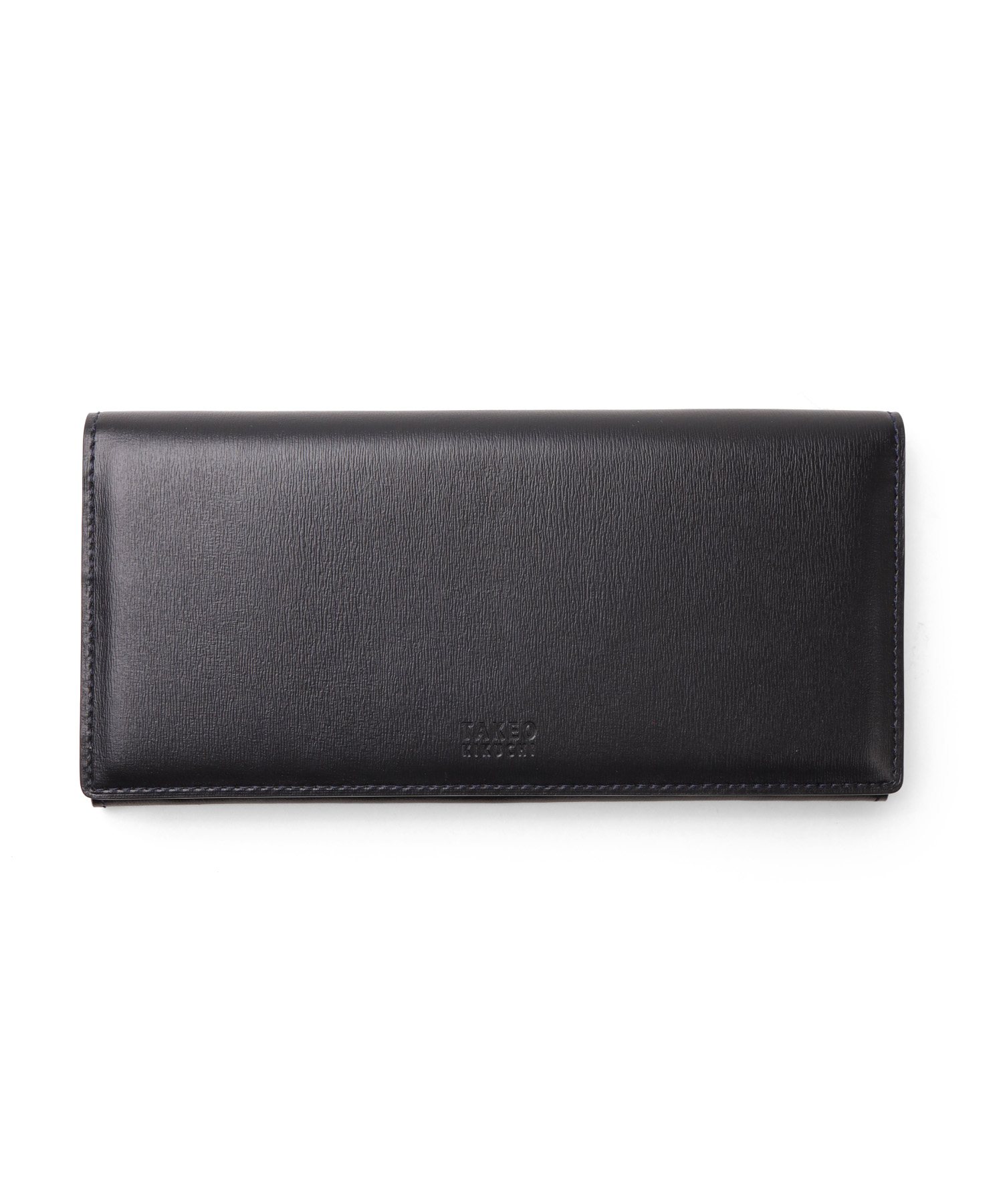 イタリア製の型押し牛革を用い、国内の職人が丁寧に仕立てたタケオキクチのかぶせ長財布。薄マチ構造によって収納力はそのままに、一般的な長財布よりも薄い構造で、表素材には繊細な水シボの型押しを施したイタリアンレザーを、内側には視認性を高めるナチュラルカラーのソフト牛革を使用。切り目やコバ磨きなど、日本製ならではの丁寧な仕事が光る逸品です。