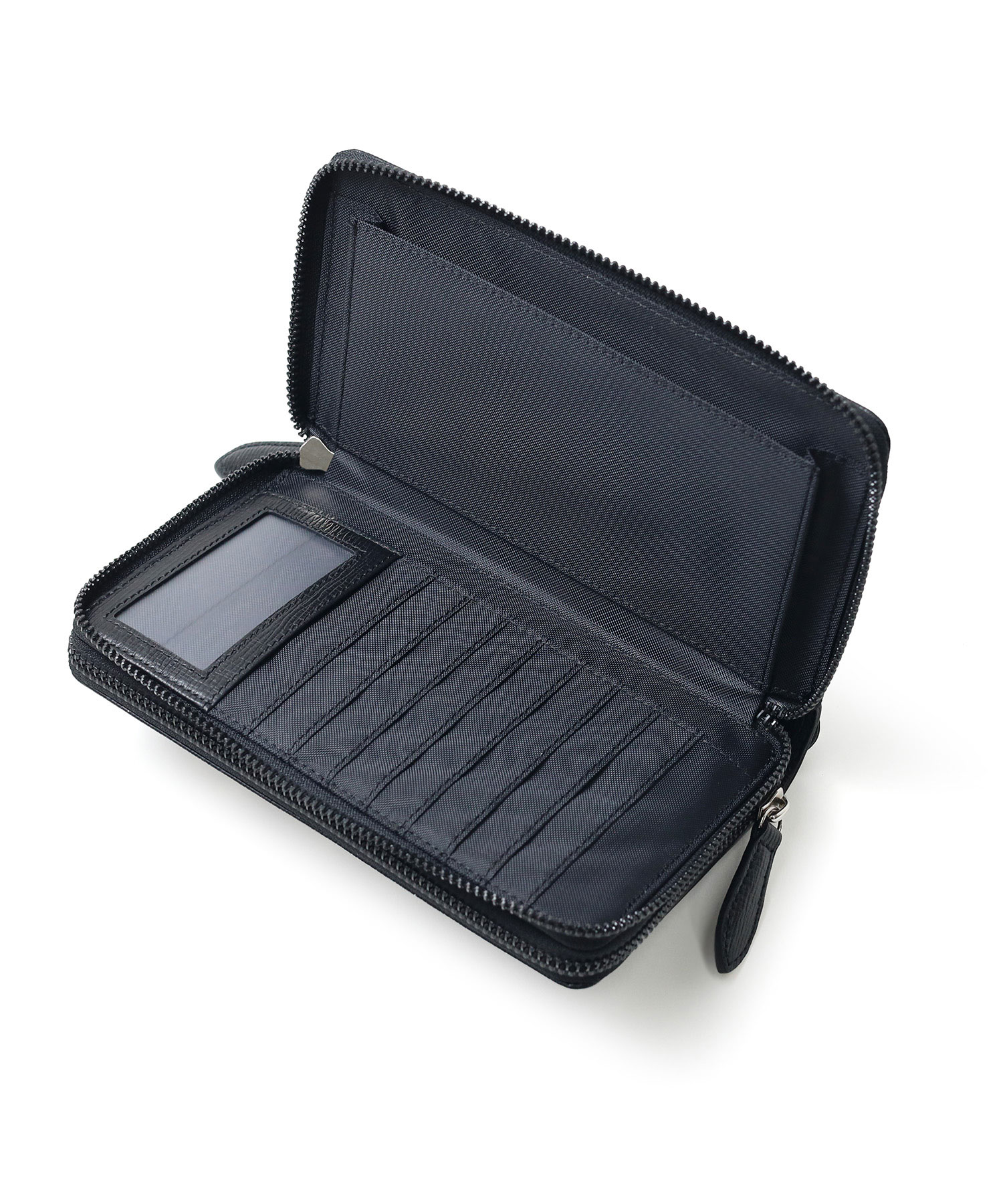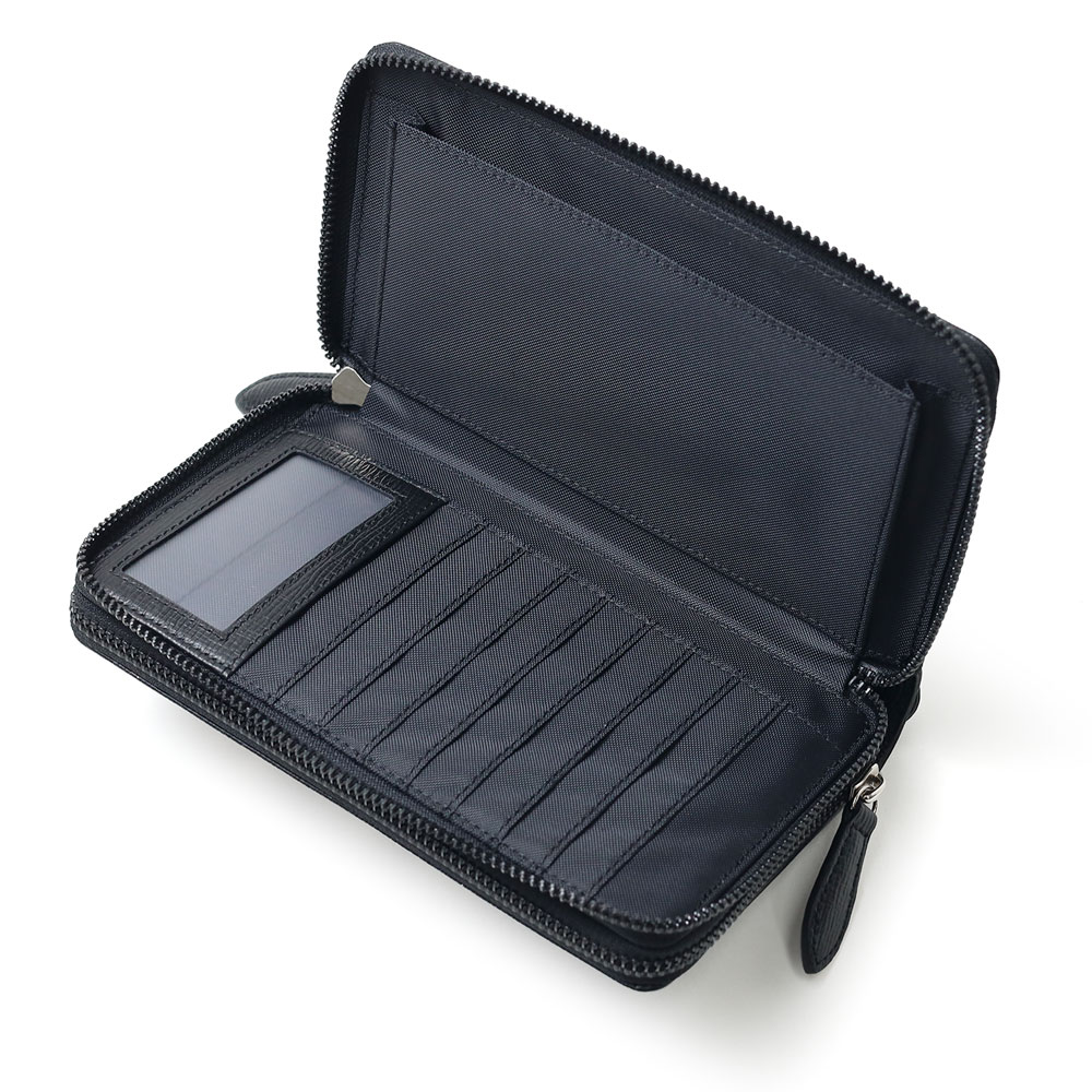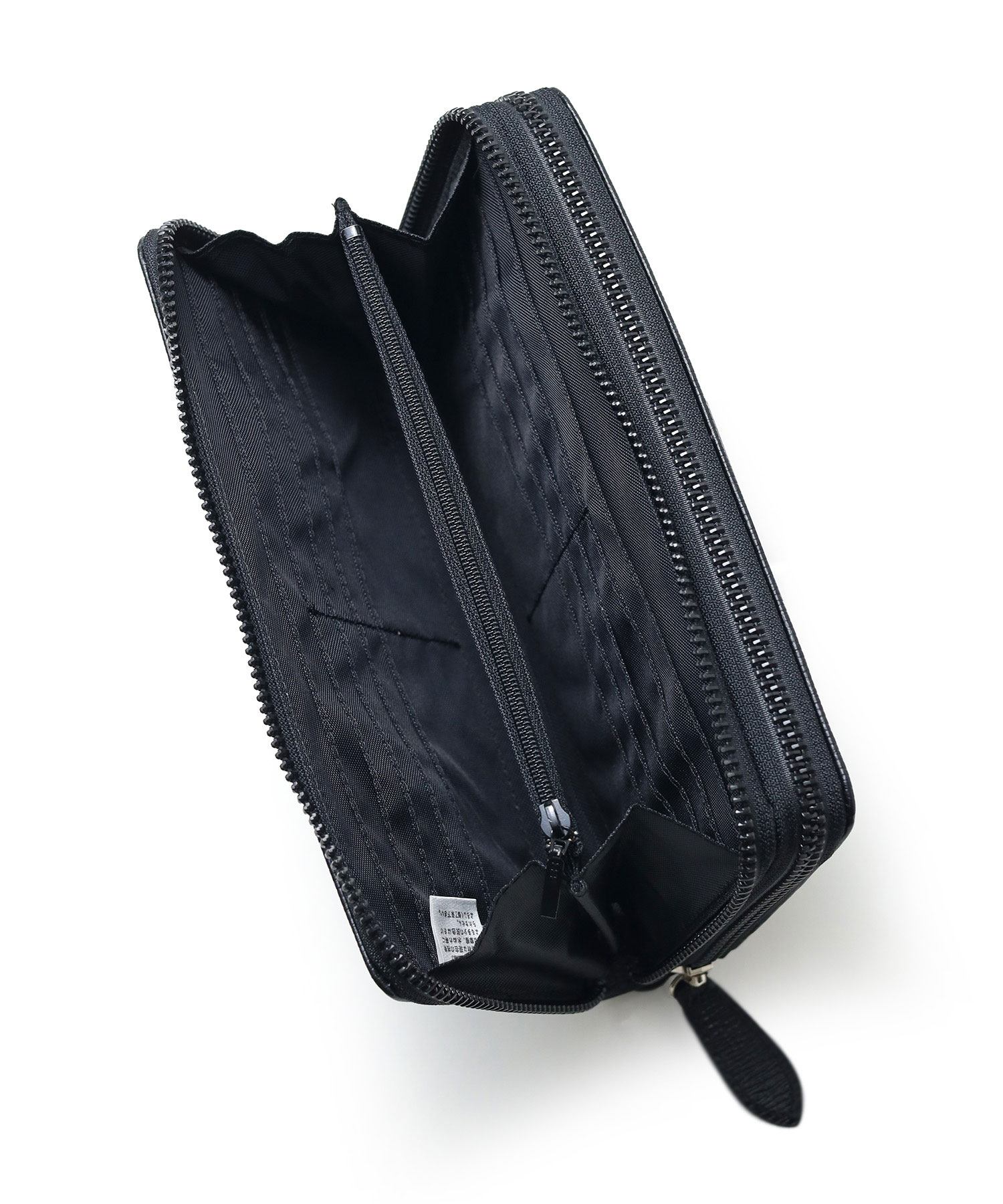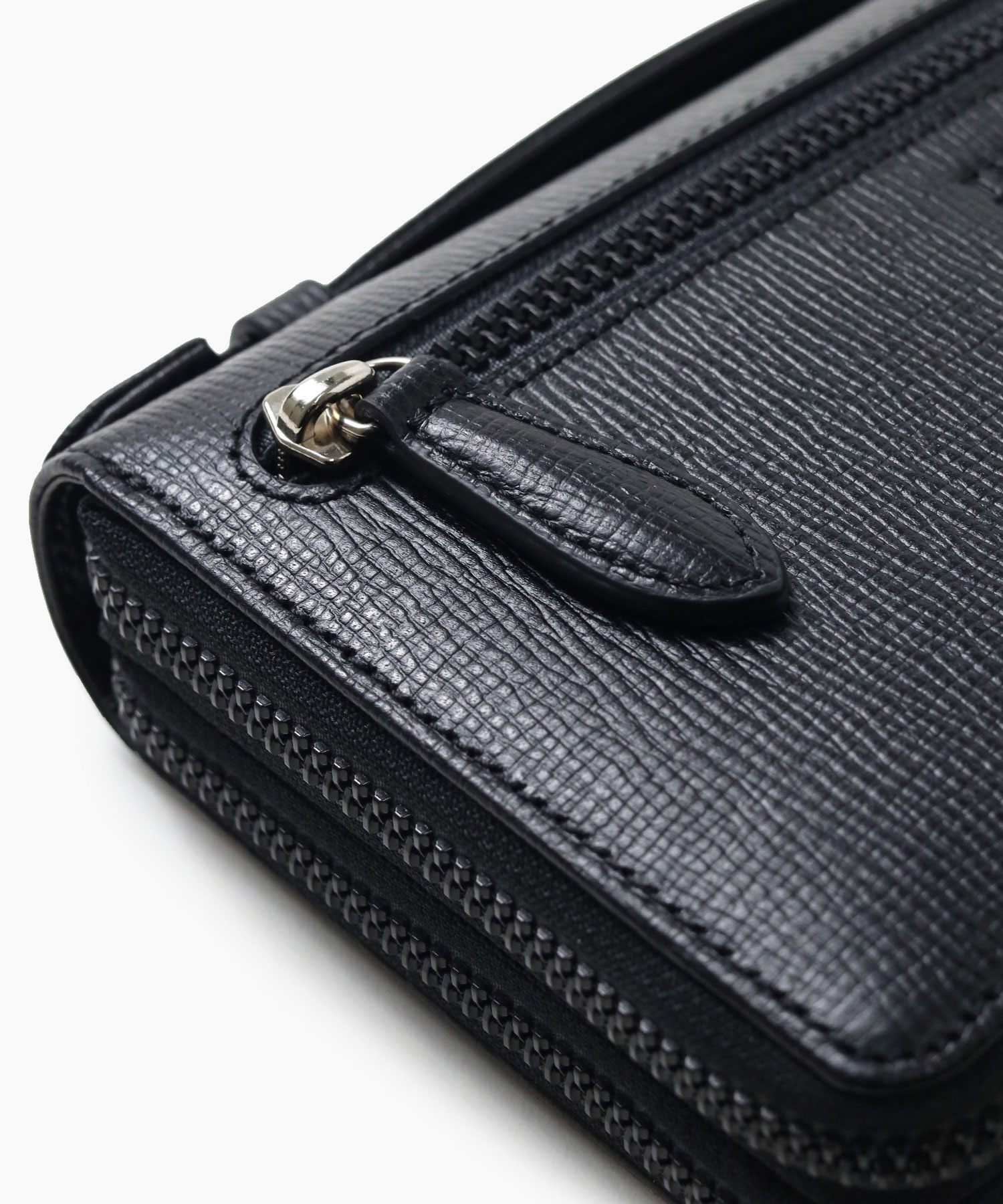 内装はダブルルーム仕様になっており、前室にはオープンポケット、フリーポケット、窓付きのカードポケット、カード段が8あります。後室には、フリーポケットが2つ、札入れが2つ、小銭入れ、カード段が16あり、これ一つでお財布と貴重品を一つにまとめて持ち歩くことが可能です。また、前面にはファスナーポケットがあり、さっと取り出したいものの収納に便利です。