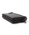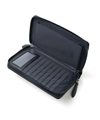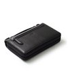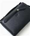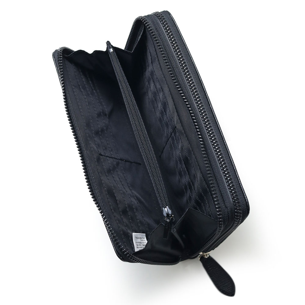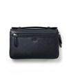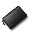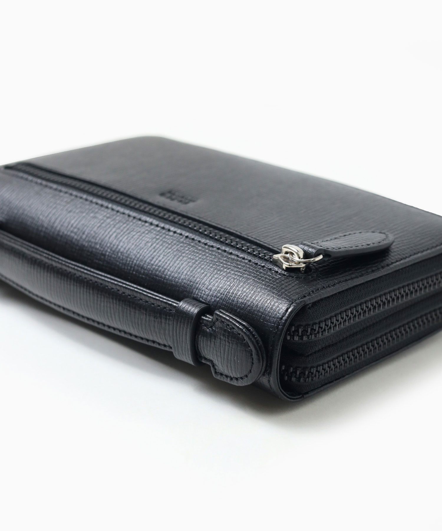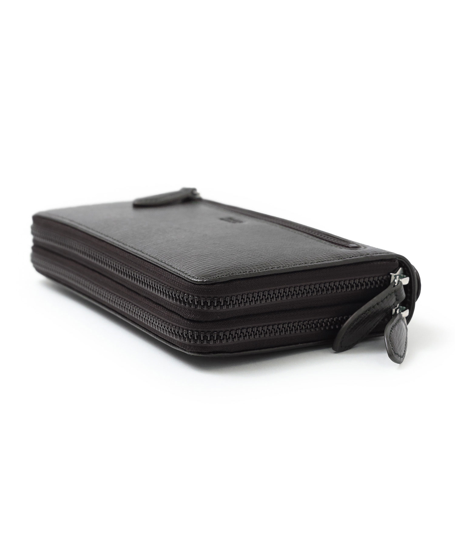 内装はダブルルーム仕様になっており、前室にはオープンポケット、フリーポケット、窓付きのカードポケット、カード段が8あります。後室には、フリーポケットが2つ、札入れが2つ、小銭入れ、カード段が16あり、これ一つでお財布と貴重品を一つにまとめて持ち歩くことが可能です。また、前面にはファスナーポケットがあり、さっと取り出したいものの収納に便利です。
