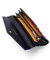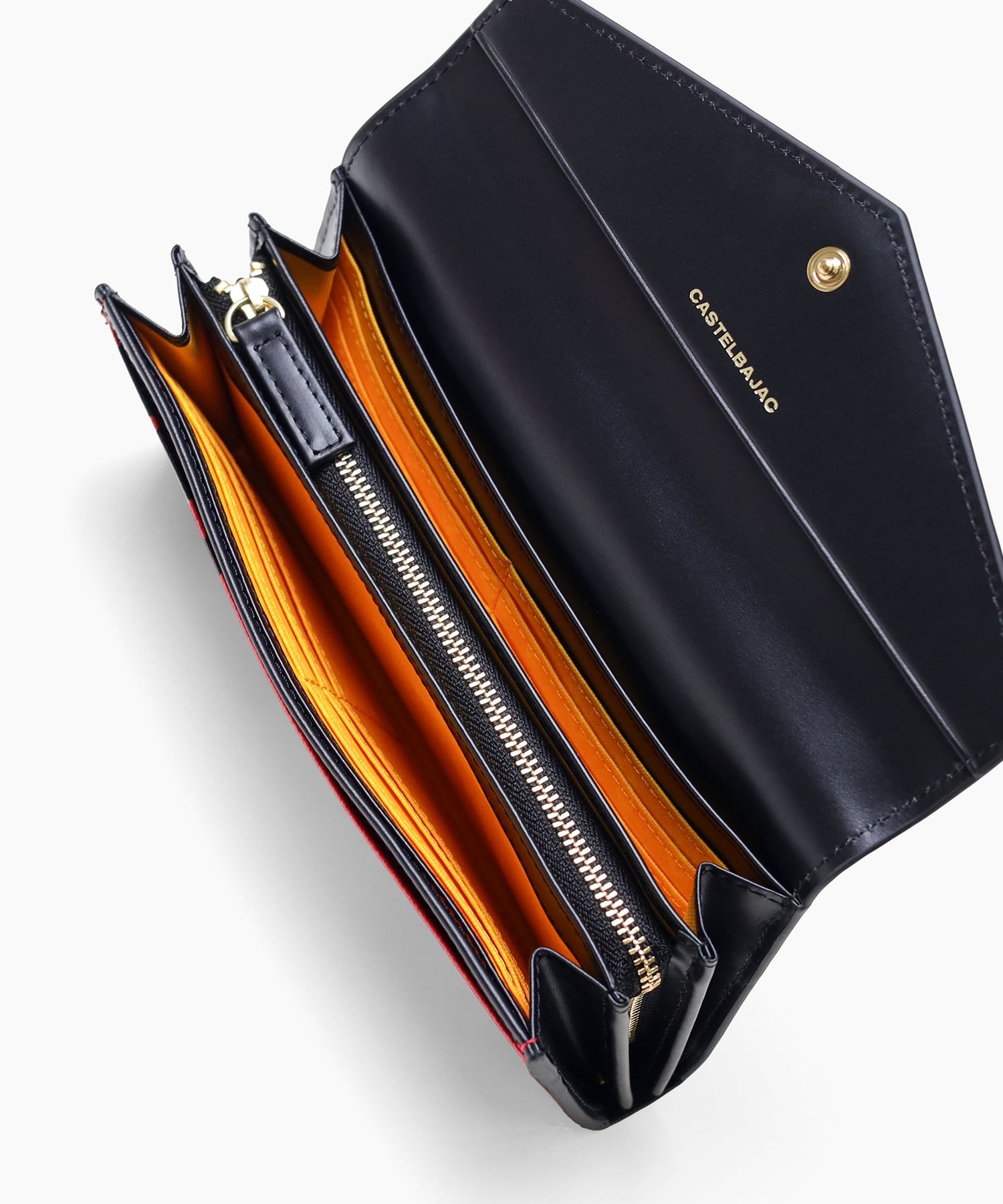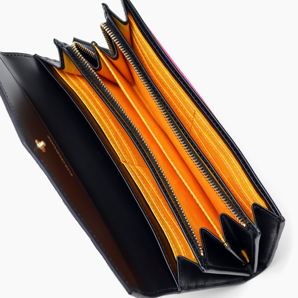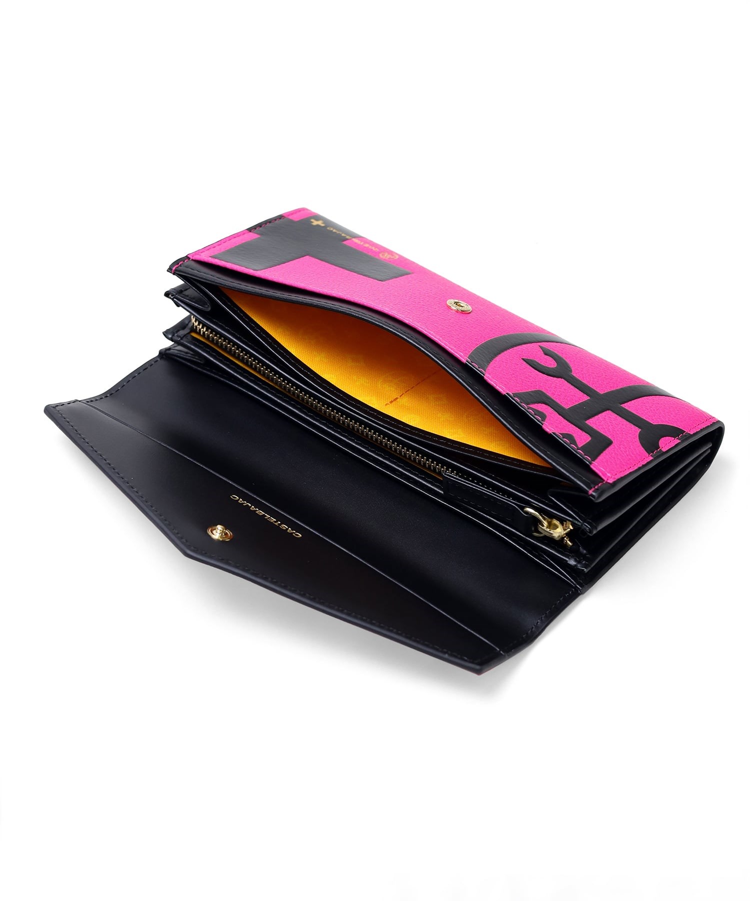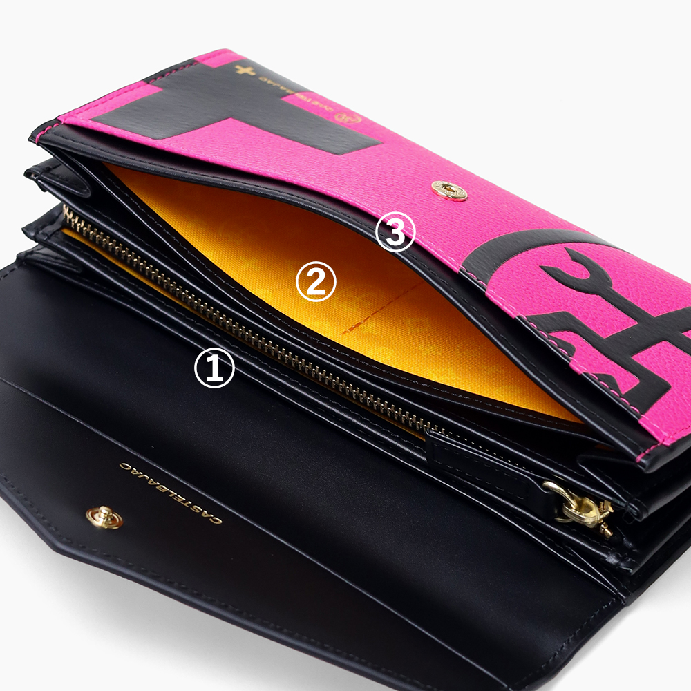 ビビッドカラーのレザーに、大きなロゴが印象的なカステルバジャックのかぶせタイプの長財布。カードが12枚収納できる大容量仕様になっています。シックなモノトーンから、気分の上がるビビットまでカラーバリエーション豊富に取り揃えました。
