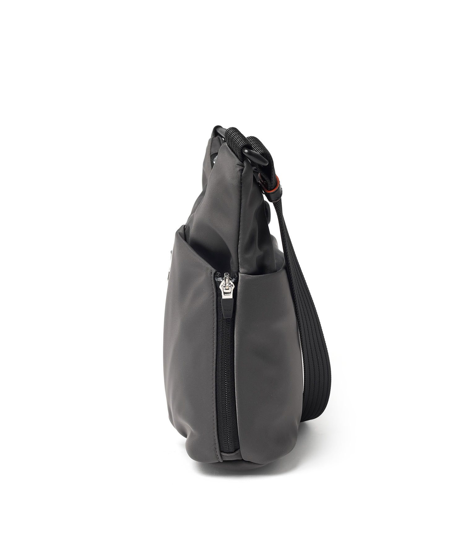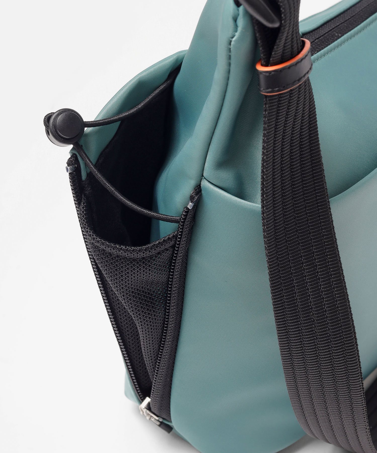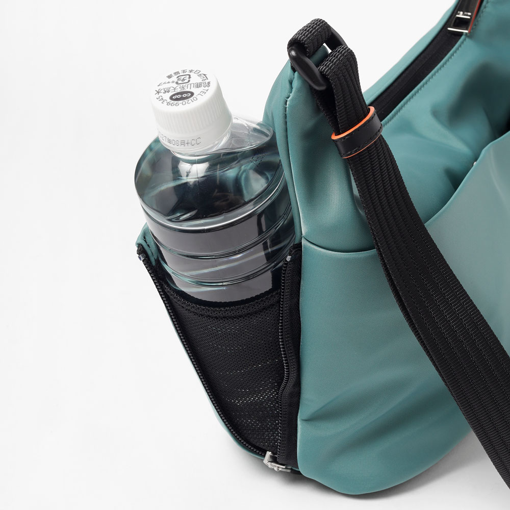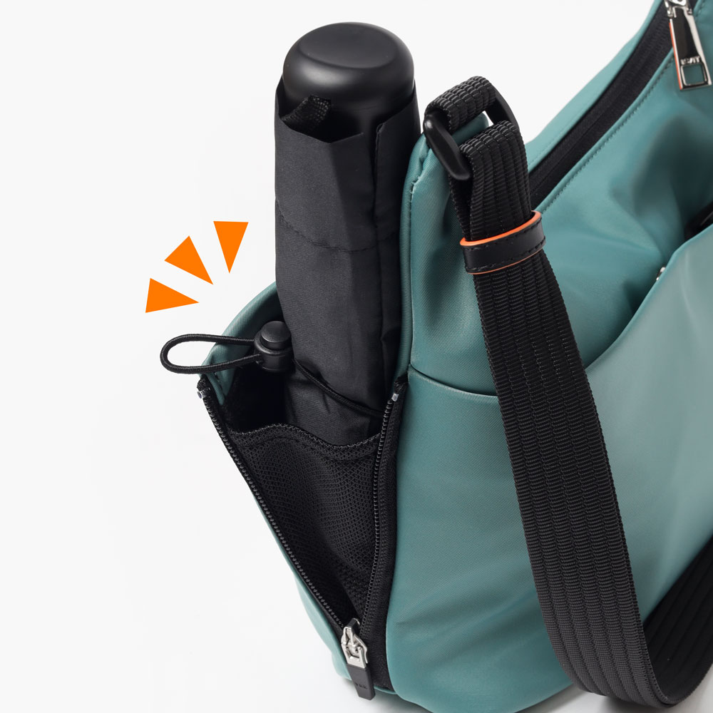 サイドのファスナーポケットは、ファスナーを開くことでマチが広がり、500mlペットボトルもすっきり収納可能。さらにポケット内部のゴムループにより、折り畳み傘などの細いアイテムをしっかり固定し、移動時の落下も防ぎます。