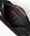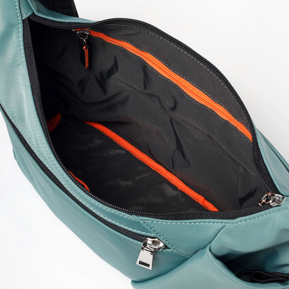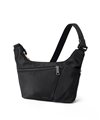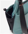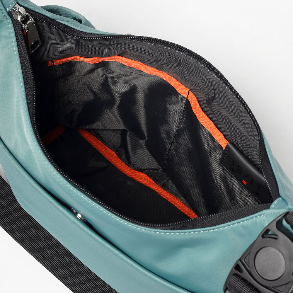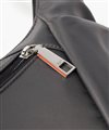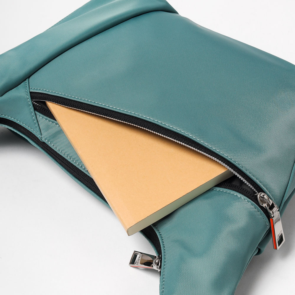 メインルームには、B5サイズのノートやiPadがすっきり収納可能。ファスナーポケットが1つとオープンポケットが2つあり、貴重品や小物類を分けて収納することができます。さらに、前面にはファスナーポケット、背面にはホック付きポケットがあり、スマホやパスケースなど使用頻度の高いアイテムの収納に便利です。また、サイドのファスナーポケットは、ファスナーを開くことでマチが広がり、500mlペットボトルもすっきり収納可能。さらにポケット内部のゴムループにより、折り畳み傘などの細いアイテムをしっかり固定し、移動時の落下も防ぎます。