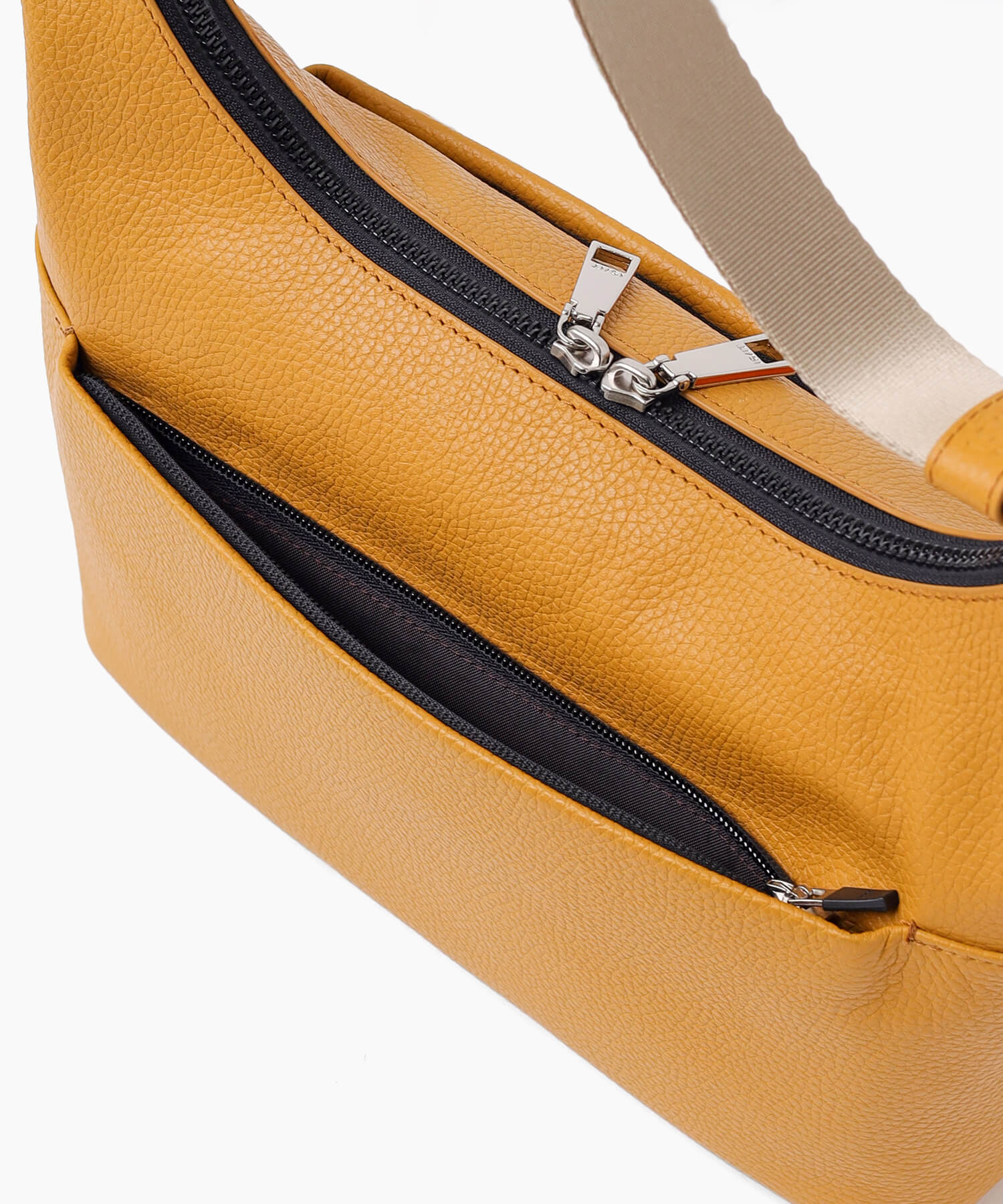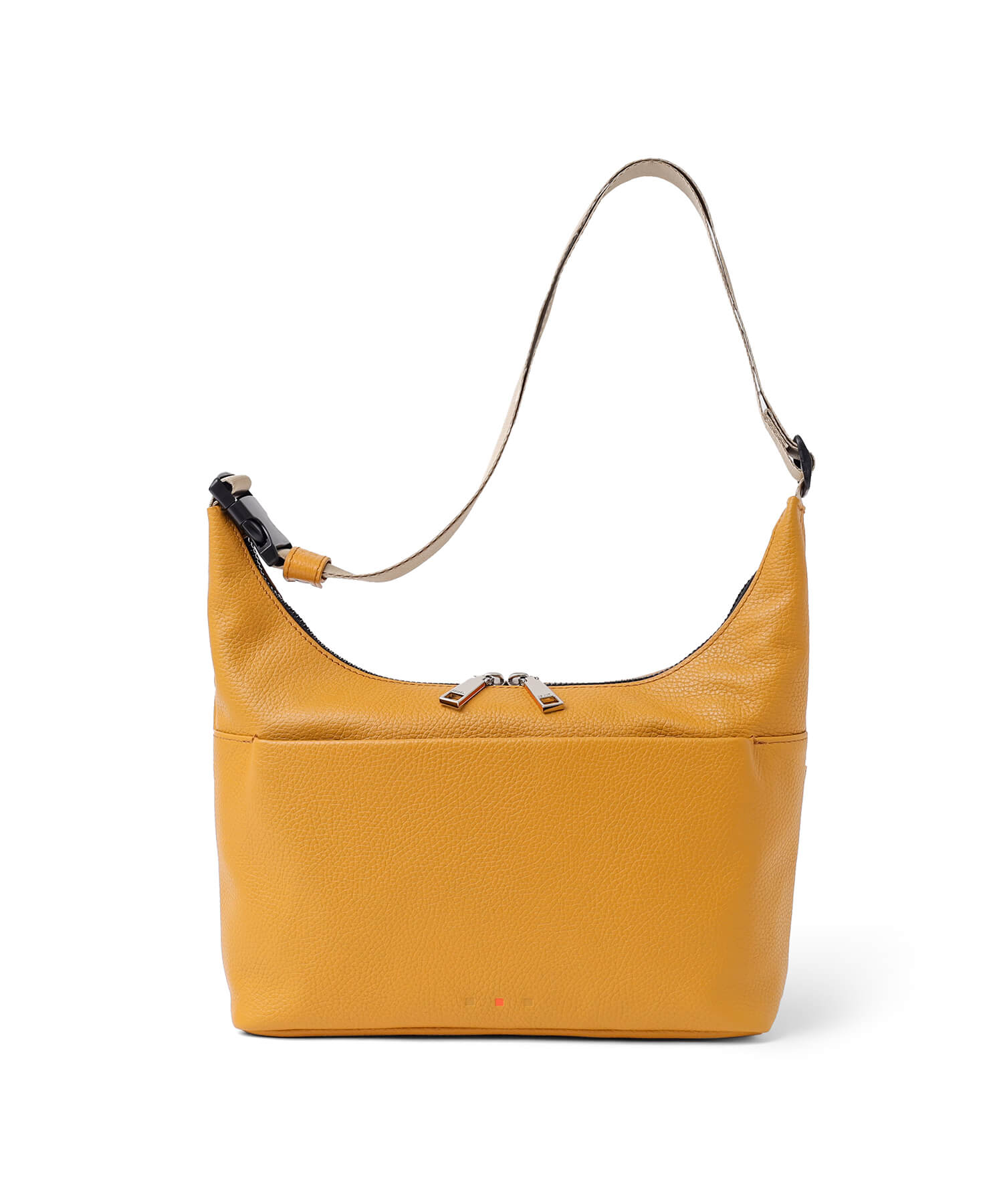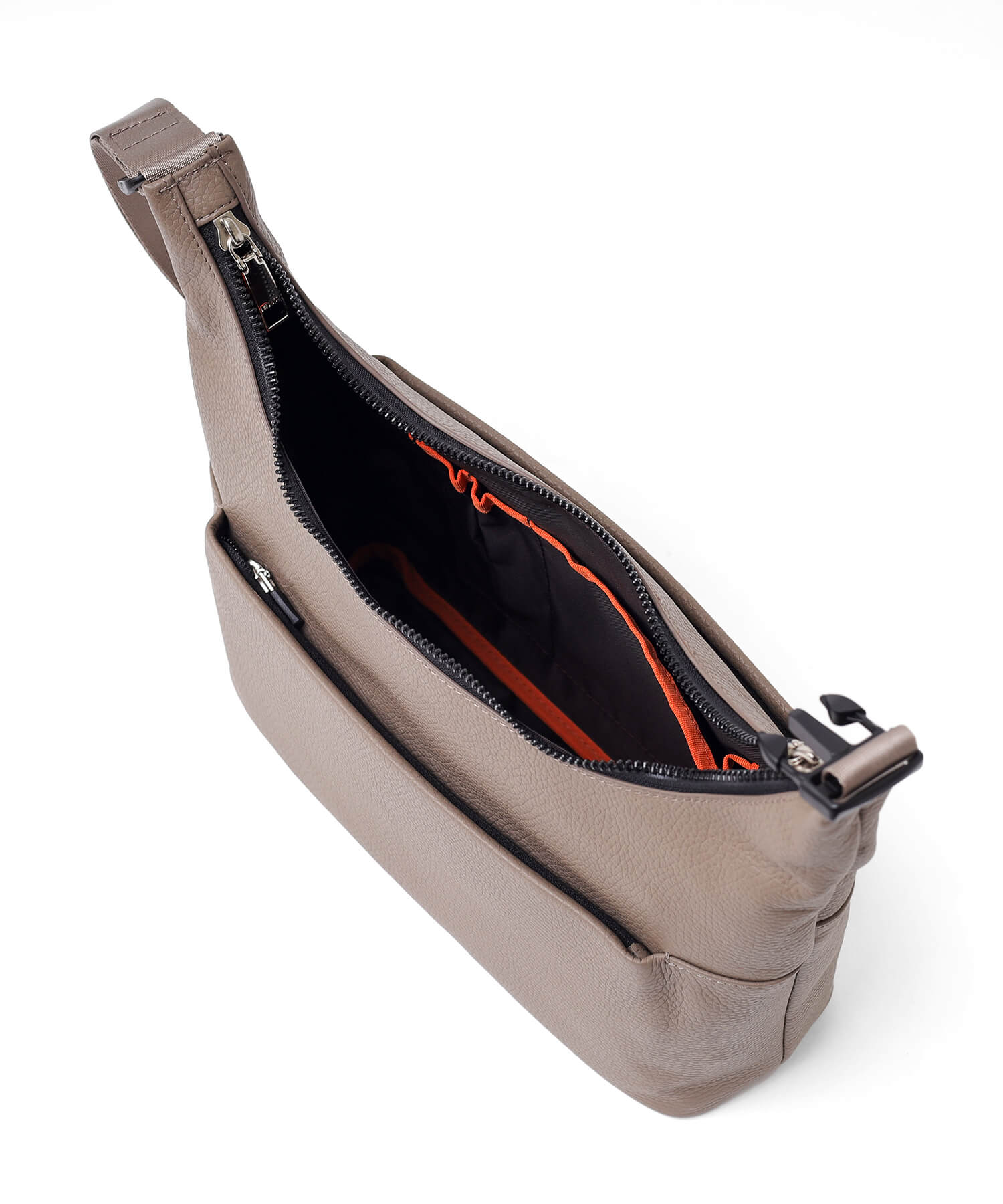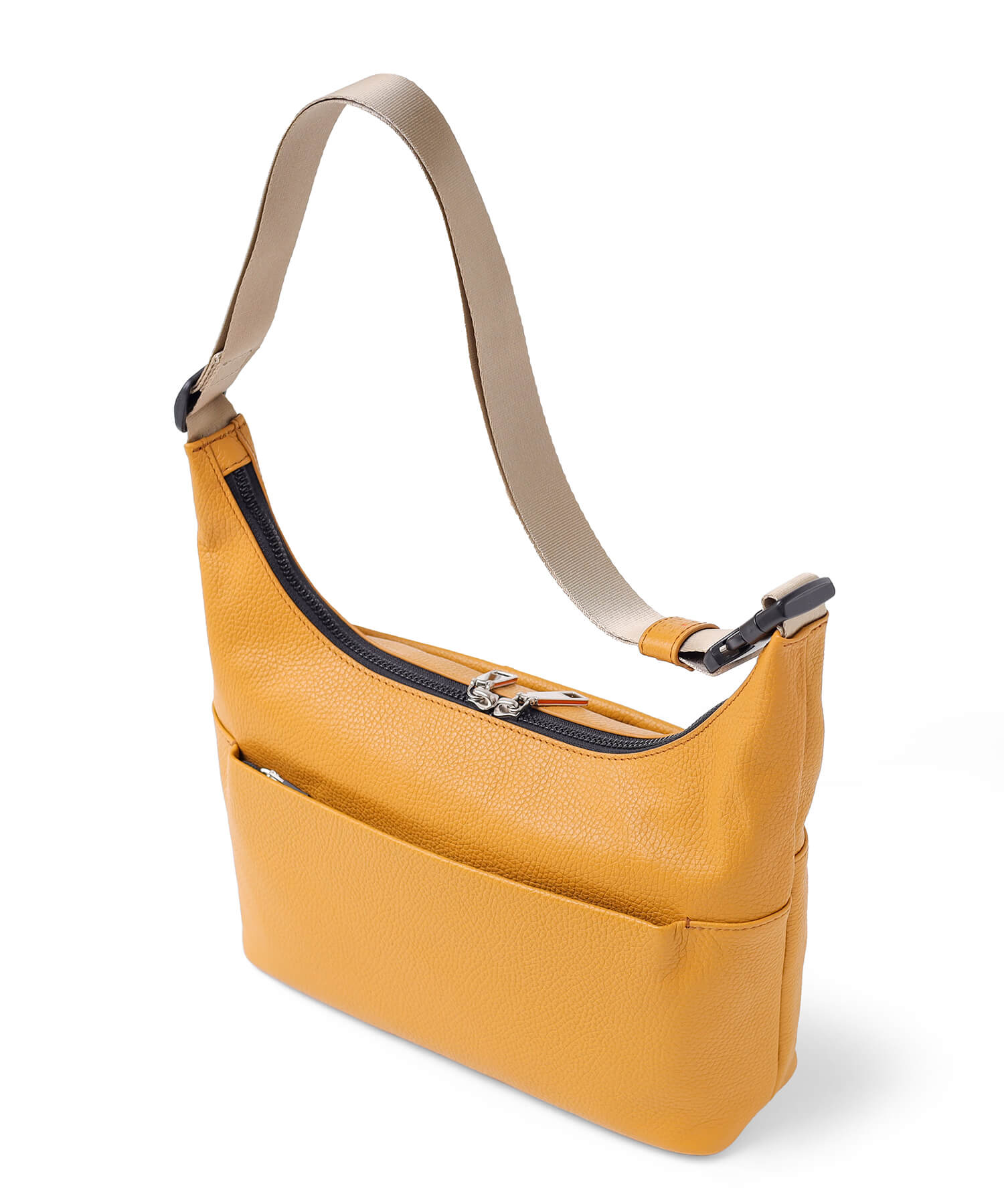 外側には貴重品を安心して収納できるファスナーポケットが両面に備わっており、セキュリティ面にも配慮されています。さらに、ポケットは横幅いっぱいのサイズで設計されており、前面には長財布がぴったり収納でき、背面にはスマートフォンなどを便利に収納できます。これにより、貴重品をすばやく取り出せるだけでなく、収納物を整理しておくことができるため、日常使いに非常に便利です。