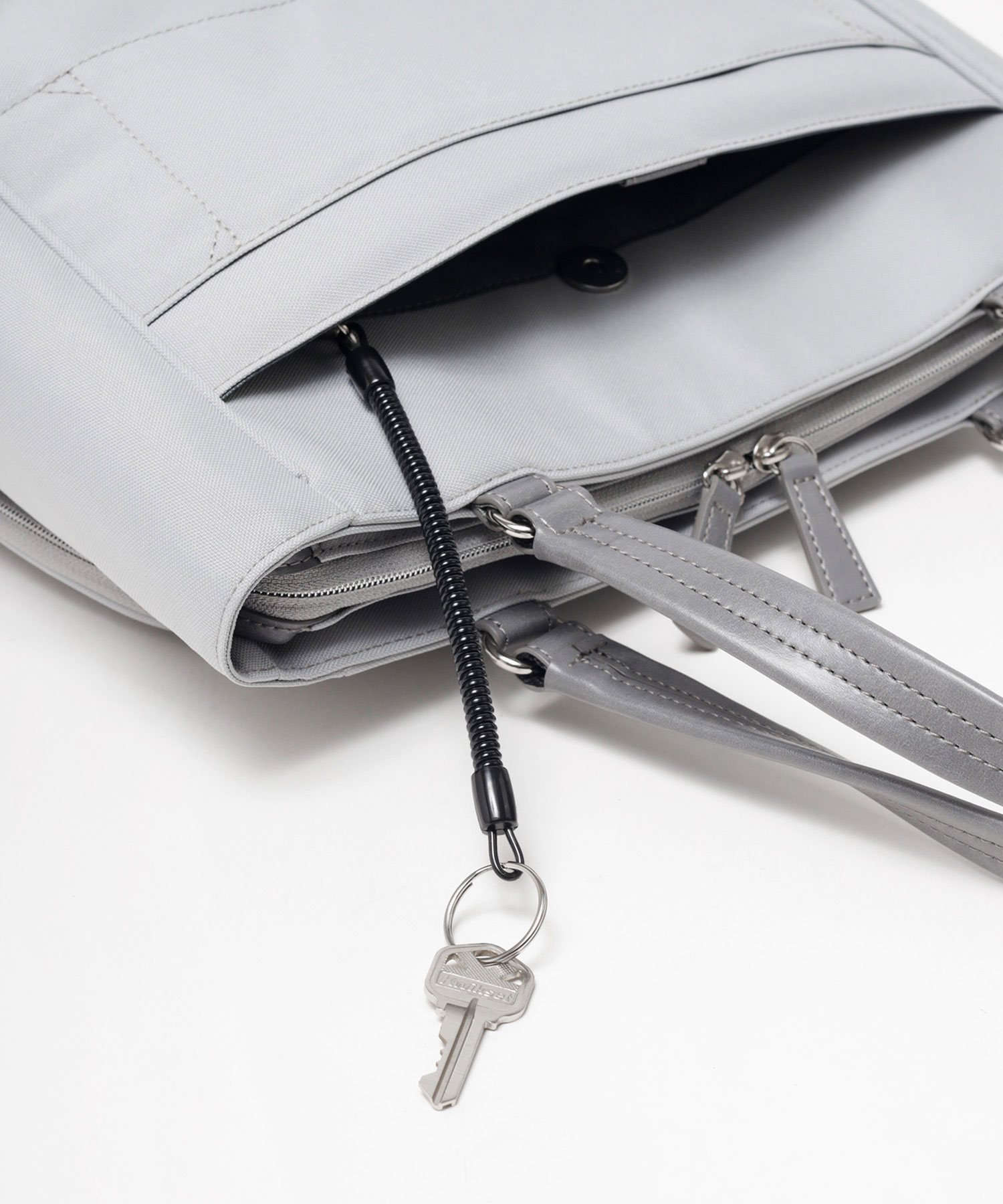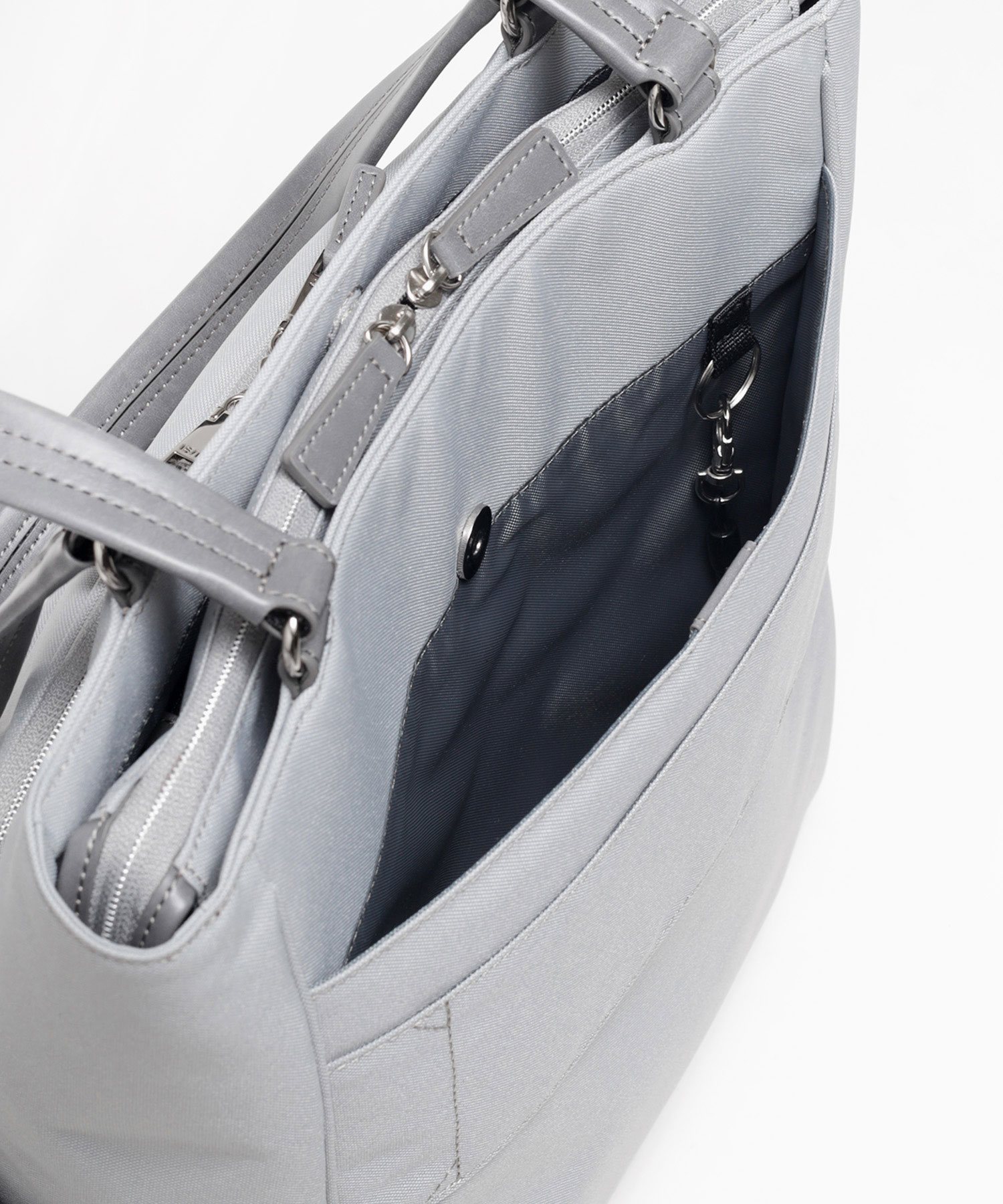 背面には出張時に便利な、キャリーバーへの取り付けが可能なセットアップポケットが装備されています。また、マグホック付きポケットの内側には取り外し可能なバネ式キーリングが付いています。