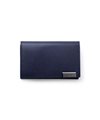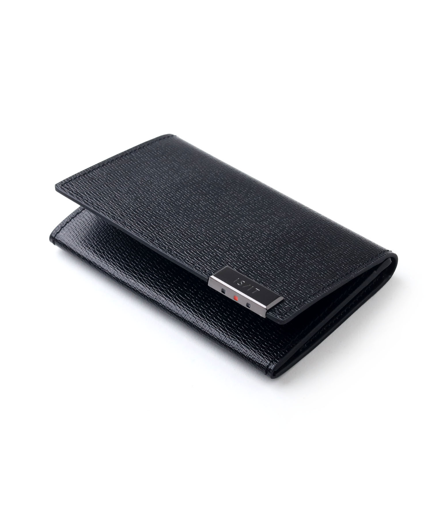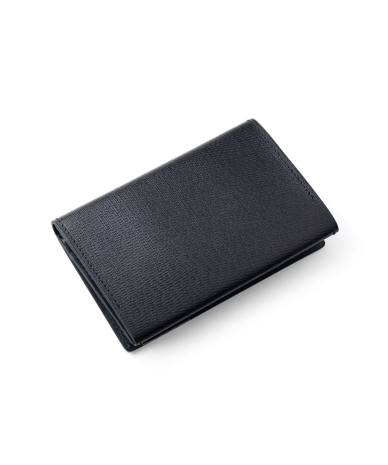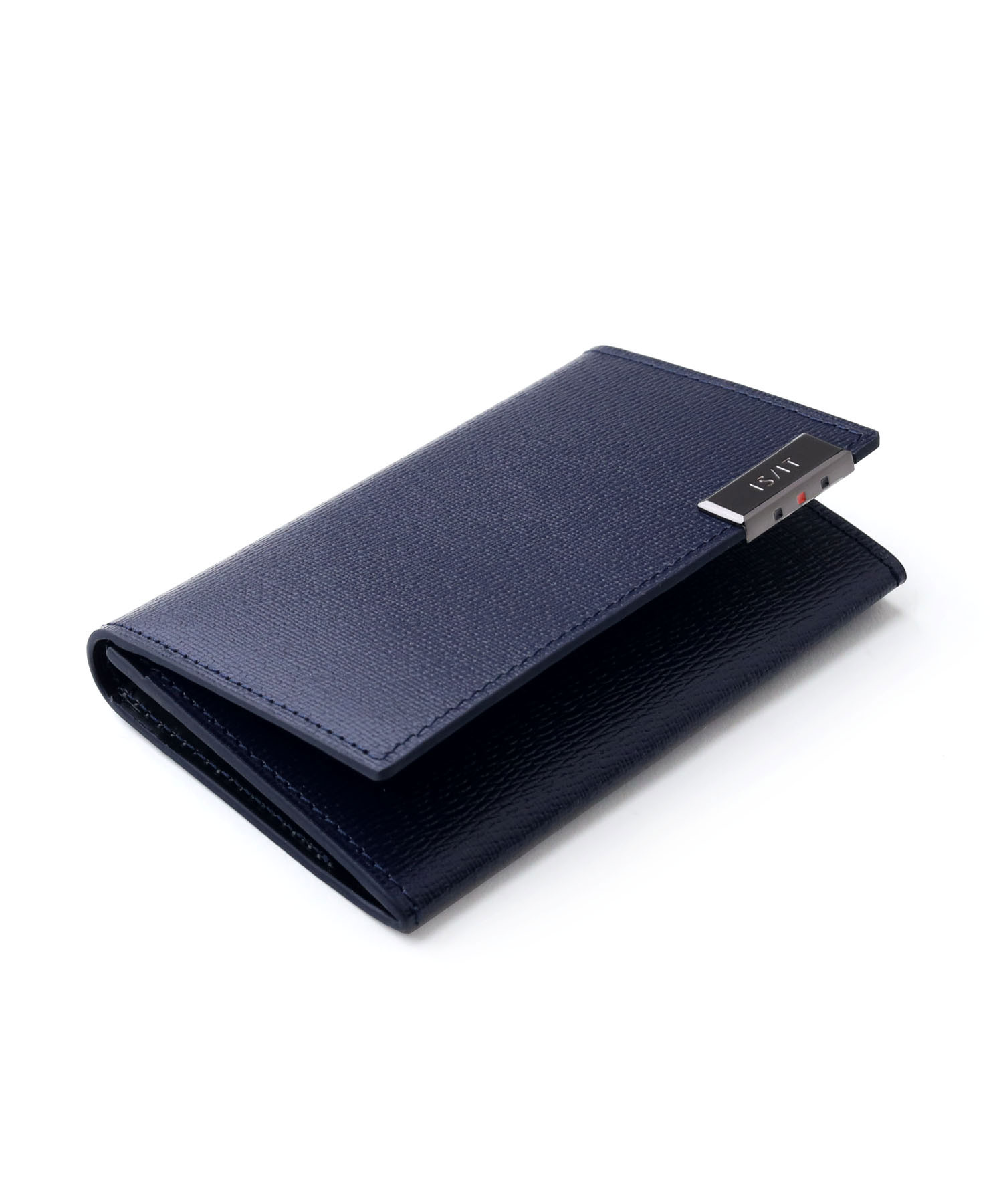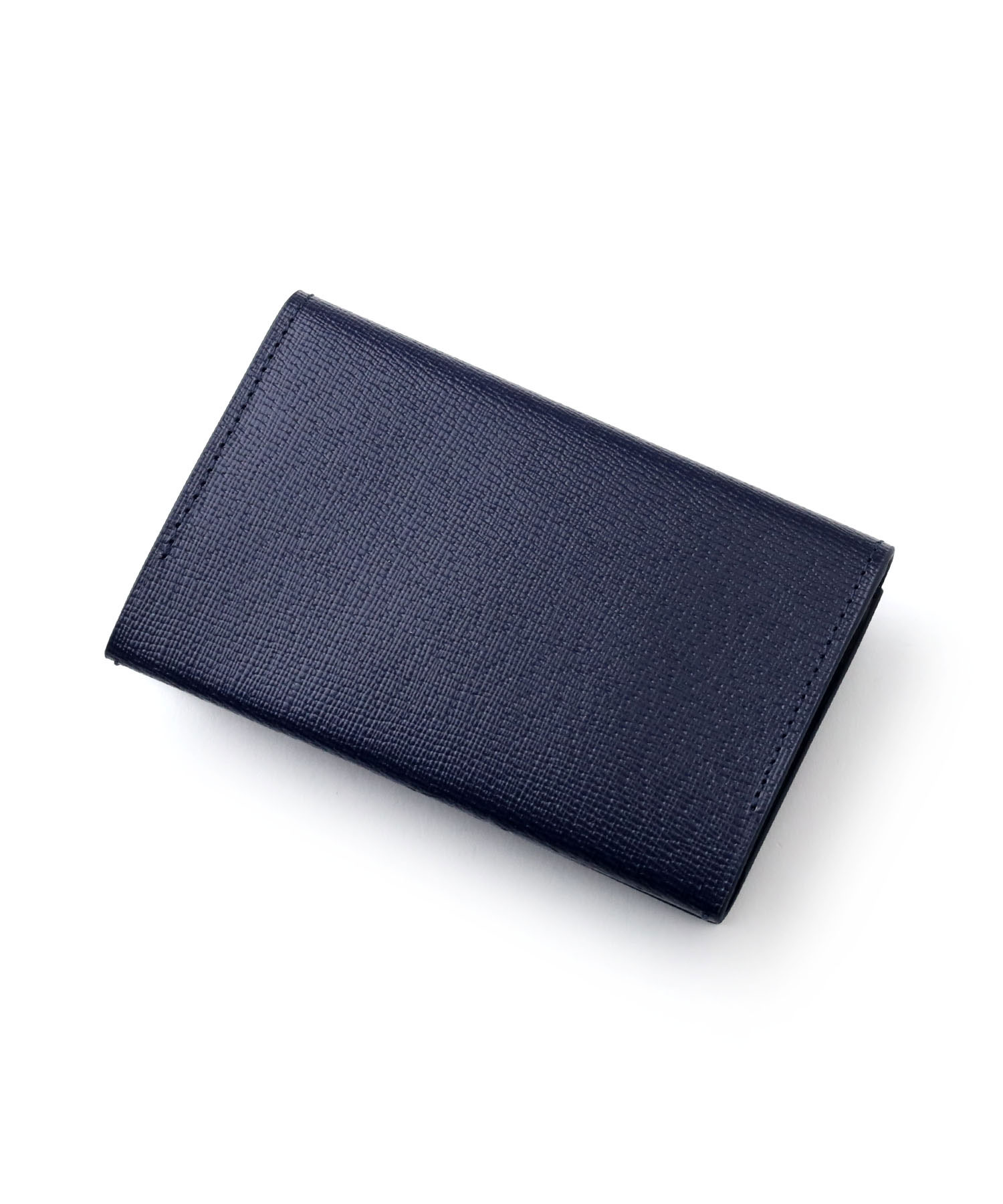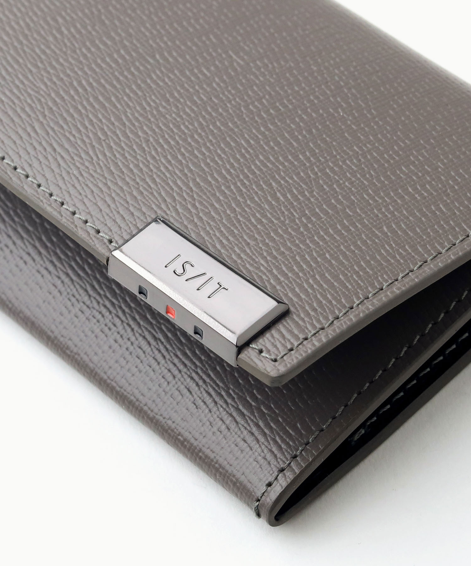 輝くメタルブローチがアクセントの、シンプルで高級感あふれるイズイットの名刺入れ。ほどよい艶感が美しい型押しレザーを使用し、切り目仕上げでシャープな印象を演出しています。上品に輝くメタルブローチの側面には、ブランドを象徴する3ドットのアイコンをさりげなく配置し、細部までこだわったデザインに。大切な名刺をスマートに収納できます。