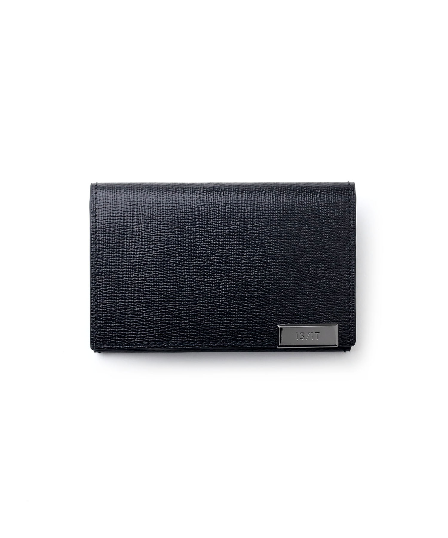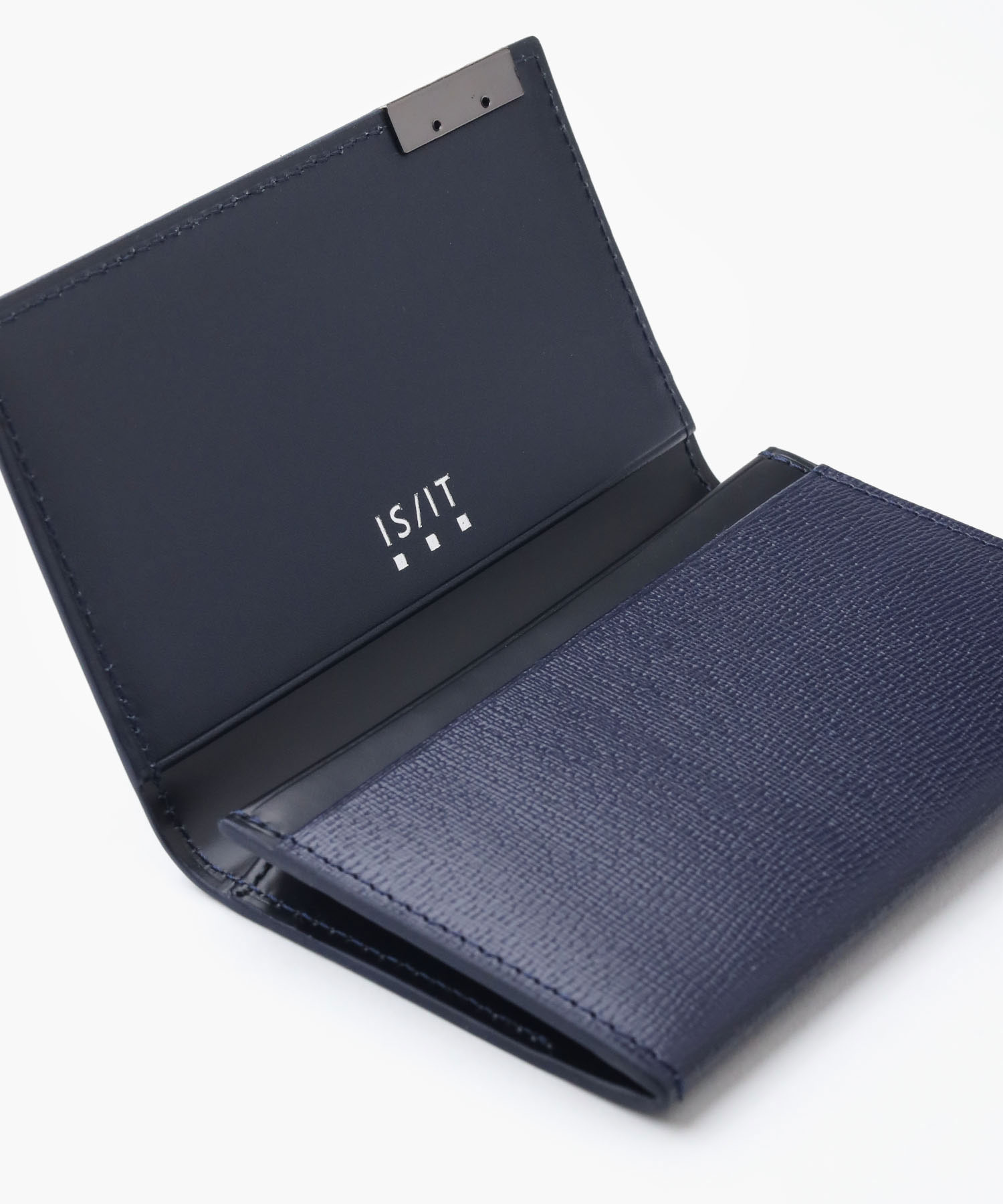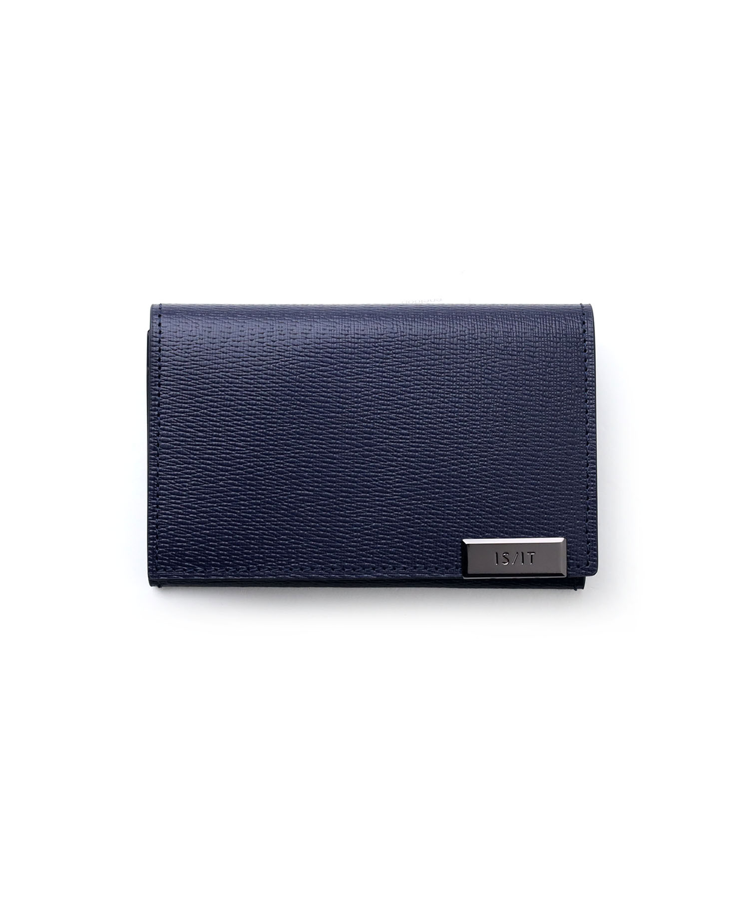 輝くメタルブローチがアクセントの、シンプルで高級感あふれるイズイットの名刺入れ。ほどよい艶感の型押しレザーを使用し、洗練されたデザインに仕上げています。