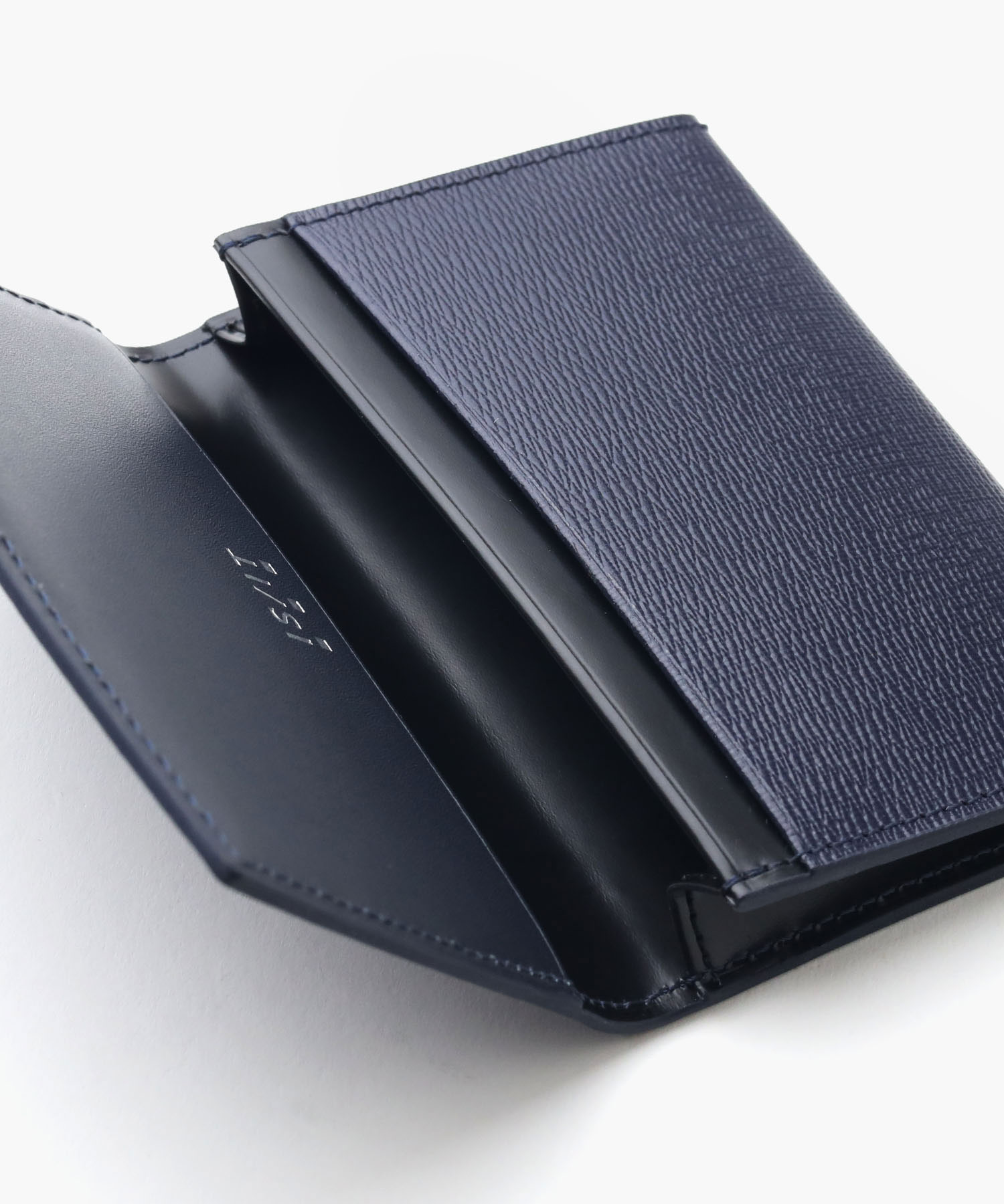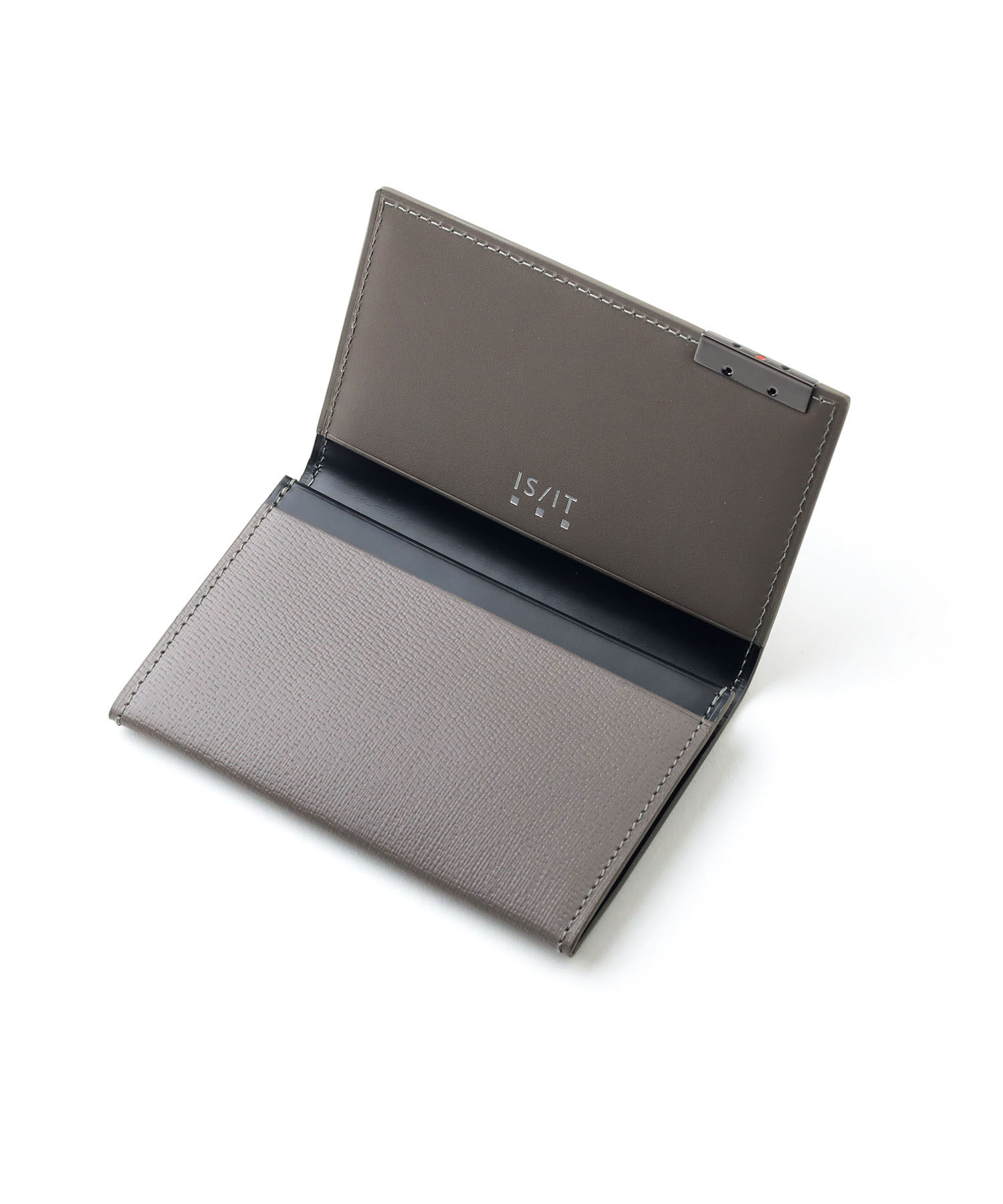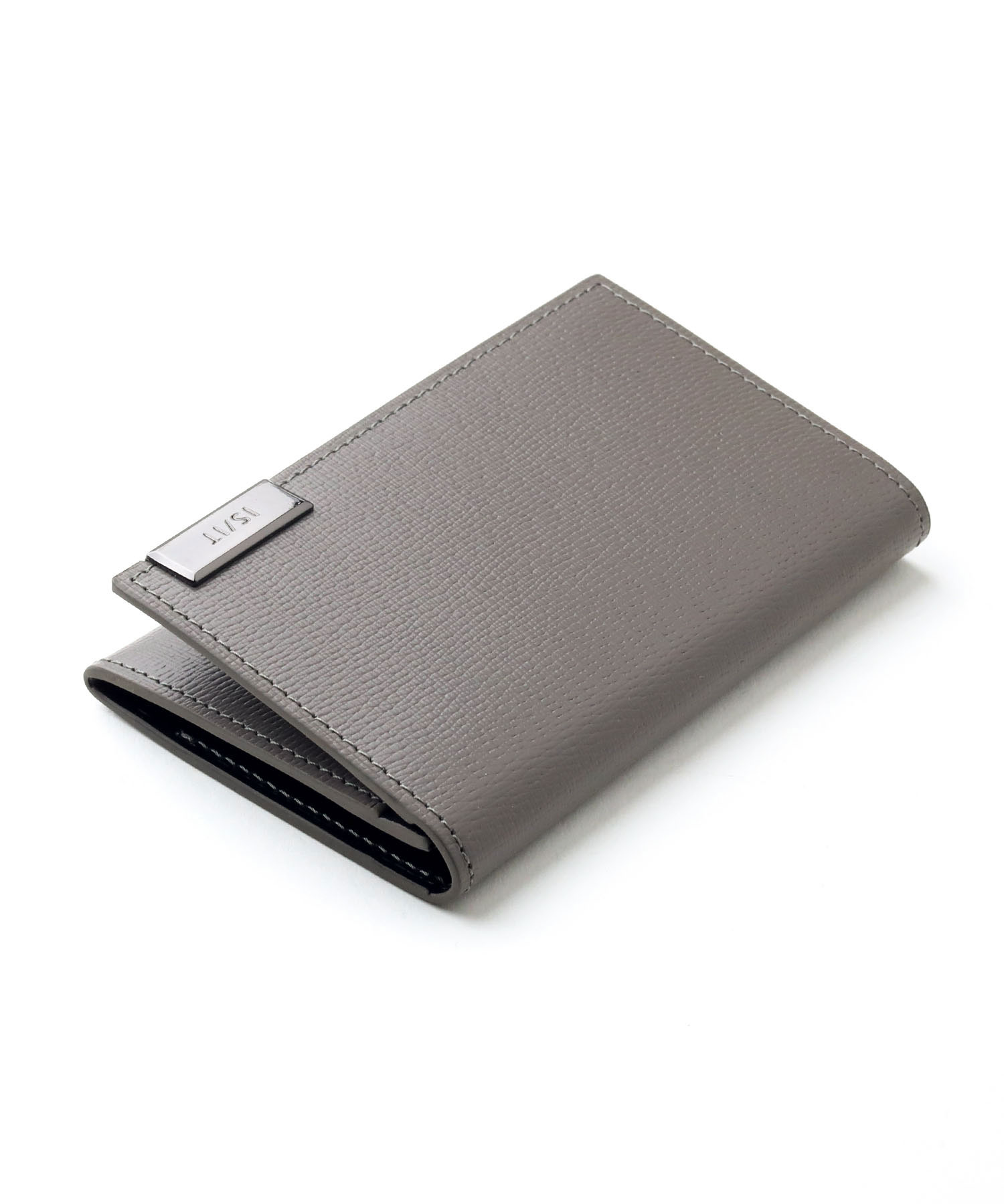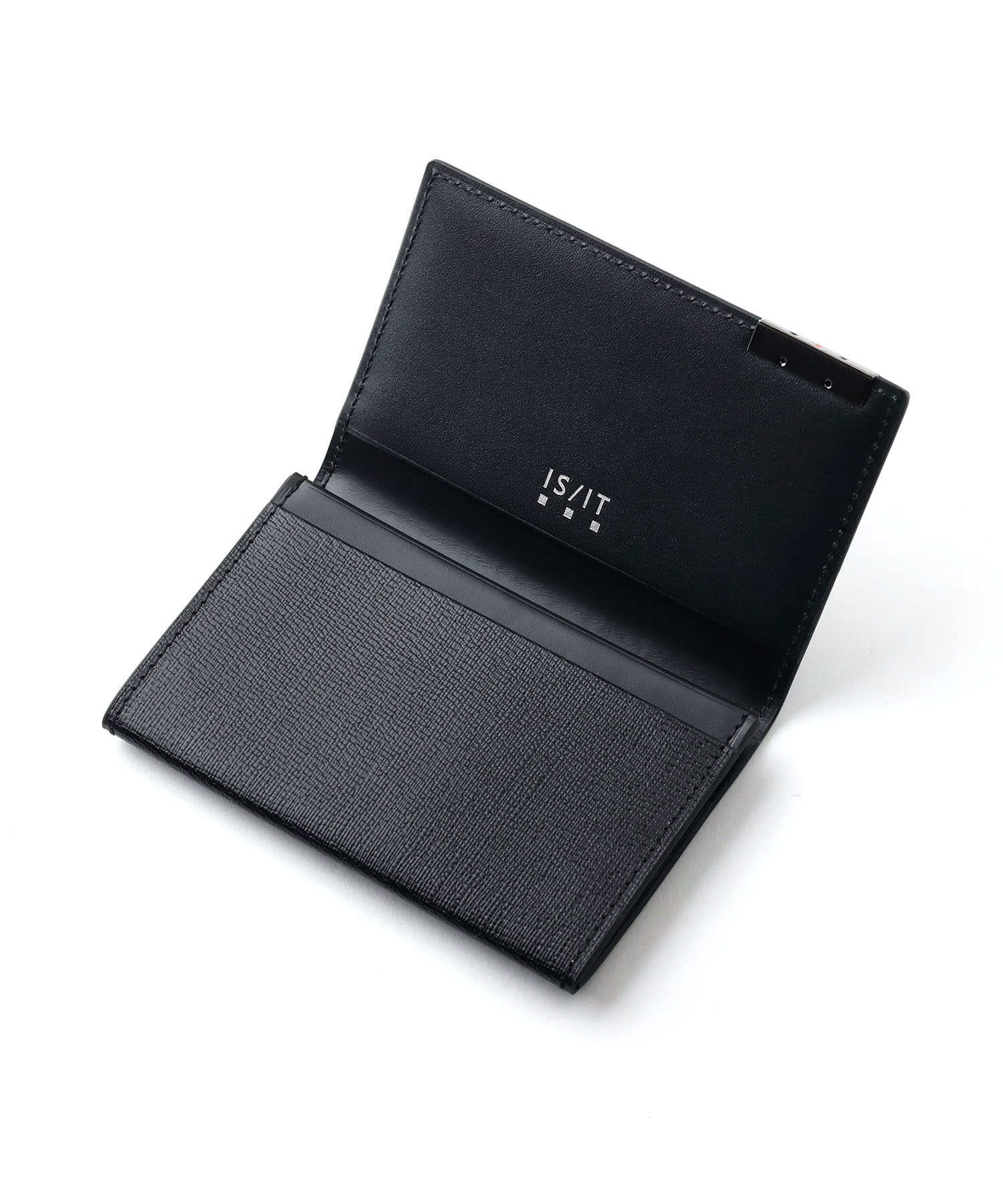 輝くメタルブローチがアクセントの、シンプルで高級感あふれるイズイットの名刺入れ。ほどよい艶感の型押しレザーを使用し、洗練されたデザインに仕上げています。