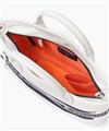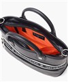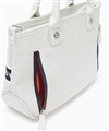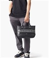 B5ファイルが収納可能なサイズ感のミニトートバッグ。メインルーム内には、ファスナーポケットが1つ、オープンポケットが2つ、ペットボトルホルダーが装備されています。バッグの前面にはファスナーポケットが2つあります。背面には縦にファスナーポケットが2つ配置されており、それぞれが異なる機能を持っています。一つはペットボトルホルダーに接続されており、もう一つはメインルームに接続されています。この構造により、メインファスナーを開けずに必要なアイテムをすぐに取り出すことができ、利便性が抜群です。