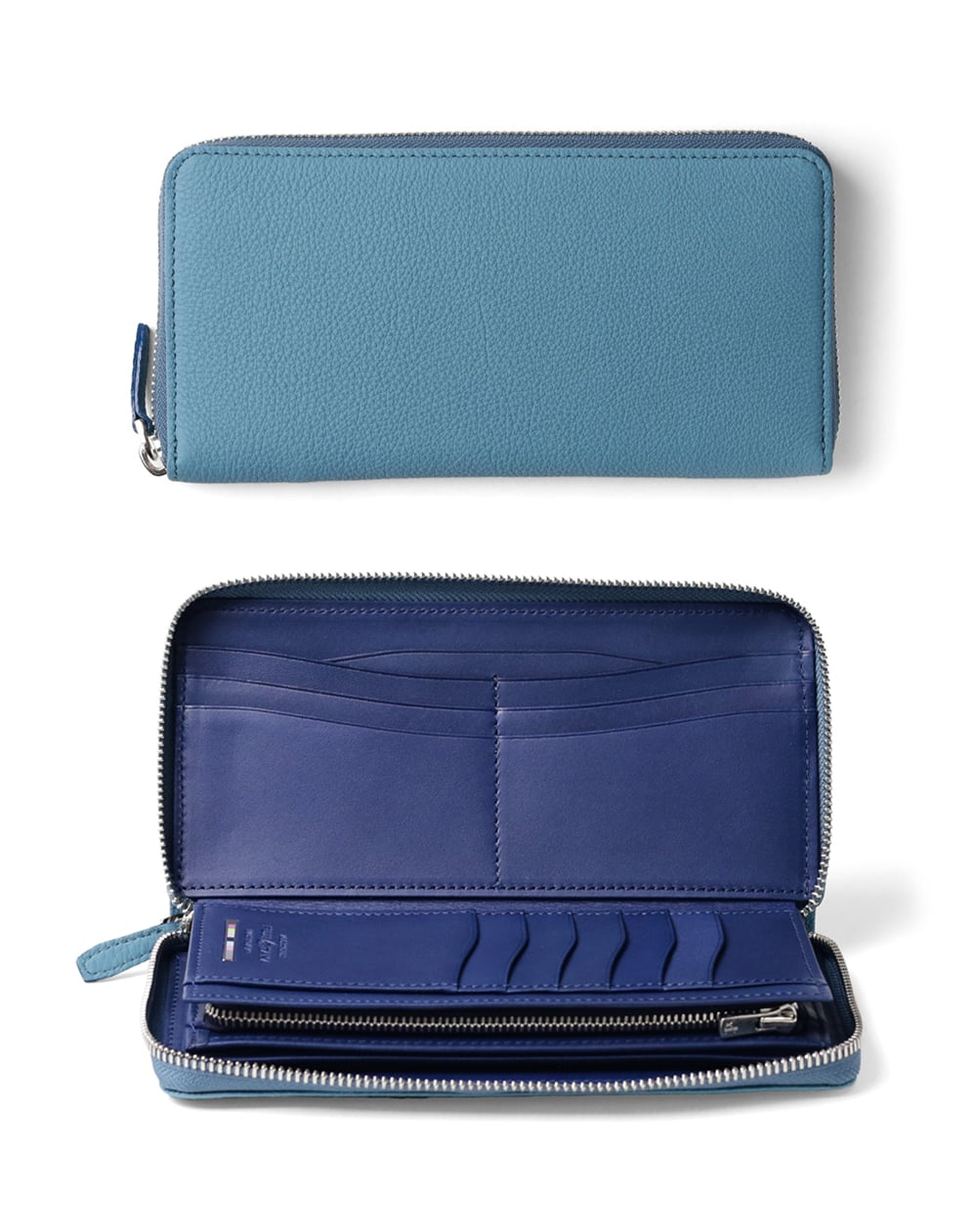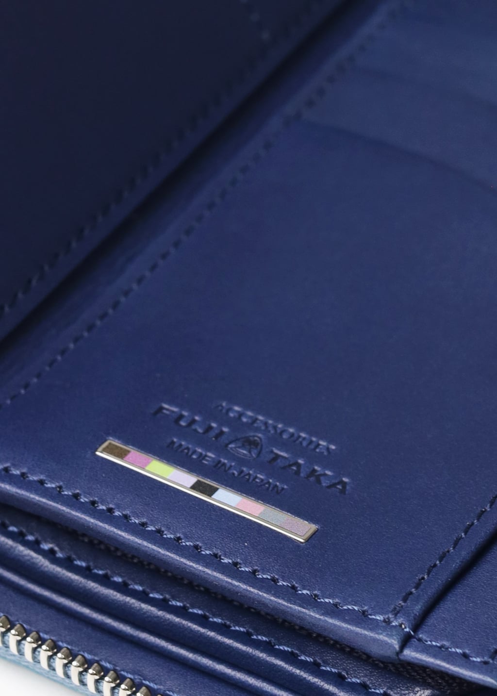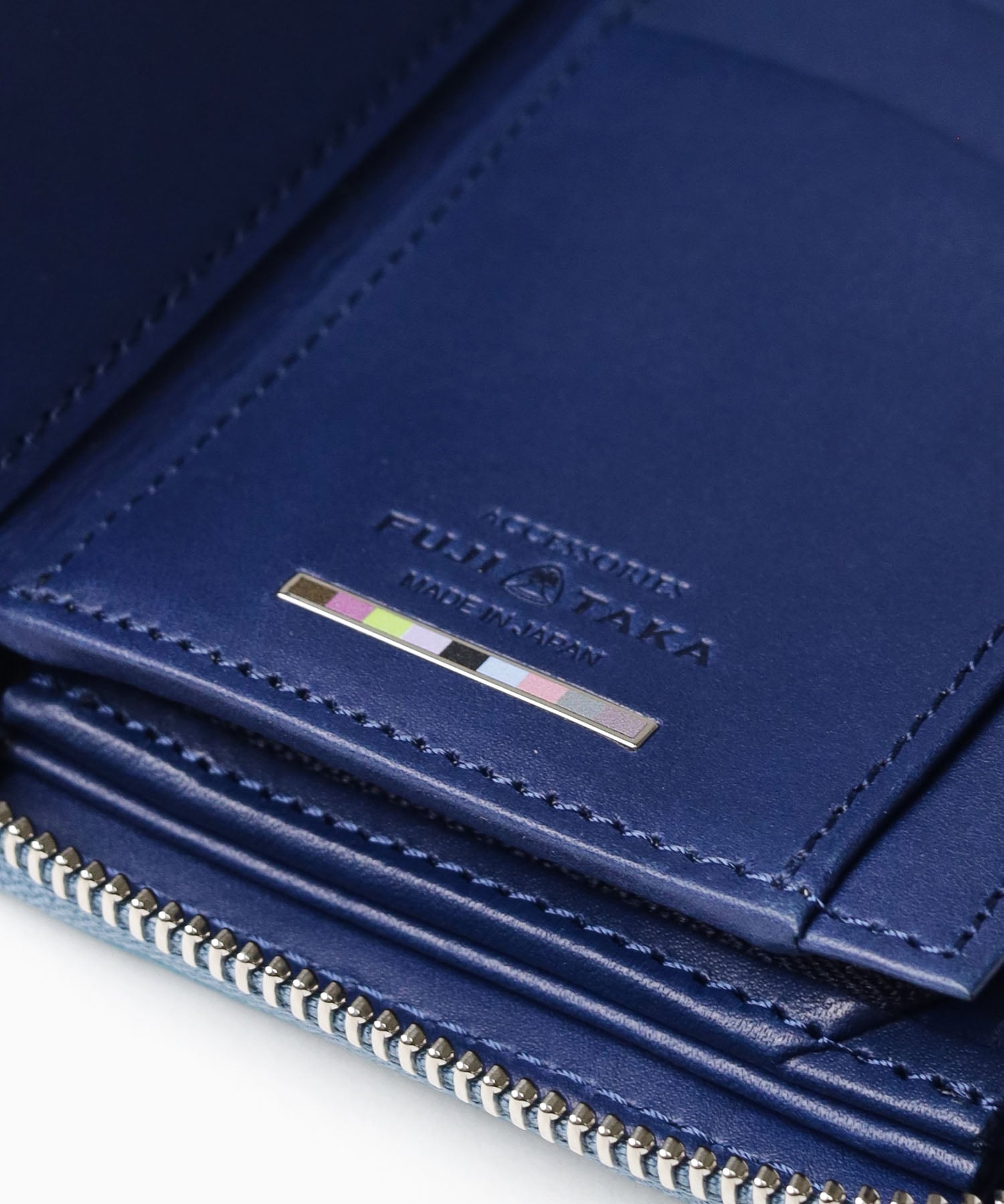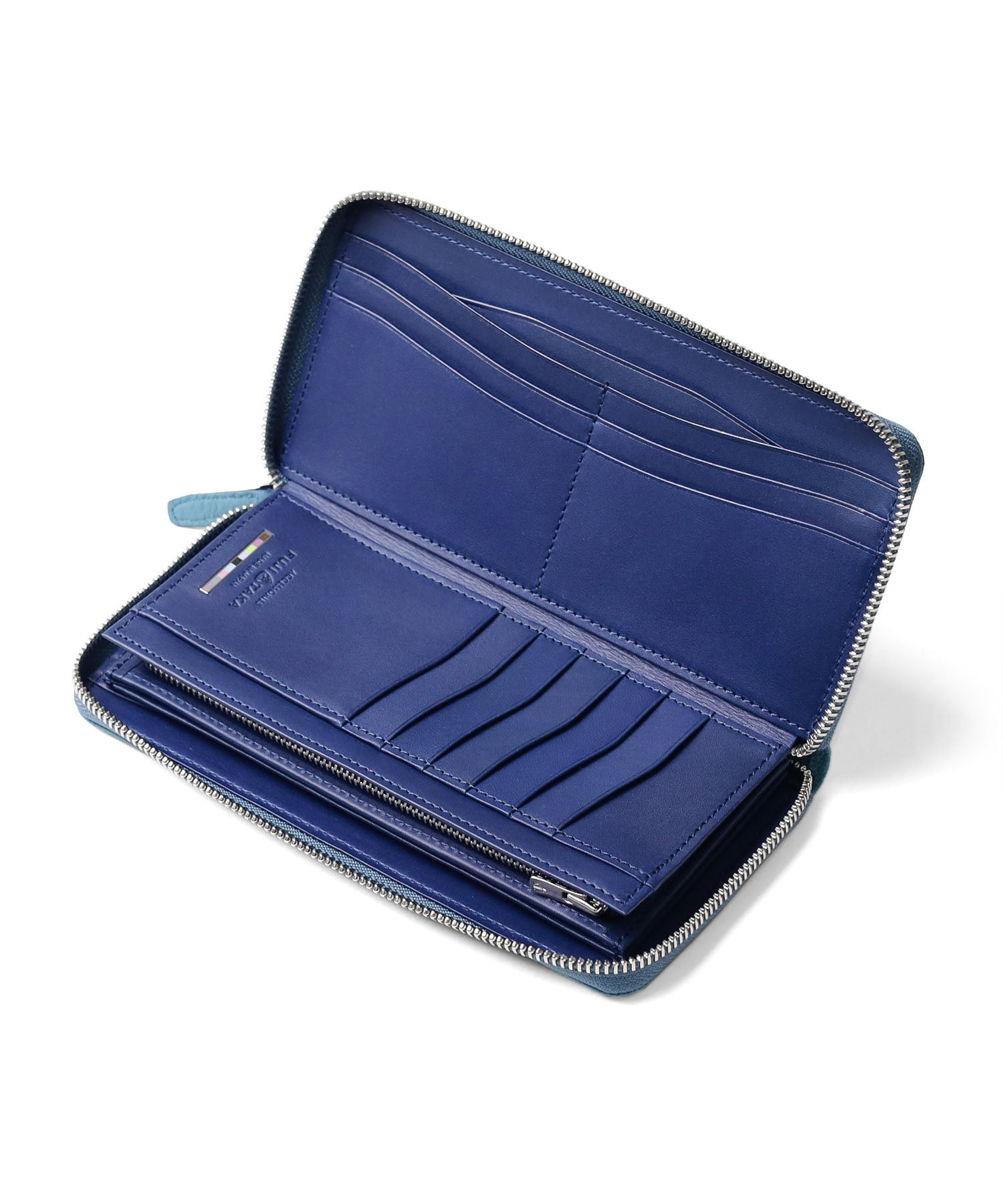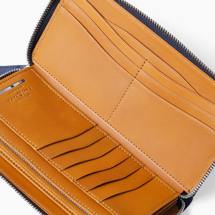 フランス、デュプイ社のカーフレザーを使用したフジタカアクセサリーズのラウンドファスナー仕様の長財布。内側には国産ヌメ革を使用、フジタカのイメージカラーをバー金具で表現。日本独特の優しい色合いがお手元をさりげなく彩ります。