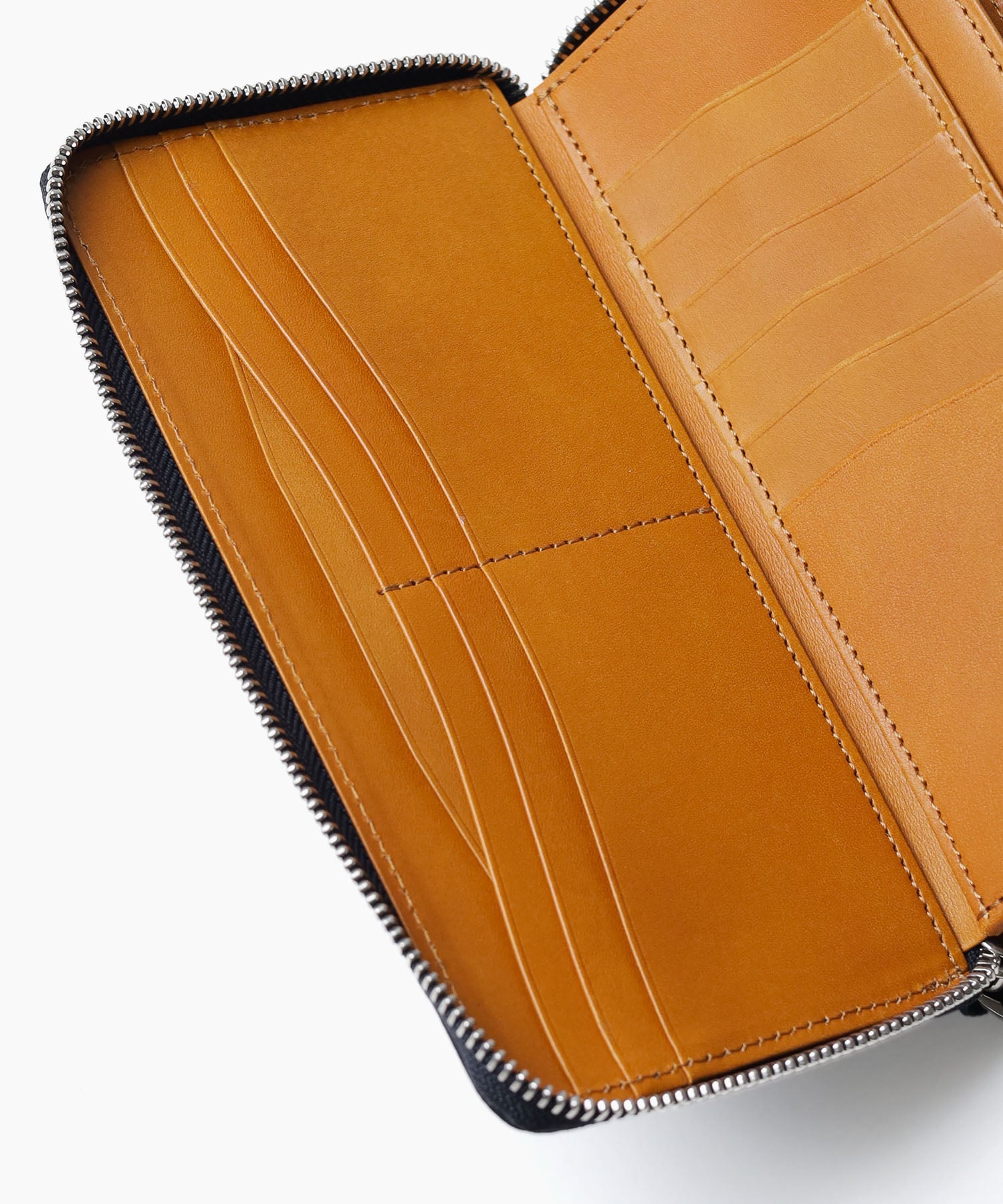 内装には国産ヌメ革を使用しています。ロゴ押しやネン引き等が美しく表現でき、経年変化がお楽しみ頂ける素材です。また富士山をイメージしたカード段の形状もさりげなく手元を演出します。