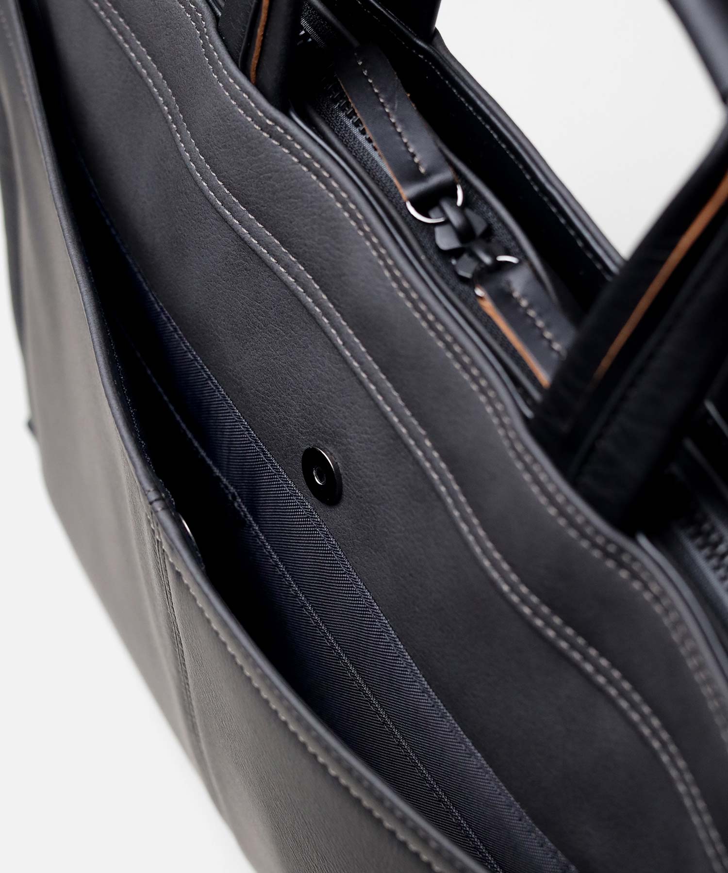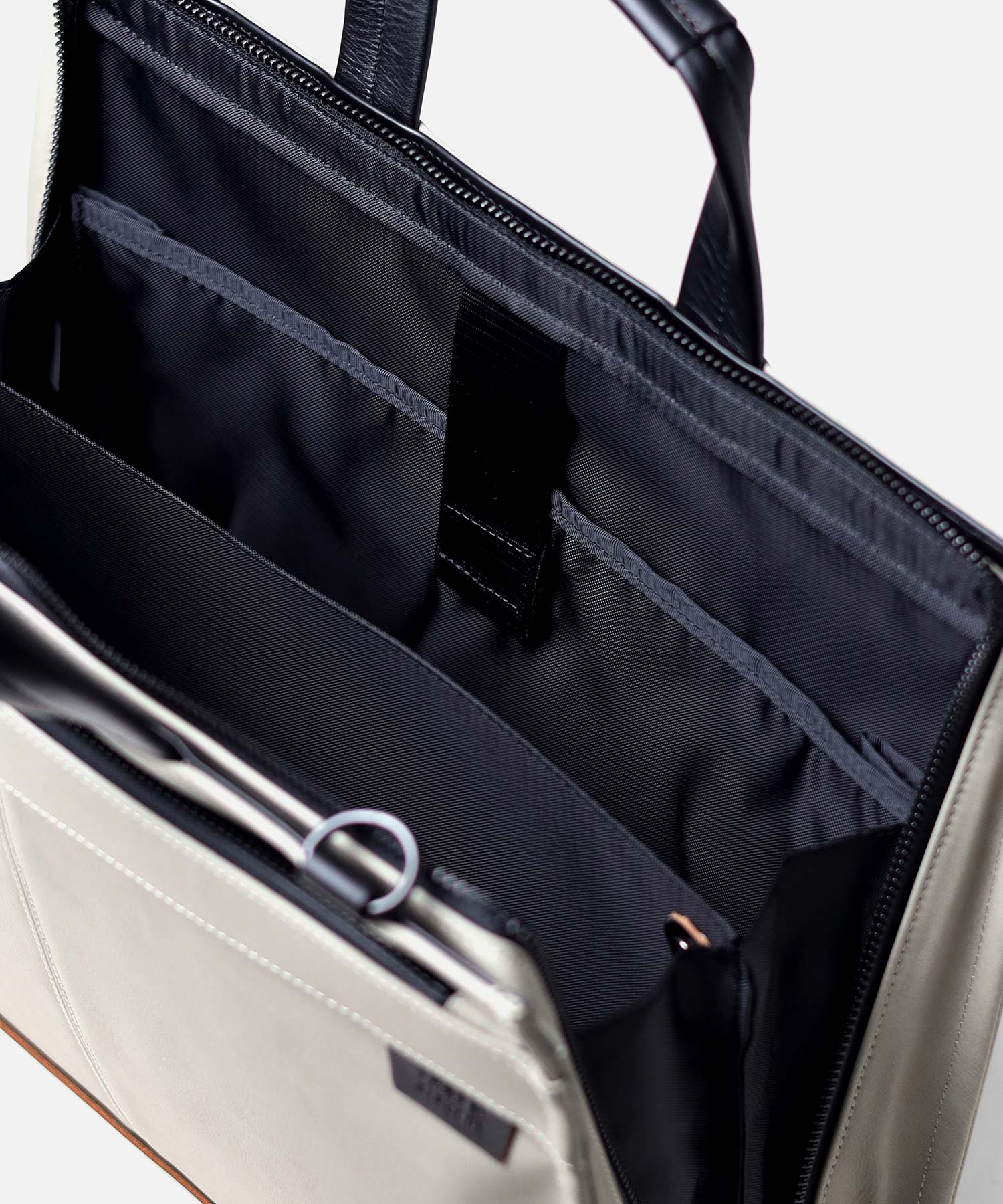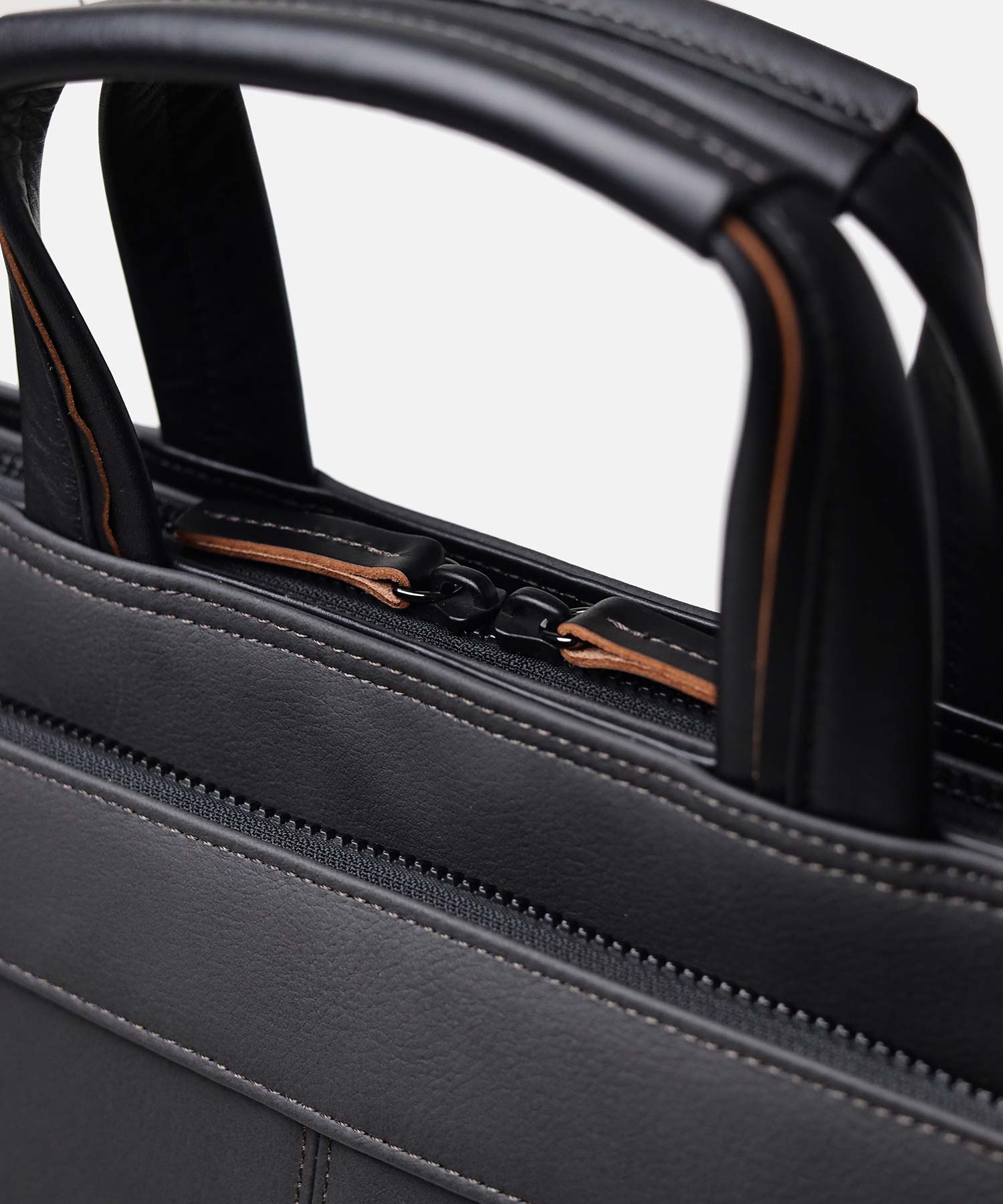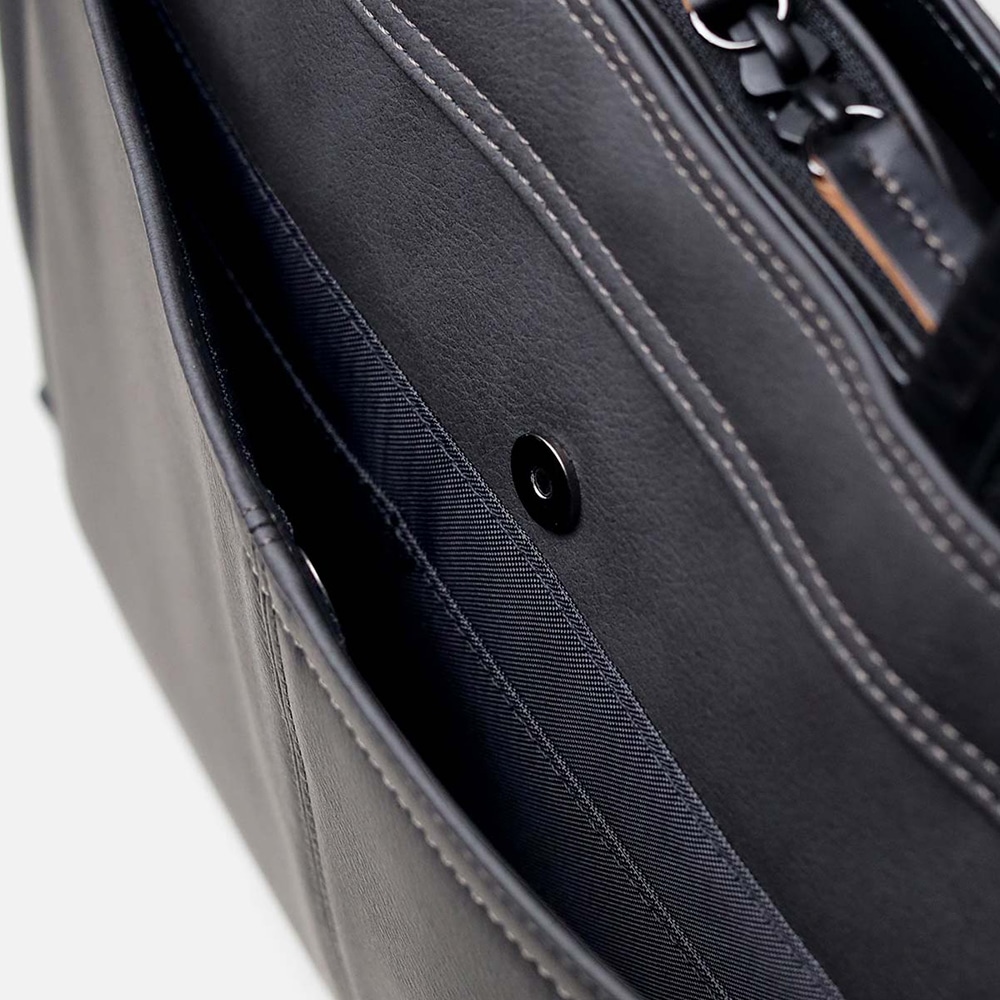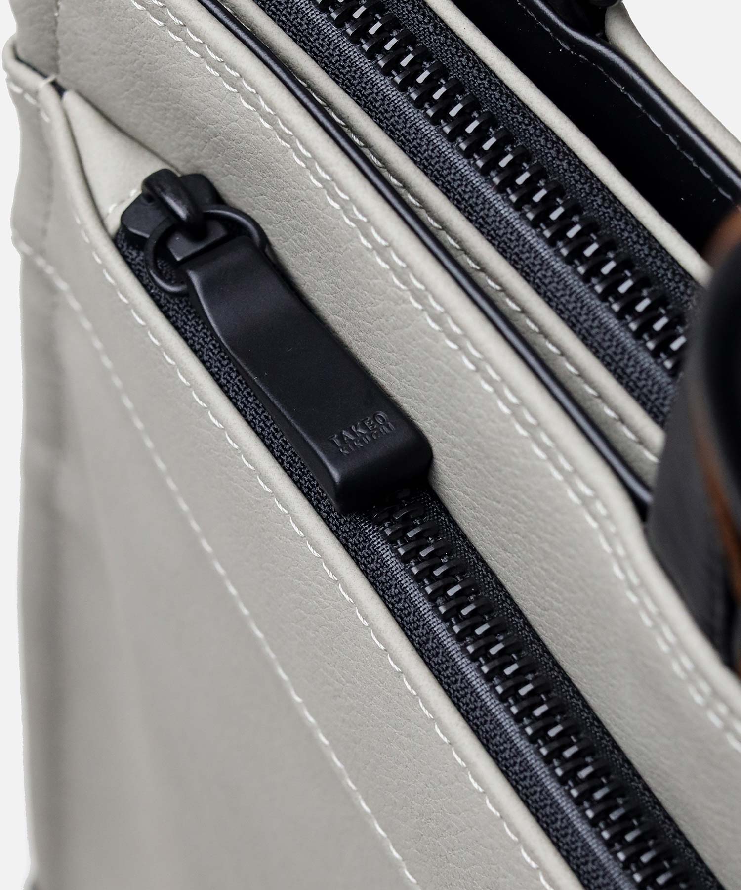 ナチュラルな革の切り目がアクセントの、高スペック合成皮革を用いたタケオキクチの軽量B4ビジネスバッグ。ソフトな風合いながらもしっかりと自立し、内装にも機能性を充実させています。