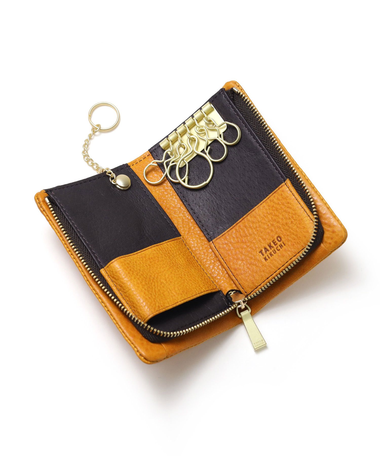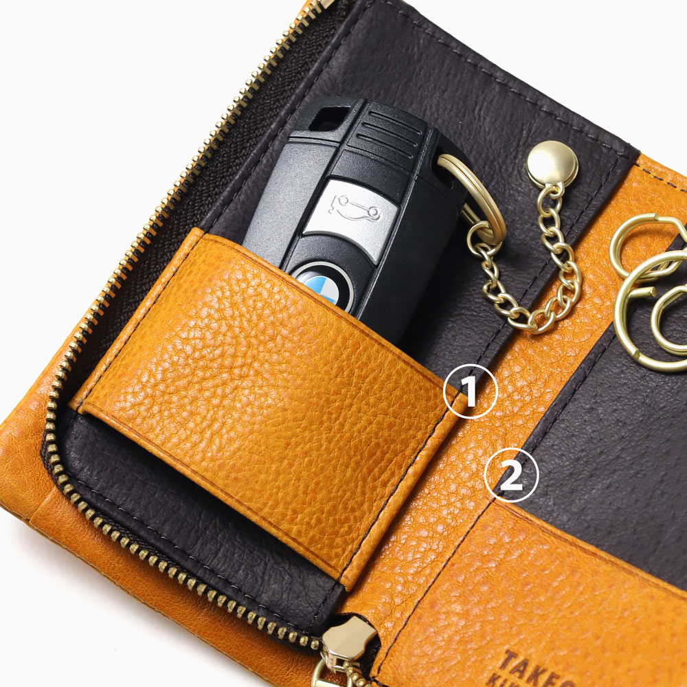 カラフルで質感の良いイタリアンレザーを使用した、タケオキクチのカジュアルなキーケース。袋縫いのふっくらとしたボリューム感が魅力です。スマートキーの収納に対応しており、鍵だけでなくカードの収納も可能です。