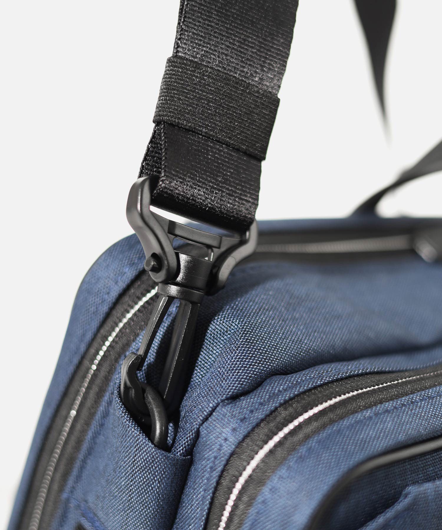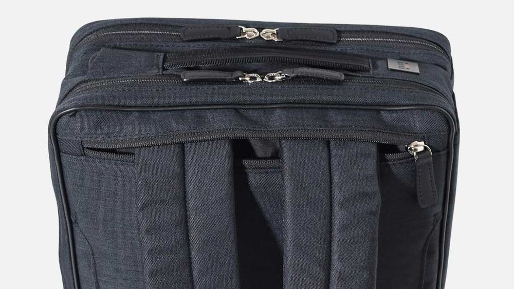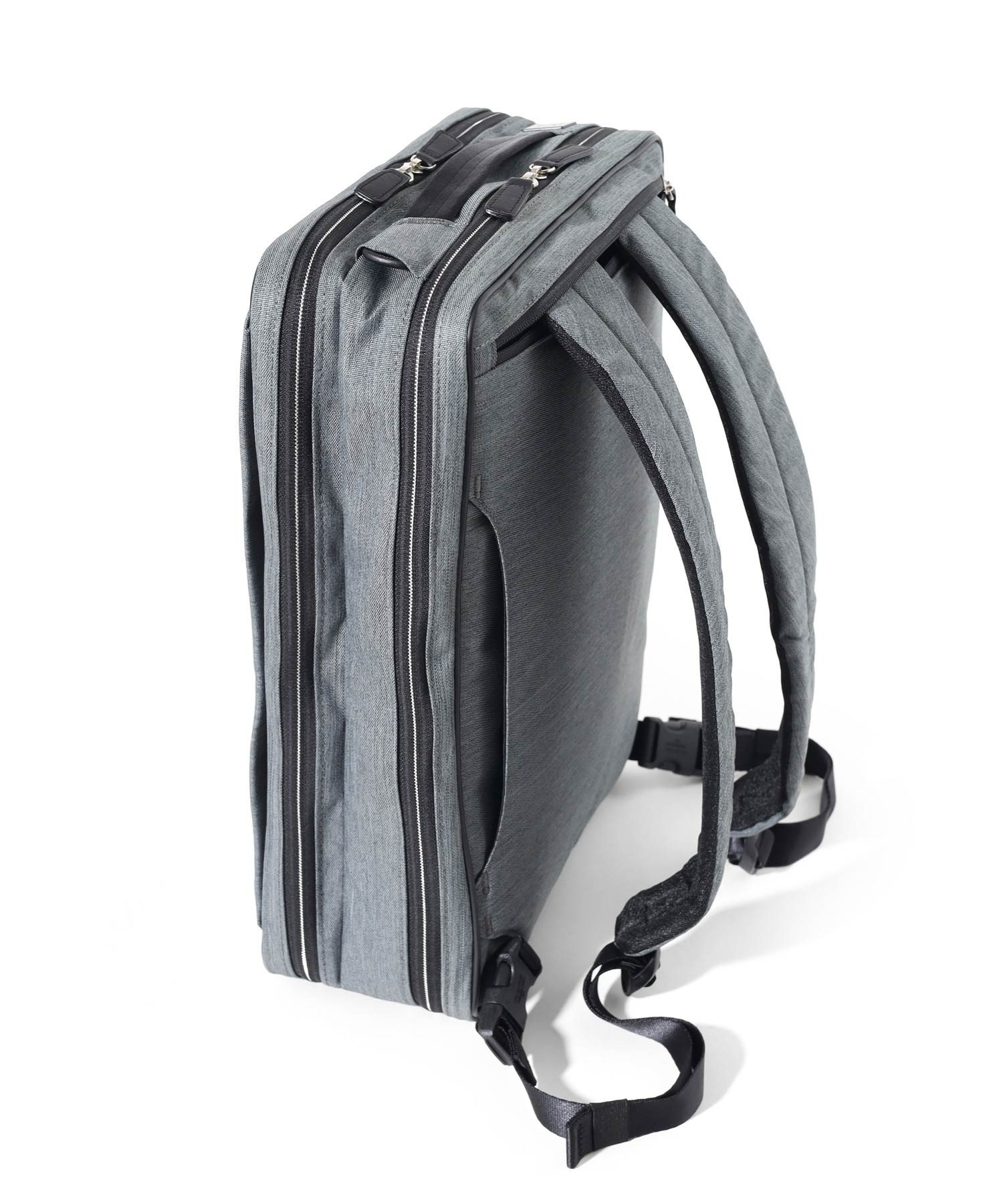 バックル部分は普段使いする際は見えないように収まります。また、手持ちハンドルも前後の収納スペースに完全に入れておくことができるため、リュックを背負っている時や、カバンを斜め掛けにする時にも邪魔になりません。